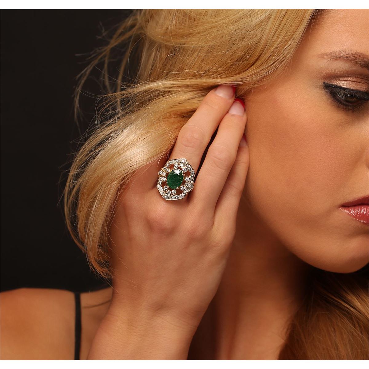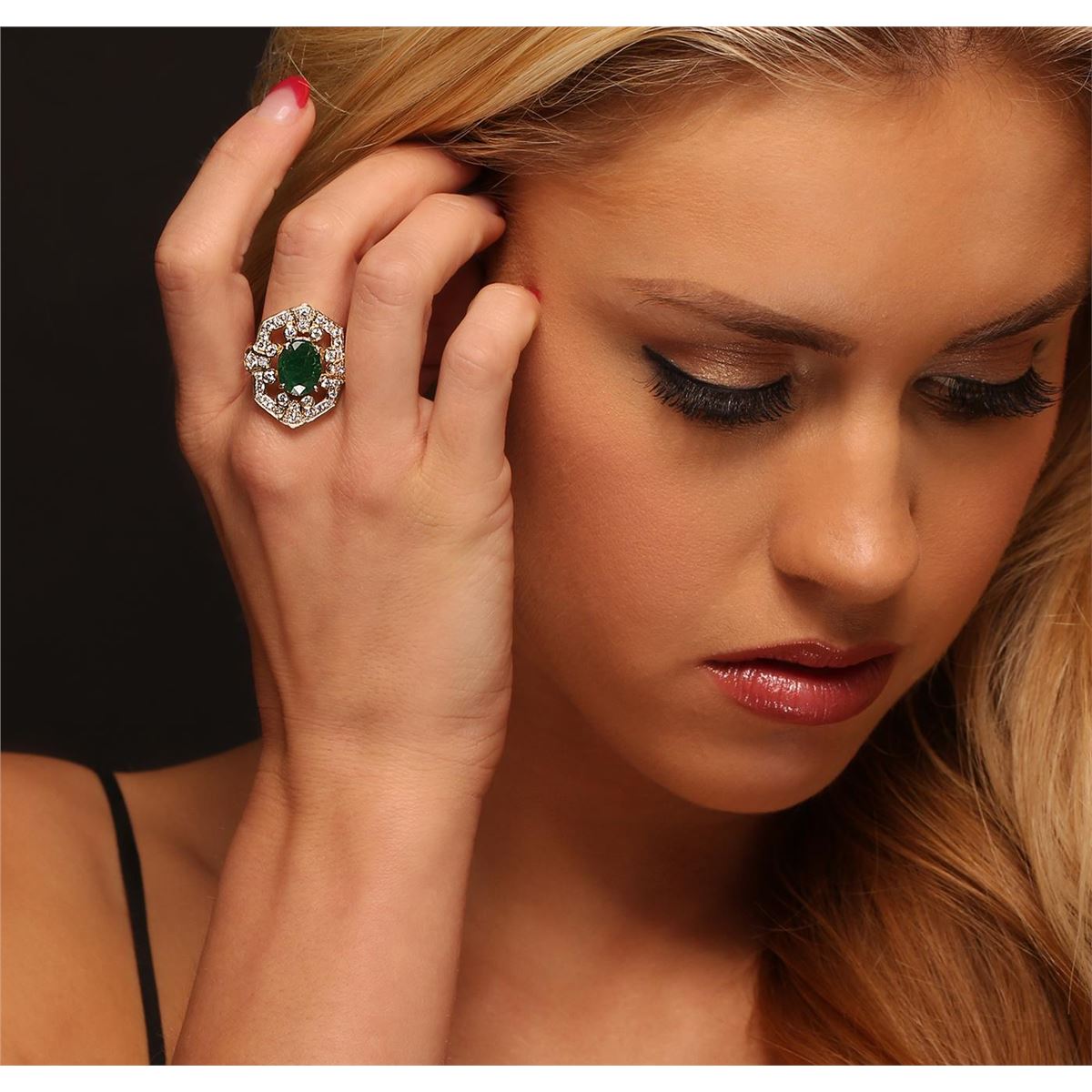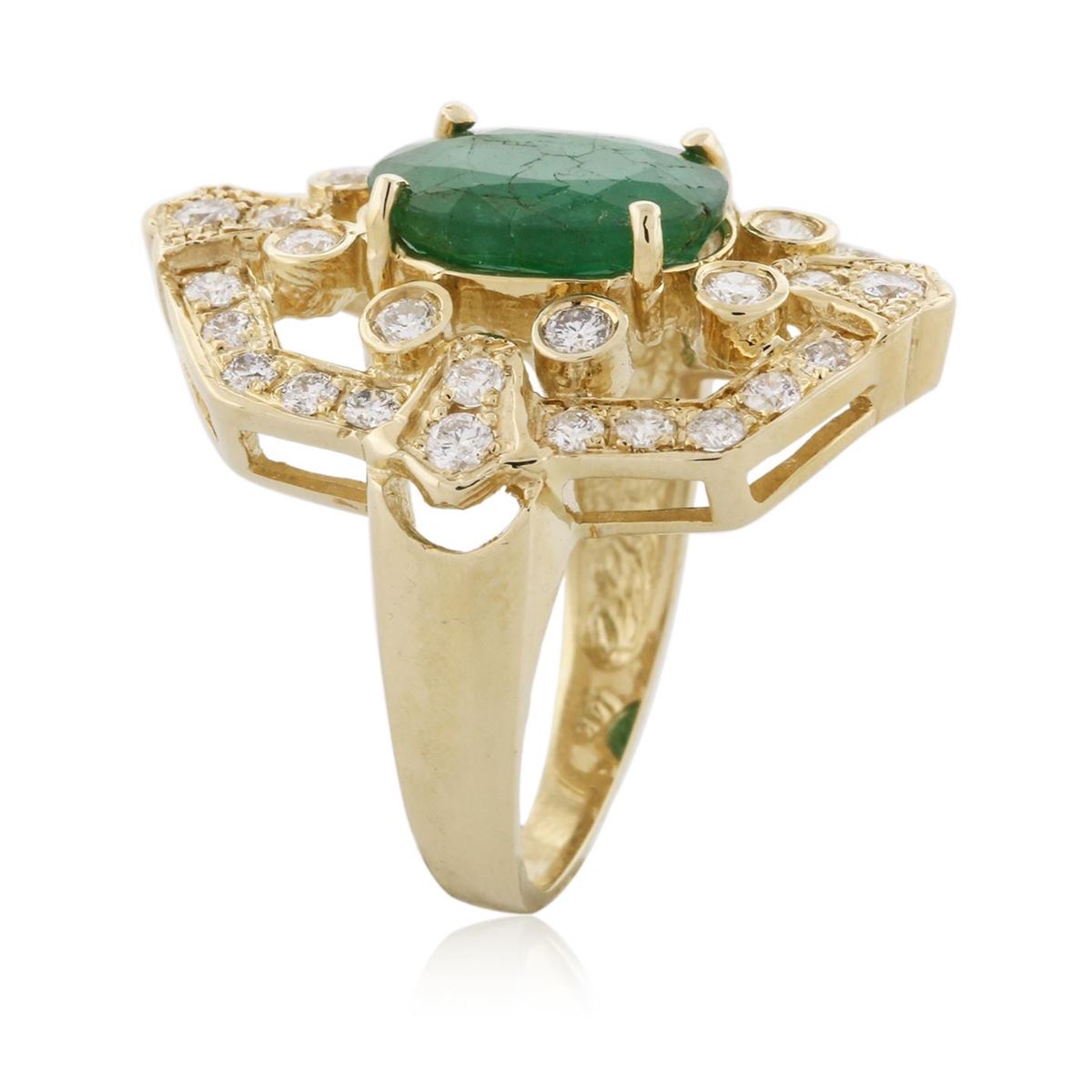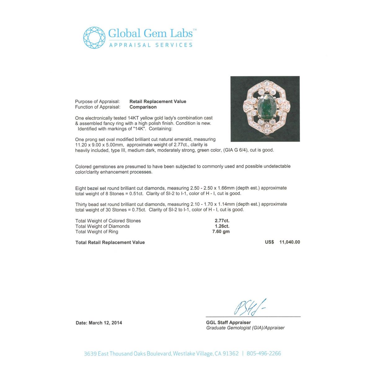 One electronically tested 14KT yellow gold Ladies combination cast & assembled fancy ring with a high polish finish. Condition is new. Identified with markings of "14K". Containing: One prong set oval modified brilliant cut natural emerald, measuring 11.20 x 9.00 x 5.00mm, approximate weight of 2.77ct., clarity is heavily included, type III, medium dark, moderately strong, green color, (GIA G 6/4), cut is good. Colored gemstones are presumed to have been subjected to commonly used and possible undetectable color/clarity enhancement processes. Eight bezel set round brilliant cut diamonds, measuring 2.50 - 2.50 x 1.66mm (depth est.) approximate total weight of 8 Stones = 0.51ct. Clarity of SI-2 to I-1, Color of H - I, Cut is Good. Thirty bead set round brilliant cut diamonds, measuring 2.10 - 1.70 x 1.14mm (depth est.) approximate total weight of 30 Stones = 0.75ct. Clarity of SI-2 to I-1, Color of H - I, Cut is Good. Total Weight of Colored Stones 2.77ct. Total Weight of Diamonds 1.26ct. Total Weight of Ring 7.60 grams. GGL Appraised at $11,040.00.