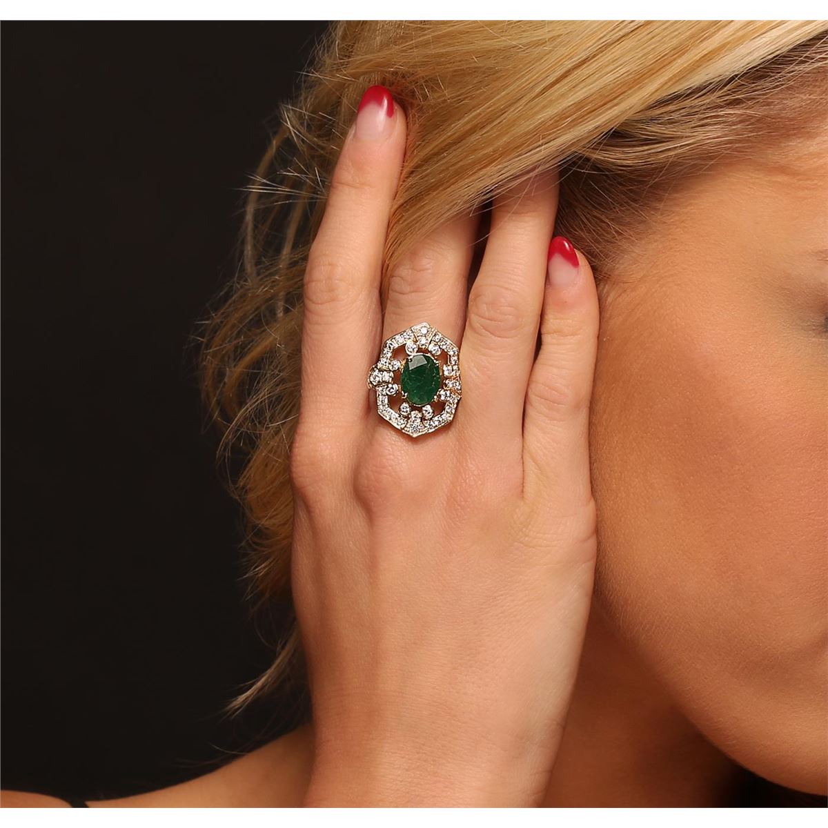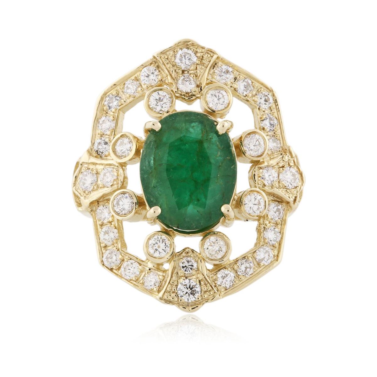 One electronically tested 14KT yellow gold Ladies combination cast & assembled fancy ring with a high polish finish. Condition is new. Identified with markings of "14K". Containing: One prong set oval modified brilliant cut natural emerald, measuring 11.20 x 9.00 x 5.00mm, approximate weight of 2.77ct., clarity is heavily included, type III, medium dark, moderately strong, green color, (GIA G 6/4), cut is good. Colored gemstones are presumed to have been subjected to commonly used and possible undetectable color/clarity enhancement processes. Eight bezel set round brilliant cut diamonds, measuring 2.50 - 2.50 x 1.66mm (depth est.) approximate total weight of 8 Stones = 0.51ct. Clarity of SI-2 to I-1, Color of H - I, Cut is Good. Thirty bead set round brilliant cut diamonds, measuring 2.10 - 1.70 x 1.14mm (depth est.) approximate total weight of 30 Stones = 0.75ct. Clarity of SI-2 to I-1, Color of H - I, Cut is Good. Total Weight of Colored Stones 2.77ct. Total Weight of Diamonds 1.26ct. Total Weight of Ring 7.60 grams. GGL Appraised at $11,040.00.