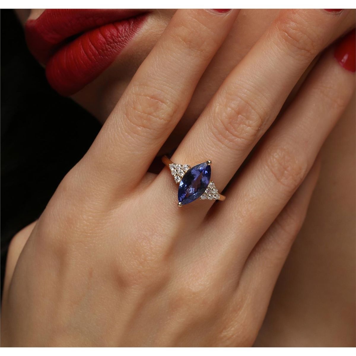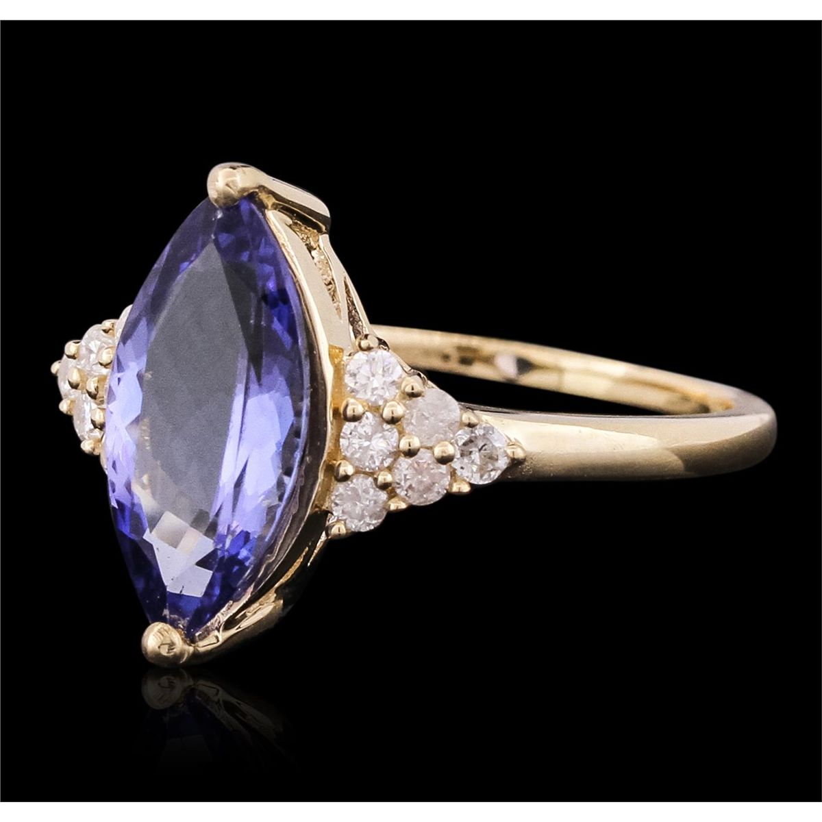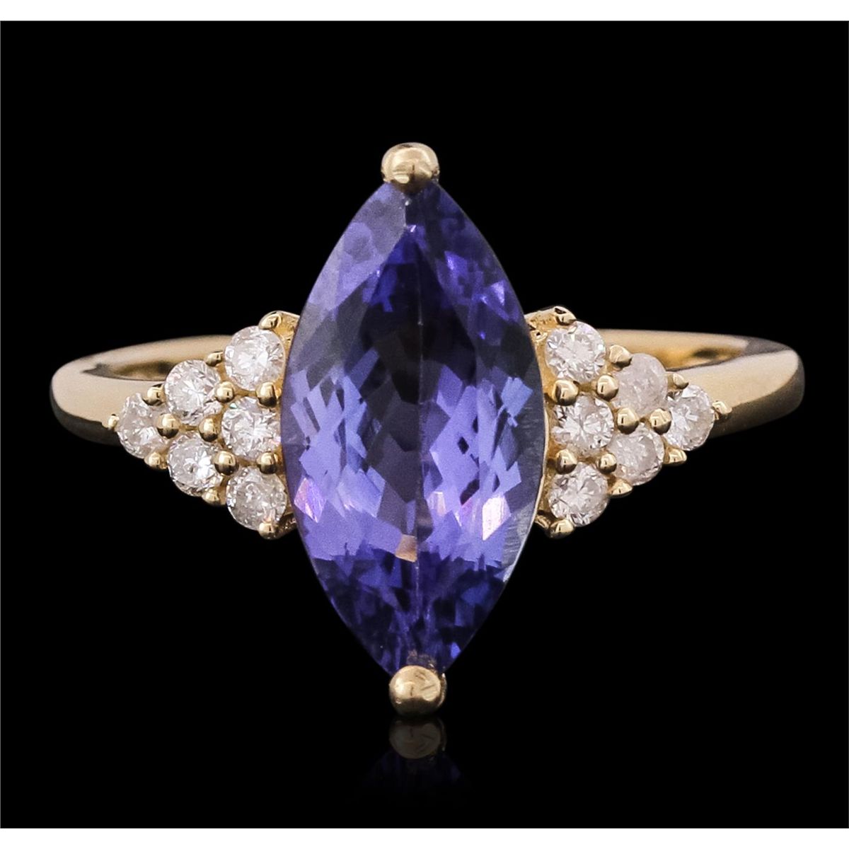 One electronically tested 14KT yellow gold ladies cast tanzanite and diamond ring with a bright polish finish. The featured tanzanite is supported by diamond set shoulders, completed by a one and one-half millimeter wide band. Trademark is Orianne. Identified with markings of "14K". Condition is new, good workmanship. Containing: One prong set marquise mixed cut natural tanzanite, measuring 14.00 x 7.00 x 4.20mm, 6% bulge factor, approximate weight of 2.78ct., clarity is eye clean, type I, medium dark, very slightly grayish, bluish violet color, (GIA bV 6/3), cut is good. Transmitting light with no distortion, transparent. Graded in the setting. Tanzanite is a very rare gemstone that is only found in the country of Tanzania. Originally discovered in 1967. Tiffany & Company, named the stone Tanzanite. It is found in the Usumburu Mountains that border the Umba Valley of northern Tanzania. Tanzanite occurs in gray, brown, violet, blue, reddish-purple, & green. The gem is interesting because of its exceptional pleochroism. Rotated in different directions a tanzanite will exhibit multiple changes of color. Tanzanite has a low tolerance to ultrasonic cleaning, and should not be cleaned using this method. Twelve prong set round brilliant cut diamonds, measuring 1.90 - 1.80 x 1.11mm (depth est.) approximate total weight of 12 Stones = 0.37ct. Graded in the setting. Clarity: I-1 to I-2. Color: G - I. Total Weight of Colored Stones 2.78ct. Total Weight of Diamonds 0.37ct. Total Weight of Ring 3.13 grams. AIG Appraised at $7,545.00.