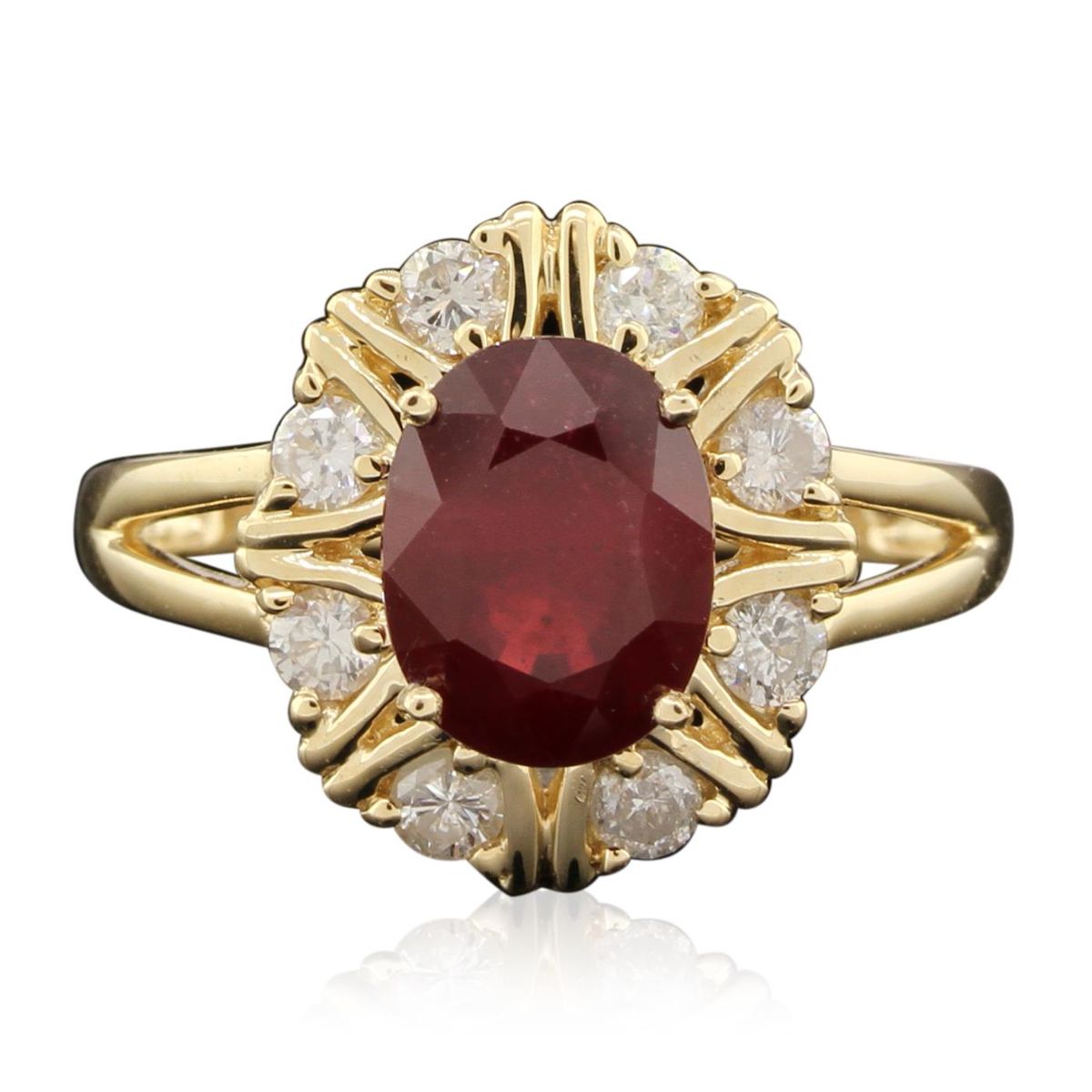 14KT yellow gold 2.79ct Ruby and Diamond Ring A6577. One electronically tested 14KT yellow gold ladies cast ruby and diamond ring with a bright polish finish. The featured ruby is set within a stylized diamond bezel supported by split shoulders, completed by a one and one-half millimeter wide ban.d Trademark is ORIANNE. Identified with markings of "14K". Condition is new, good workmanship. Containing: One prong set oval mixed cut natural ruby, measuring 9.10 x 7.20 x 4.50mm, 15%. bulge factor, approximate weight of 2.79ct., clarity is heavily included, type II, dark, very slightly brownish, slightly purplish red color, (GIA slpR 7/3), cut is good. Transmitting light somewhat diffusely, transparent to translucent. Naturally occurring internal & external characteristics are present. Indications of laboratory high temperature heat treatment, with glass & flux additives. Graded in the setting. Ruby has a low tolerance to rhodium plating, repolishing the surface, & ultrasonic cleaning.Eight prong set round brilliant cut diamonds, measuring 2.60 - 2.50 x 1.53mm (depth est.) approximate. Total Weight of 8 Stones = 0.49ct. Graded in the setting. Clarity: SI-1 to I-1. Color: G - I. Total Weight of Colored Stones 2.79ct. Total Weight of Diamonds 0.49ct. AIG Appraised at $2,895.00.