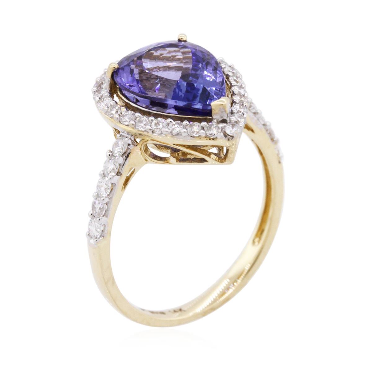 One electronically tested 14KT yellow gold ladies combination cast & assembled tanzanite and diamond ring with a flat shank with a bright polish finish. Identified with markings of "14K". Condition is new. Containing: One prong set pear modified brilliant cut natural tanzanite, measuring 11.00 x 8.70 x 4.36mm, approximate weight of 2.80ct., clarity is eye clean, type I, medium, very slightly grayish, violet color, (GIA V 5/3), cut is good. Thirty-Six prong set round brilliant cut diamonds, measuring 1.80 - 1.50 x 0.99mm (depth est.) approximate total weight of 36 Stones = 0.50ct. Clarity: SI-2 to I-2. Color: I - J, Cut is Good. Colored gemstones are presumed to have been subjected to commonly used enhancement processes. All diamonds and colored gemstones are graded in the mounting, unless otherwise stated. Total Weight of Colored Stones 2.80ct. Total Weight of Diamonds 0.50ct. Total Weight of Ring 3.80 grams. GGL Appraised at $6,075.00.
