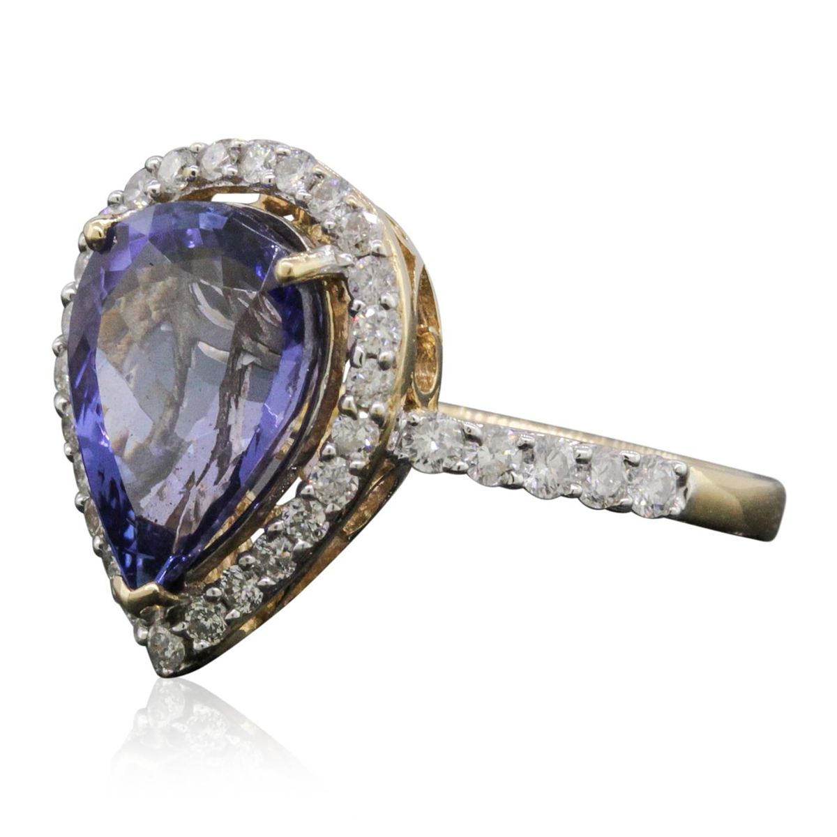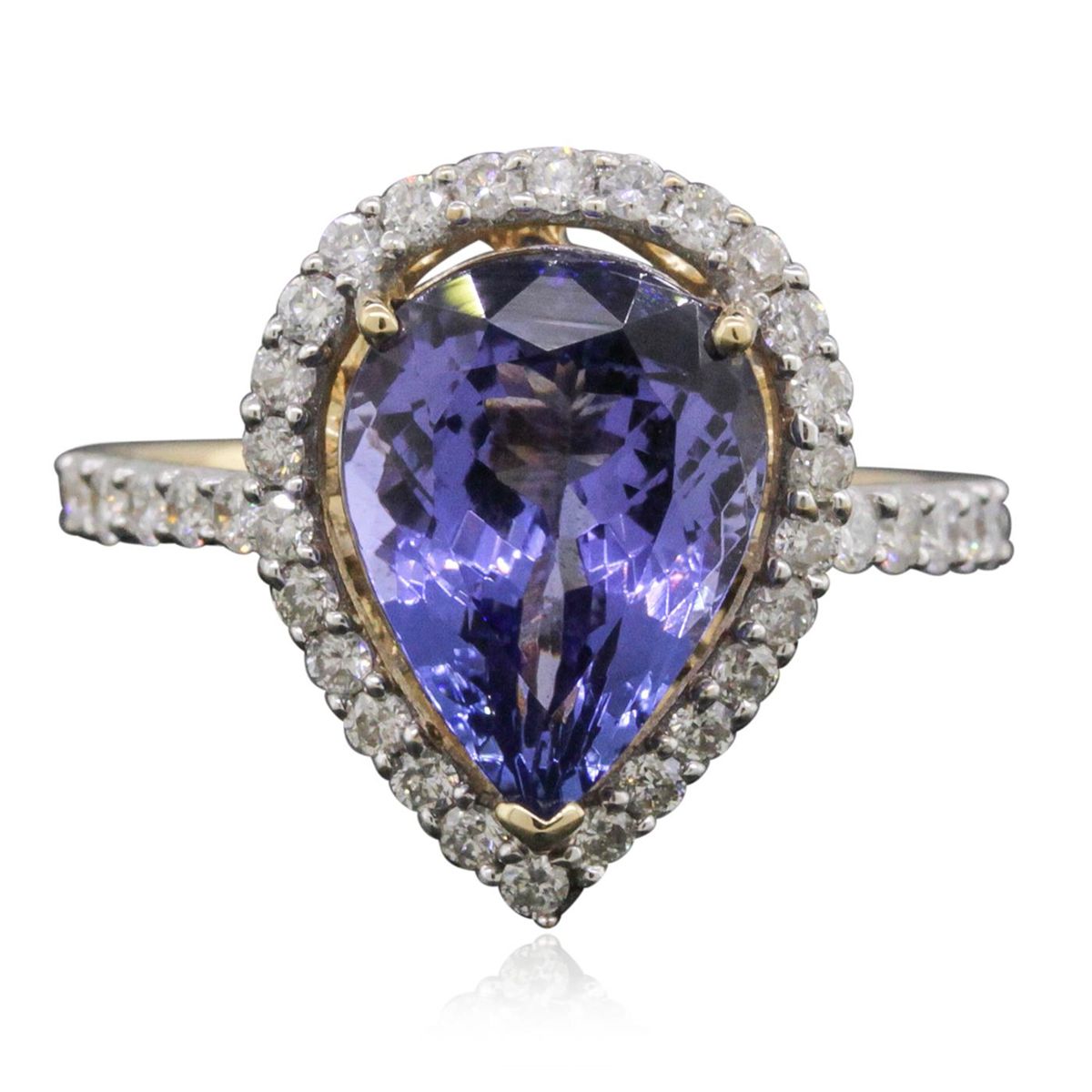 One electronically tested 14KT yellow gold ladies combination cast & assembled tanzanite and diamond ring with a flat shank with a bright polish finish. Identified with markings of "14K". Condition is new. Containing: One prong set pear modified brilliant cut natural tanzanite, measuring 11.00 x 8.70 x 4.36mm, approximate weight of 2.80ct., clarity is eye clean, type I, medium, very slightly grayish, violet color, (GIA V 5/3), cut is good. Thirty-Six prong set round brilliant cut diamonds, measuring 1.80 - 1.50 x 0.99mm (depth est.) approximate total weight of 36 Stones = 0.50ct. Clarity: SI-2 to I-2. Color: I - J, Cut is Good. Colored gemstones are presumed to have been subjected to commonly used enhancement processes. All diamonds and colored gemstones are graded in the mounting, unless otherwise stated. Total Weight of Colored Stones 2.80ct. Total Weight of Diamonds 0.50ct. Total Weight of Ring 3.80 grams. GGL Appraised at $6,075.00. AIG Appraised at $45,900.00.
