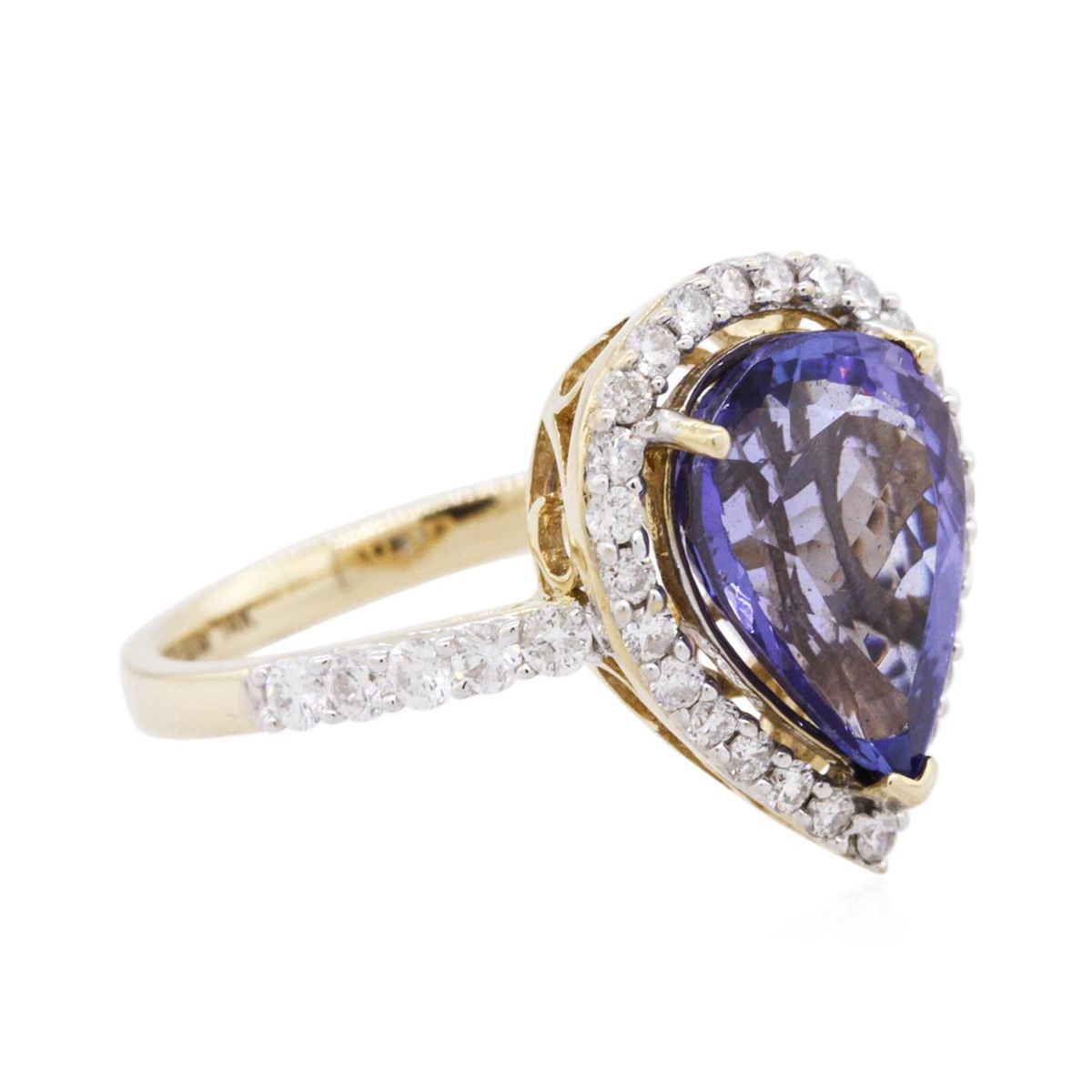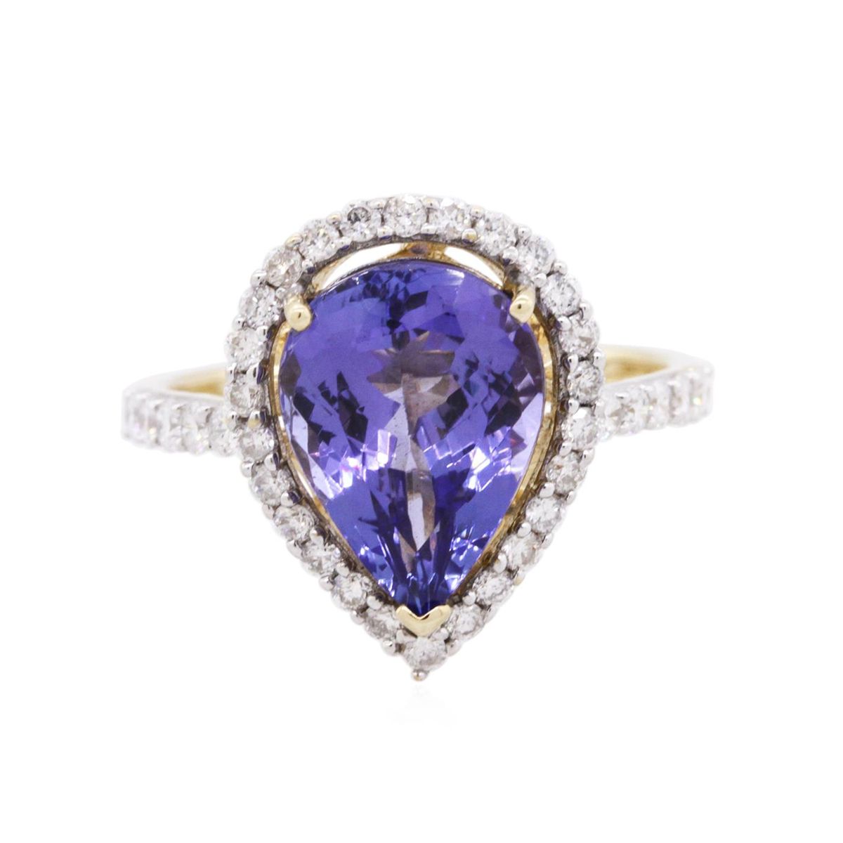 One electronically tested 14KT yellow gold ladies combination cast & assembled tanzanite and diamond ring with a flat shank with a bright polish finish. Identified with markings of "14K". Condition is new. Containing: One prong set pear modified brilliant cut natural tanzanite, measuring 11.00 x 8.70 x 4.36mm, approximate weight of 2.80ct., clarity is eye clean, type I, medium, very slightly grayish, violet color, (GIA V 5/3), cut is good. Thirty-Six prong set round brilliant cut diamonds, measuring 1.80 - 1.50 x 0.99mm (depth est.) approximate total weight of 36 Stones = 0.50ct. Clarity: SI-2 to I-2. Color: I - J, Cut is Good. Colored gemstones are presumed to have been subjected to commonly used enhancement processes. All diamonds and colored gemstones are graded in the mounting, unless otherwise stated. Total Weight of Colored Stones 2.80ct. Total Weight of Diamonds 0.50ct. Total Weight of Ring 3.80 grams. GGL Appraised at $6,075.00.