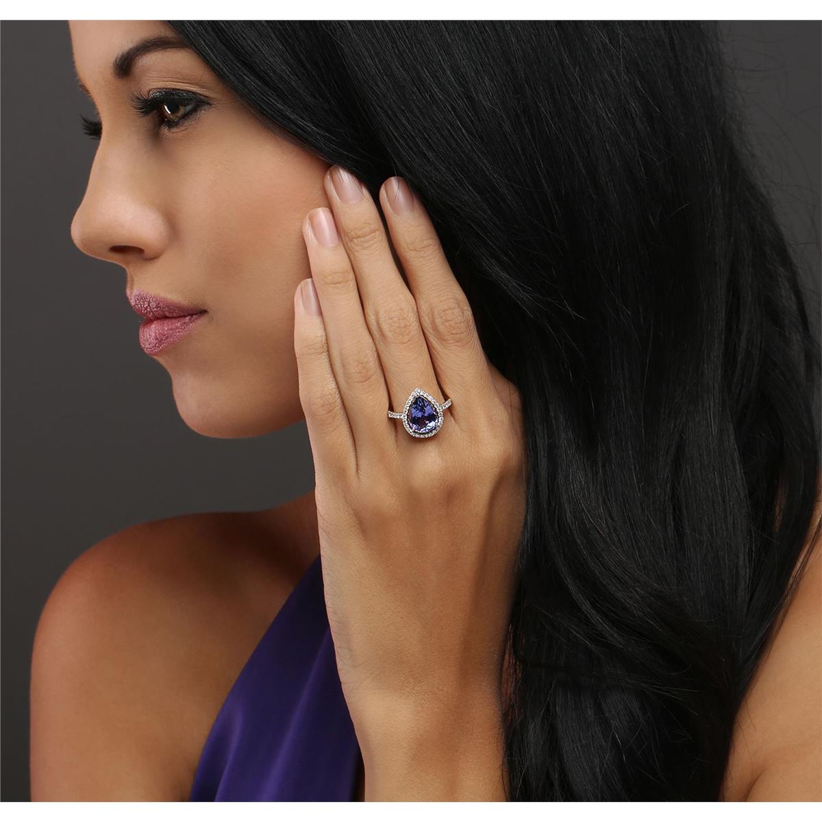One electronically tested 14KT yellow gold ladies combination cast & assembled tanzanite and diamond ring with a flat shank with a bright polish finish. Identified with markings of "14K". Condition is new. Containing: One prong set pear modified brilliant cut natural tanzanite, measuring 11.00 x 8.70 x 4.36mm, approximate weight of 2.80ct., clarity is eye clean, type I, medium, very slightly grayish, violet color, (GIA V 5/3), cut is good. Thirty-Six prong set round brilliant cut diamonds, measuring 1.80 - 1.50 x 0.99mm (depth est.) approximate total weight of 36 Stones = 0.50ct. Clarity: SI-2 to I-2. Color: I - J, Cut is Good. Colored gemstones are presumed to have been subjected to commonly used enhancement processes. All diamonds and colored gemstones are graded in the mounting, unless otherwise stated. Total Weight of Colored Stones 2.80ct. Total Weight of Diamonds 0.50ct. Total Weight of Ring 3.80 grams. GGL Appraised at $6,075.00.