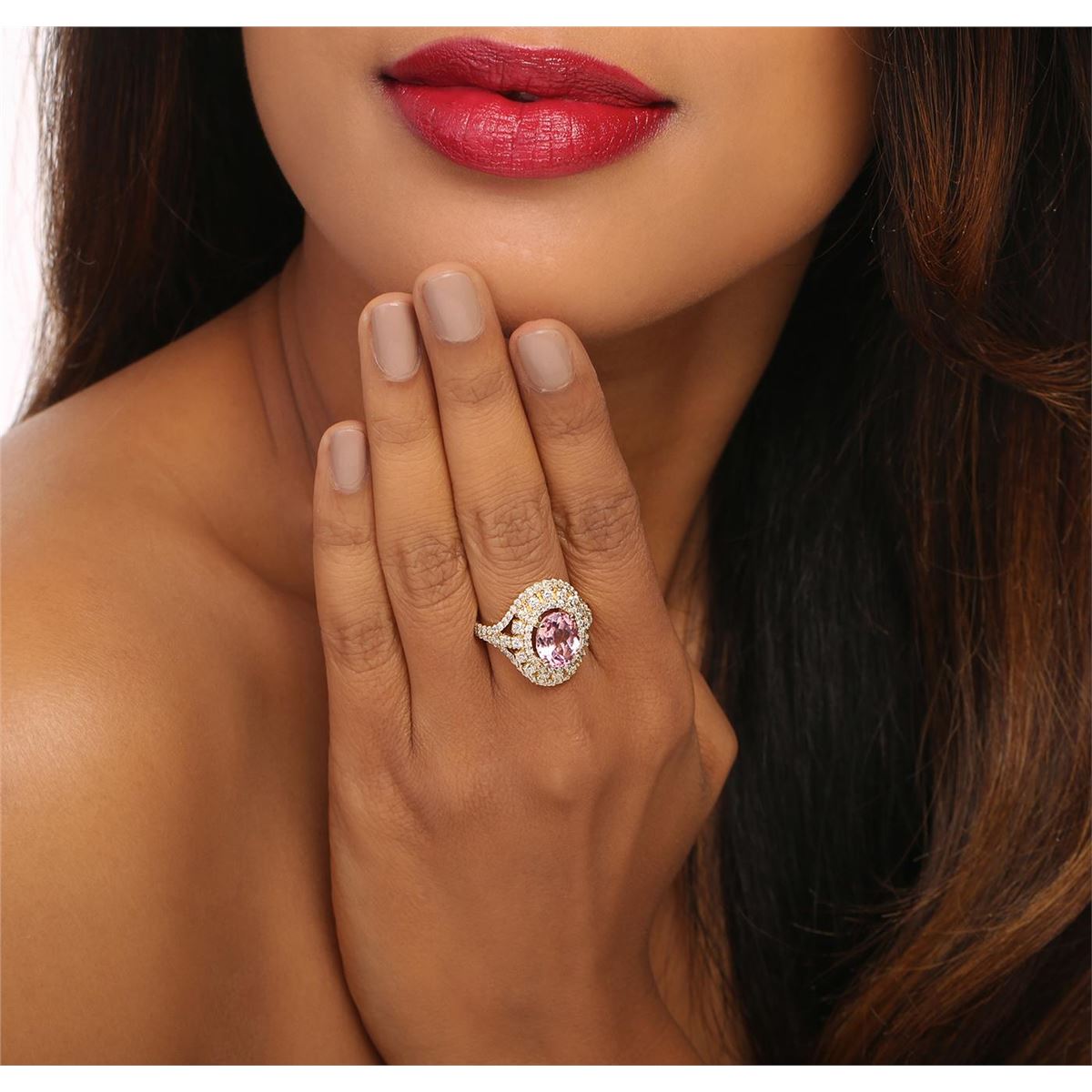 One electronically tested 14KT yellow gold ladies combination cast & assembled ring with a bright polish finish. Condition is new. Identified with markings of "K14". Containing: One prong set oval modified brilliant cut natural kunzite, measuring 10.00 x 8.00 x 5.45mm, approximate weight of 2.81ct., clarity is eye clean, type I, light, very slightly grayish, reddish purple color, (GIA rP 3/3), cut is good. Twenty-Four prong set round brilliant cut diamonds, measuring 1.10 - 1.10 x 0.66mm (depth est.) approximate. Total Weight of 24 Stones = 0.12ct. Clarity: I-1 to I-2. Color: I - J, Cut is Good. Seventy-Six prong set round brilliant cut diamonds, measuring 2.20 - 1.30 x 1.05mm (depth est.) approximate. Total Weight of 76 Stones = 0.99ct. Clarity: I-1 to I-2. Color: I - J, Cut is Good. Colored gemstones are presumed to have been subjected to commonly used enhancement processes. All diamonds and colored gemstones are graded in the mounting, unless otherwise stated. Total Weight of Colored Stones 2.81ct. Total Weight of Diamonds 1.11ct. Total Weight of Ring 7.70 grams. GGL Appraised at $6,610.00.