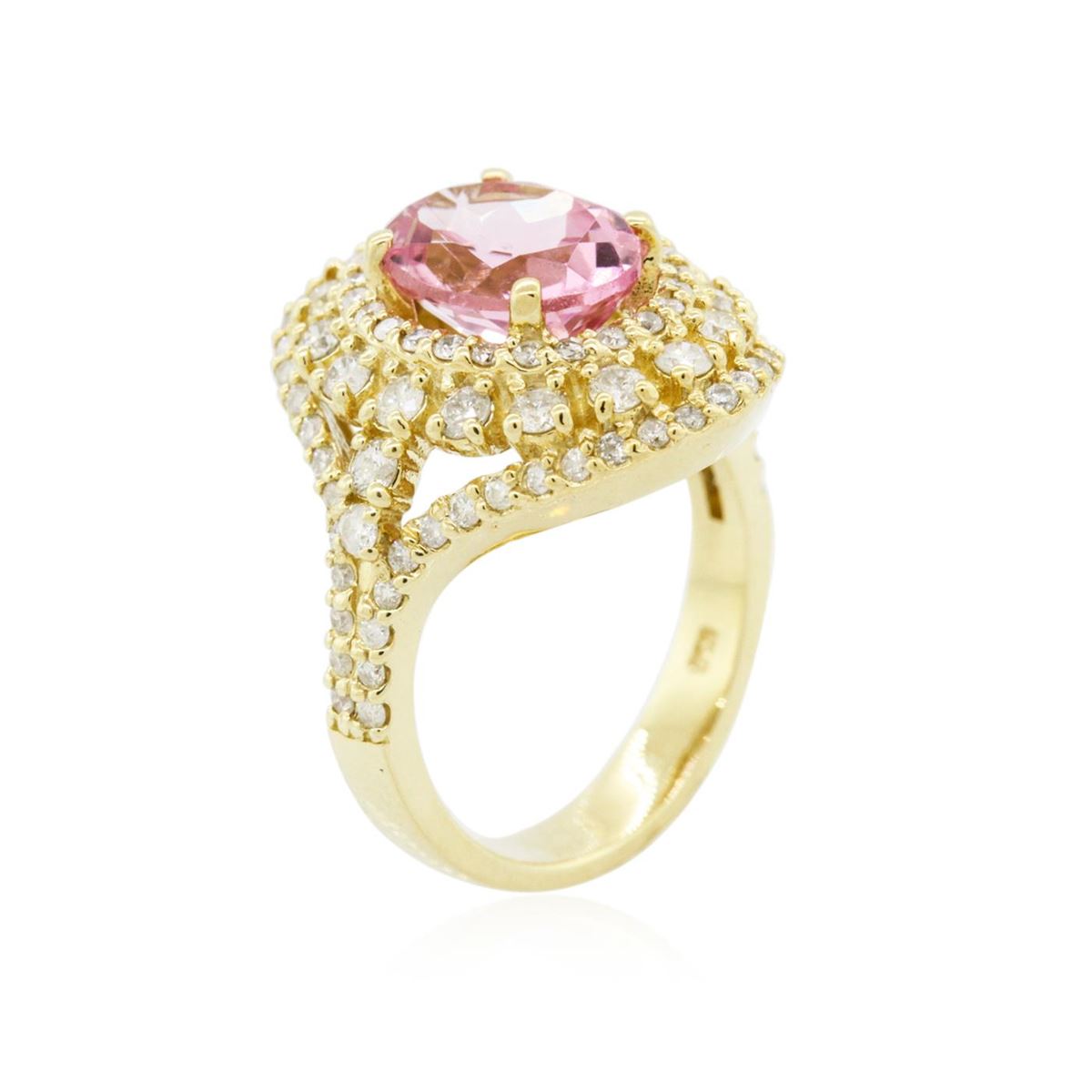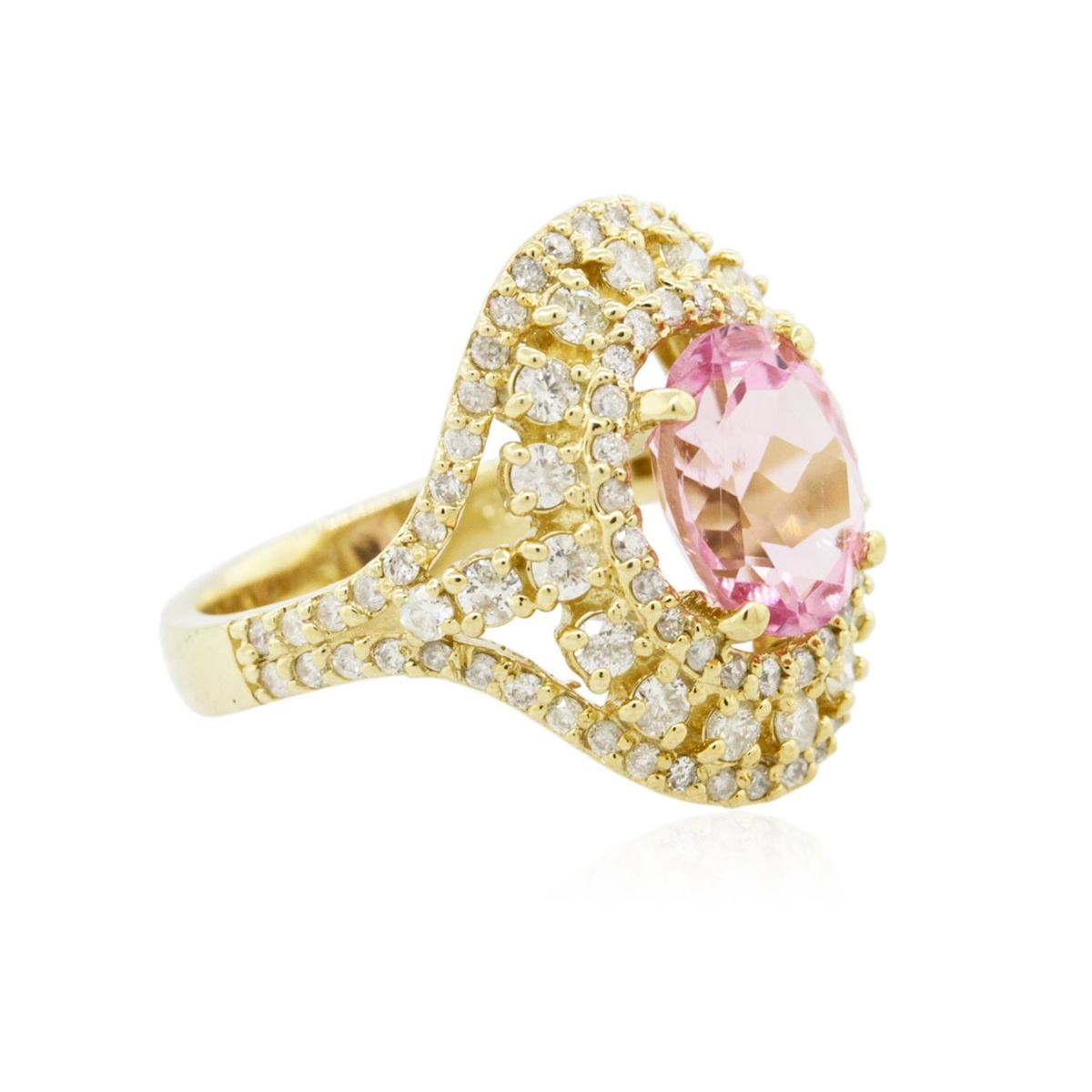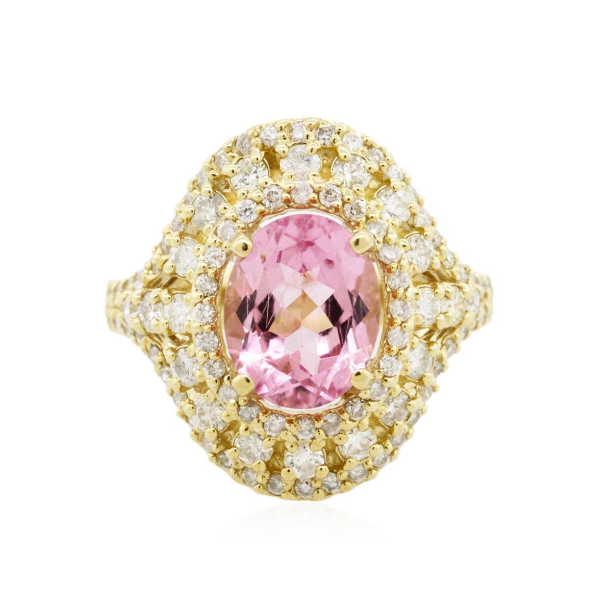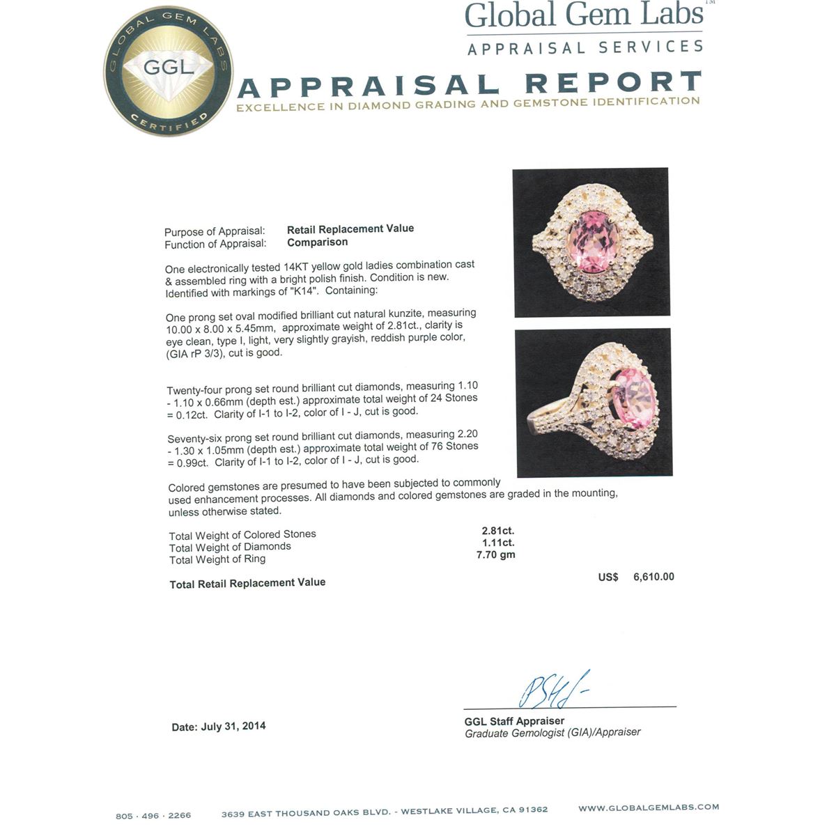 One electronically tested 14KT yellow gold ladies combination cast & assembled ring with a bright polish finish. Condition is new. Identified with markings of "K14". Containing: One prong set oval modified brilliant cut natural kunzite, measuring 10.00 x 8.00 x 5.45mm, approximate weight of 2.81ct., clarity is eye clean, type I, light, very slightly grayish, reddish purple color, (GIA rP 3/3), cut is good. Twenty-Four prong set round brilliant cut diamonds, measuring 1.10 - 1.10 x 0.66mm (depth est.) approximate. Total Weight of 24 Stones = 0.12ct. Clarity: I-1 to I-2. Color: I - J, Cut is Good. Seventy-Six prong set round brilliant cut diamonds, measuring 2.20 - 1.30 x 1.05mm (depth est.) approximate. Total Weight of 76 Stones = 0.99ct. Clarity: I-1 to I-2. Color: I - J, Cut is Good. Colored gemstones are presumed to have been subjected to commonly used enhancement processes. All diamonds and colored gemstones are graded in the mounting, unless otherwise stated. Total Weight of Colored Stones 2.81ct. Total Weight of Diamonds 1.11ct. Total Weight of Ring 7.70 grams. GGL Appraised at $6,610.00.