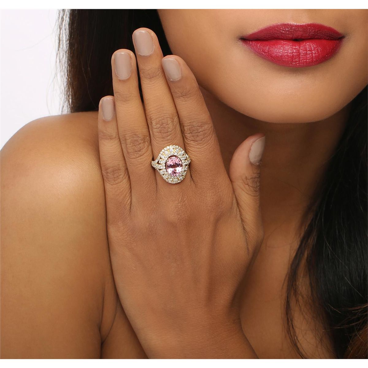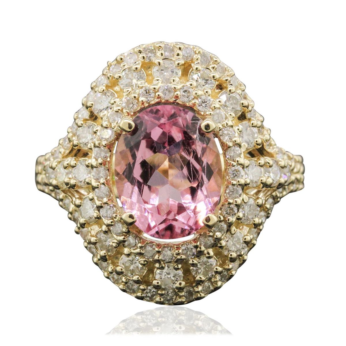 One electronically tested 14KT yellow gold ladies combination cast & assembled ring with a bright polish finish. Condition is new. Identified with markings of "K14". Containing: One prong set oval modified brilliant cut natural kunzite, measuring 10.00 x 8.00 x 5.45mm, approximate weight of 2.81ct., clarity is eye clean, type I, light, very slightly grayish, reddish purple color, (GIA rP 3/3), cut is good. Twenty-Four prong set round brilliant cut diamonds, measuring 1.10 - 1.10 x 0.66mm (depth est.) approximate. Total Weight of 24 Stones = 0.12ct. Clarity: I-1 to I-2. Color: I - J, Cut is Good. Seventy-Six prong set round brilliant cut diamonds, measuring 2.20 - 1.30 x 1.05mm (depth est.) approximate. Total Weight of 76 Stones = 0.99ct. Clarity: I-1 to I-2. Color: I - J, Cut is Good. Colored gemstones are presumed to have been subjected to commonly used enhancement processes. All diamonds and colored gemstones are graded in the mounting, unless otherwise stated. Total Weight of Colored Stones 2.81ct. Total Weight of Diamonds 1.11ct. Total Weight of Ring 7.70 grams. GGL Appraised at $6,610.00.