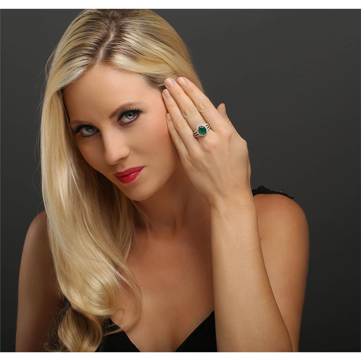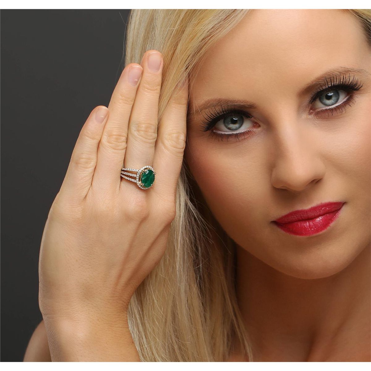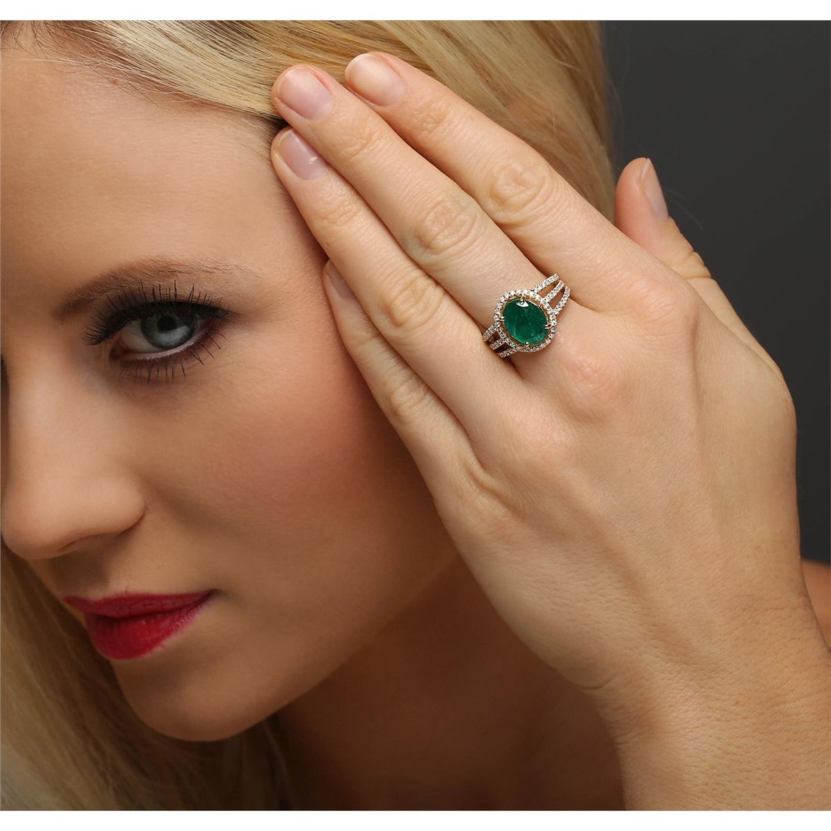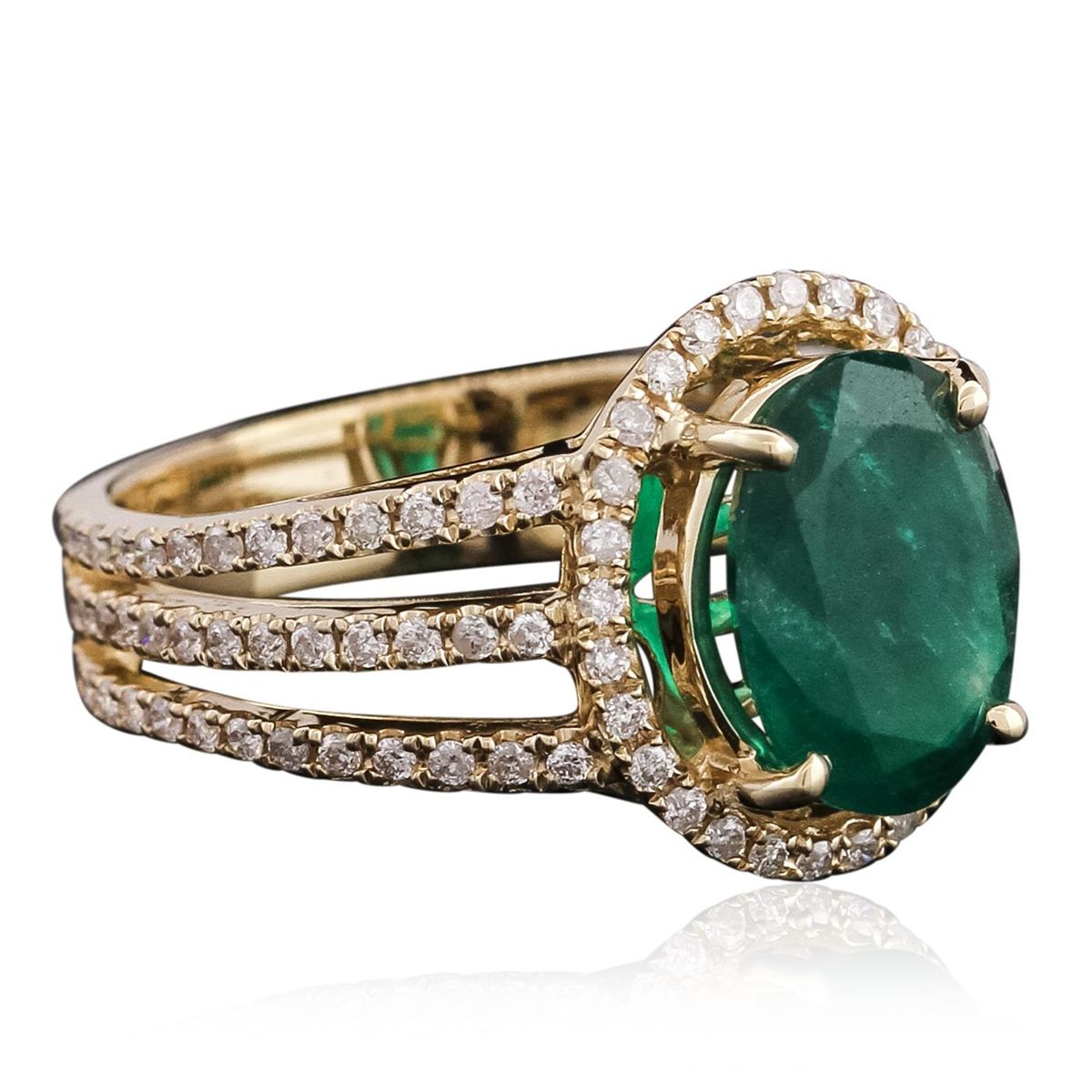 One electronically tested 14KT yellow gold ladies combination cast & assembled emerald and diamond ring with a split shank with a bright polish finish. Identified with markings of "14K". Condition is new. Containing: One prong set oval modified brilliant cut natural emerald, measuring 10.98 x 8.36 x 5.54mm, approximate weight of 2.82ct., clarity is heavily included, type III, medium dark, moderately strong, green color, (GIA G 6/4), cut is good. One Hundred Five prong set round brilliant cut diamonds, measuring 1.20 - 1.20 x 0.72mm (depth est.) approximate total weight of 105 Stones = 0.66ct. Clarity: I-1 to I-2. Color: J - K, Cut is Good. Colored gemstones are presumed to have been subjected to commonly used enhancement processes. All diamonds and colored gemstones are graded in the mounting, unless otherwise stated total weight of Colored Stones 2.82ct. Total Weight of Diamonds 0.66ct. Total Weight of Ring 5.30 grams. GGL Appraised at $8,590.00.