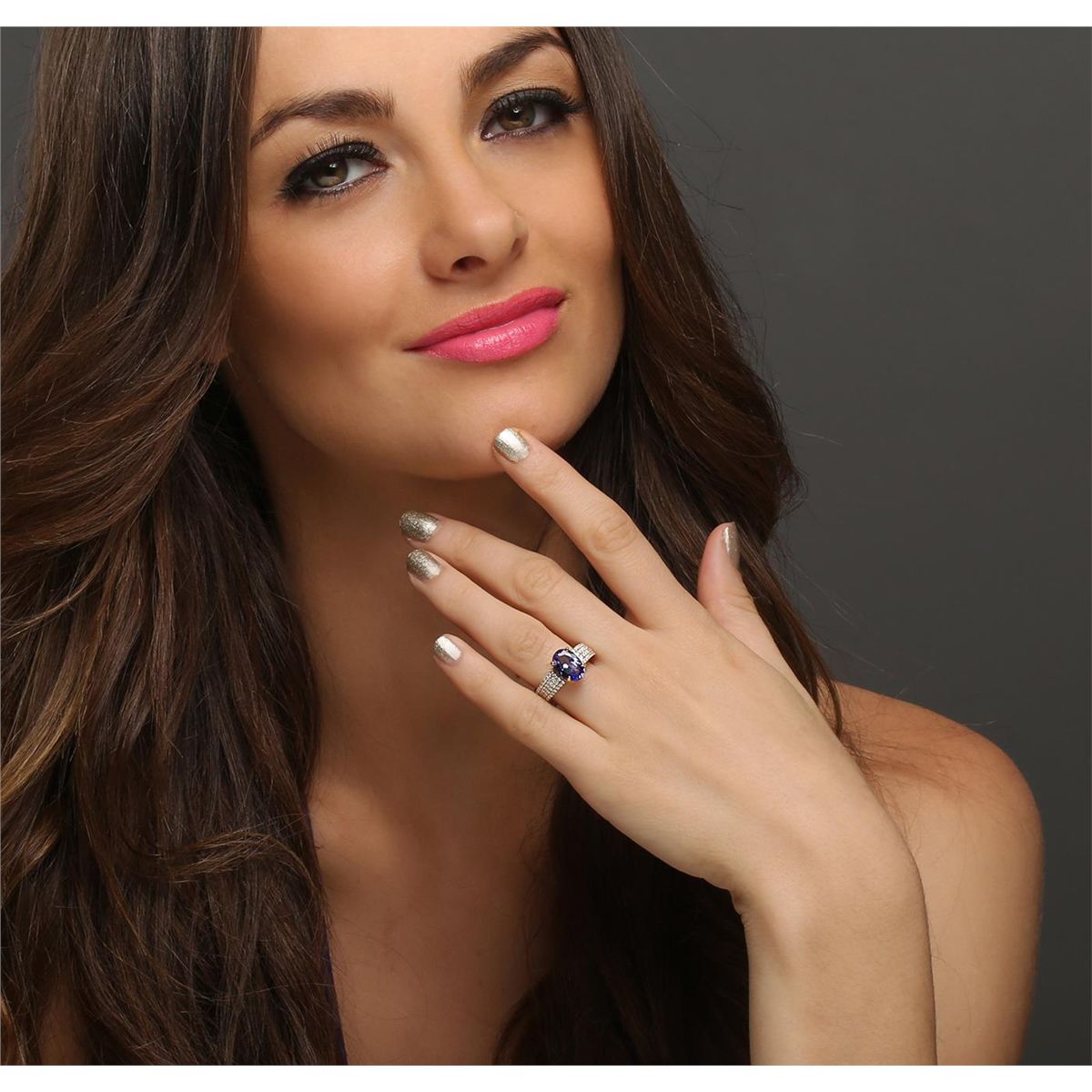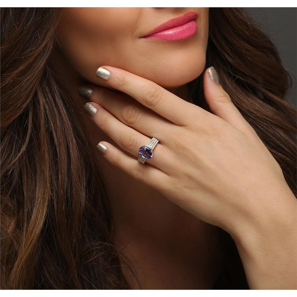 One electronically tested 14KT yellow gold ladies combination cast & assembled tanzanite and diamond ring with a flat shank with a bright polish finish. Identified with markings of "14K". Condition is new. Containing: One prong set oval modified brilliant cut natural tanzanite, measuring 11.25 x 7.94 x 4.59mm, approximate weight of 2.83ct., clarity is eye clean, type I, medium light, very slightly grayish, violet color, (GIA V 4/3), cut is good. Seventy-Two prong set round brilliant cut diamonds, measuring 1.30 - 1.10 x 0.72mm (depth est.) stated total weight of 72 Stones = 0.45ct. Clarity: I-1 to I-2. Color: J - K, Cut is Good. Colored gemstones are presumed to have been subjected to commonly used enhancement processes. All diamonds and colored gemstones are graded in the mounting, unless otherwise stated total weight of Colored Stones 2.83ct. Total Weight of Diamonds 0.45ct. Total Weight of Ring 5.80 grams. GGL Appraised at $7,055.00.