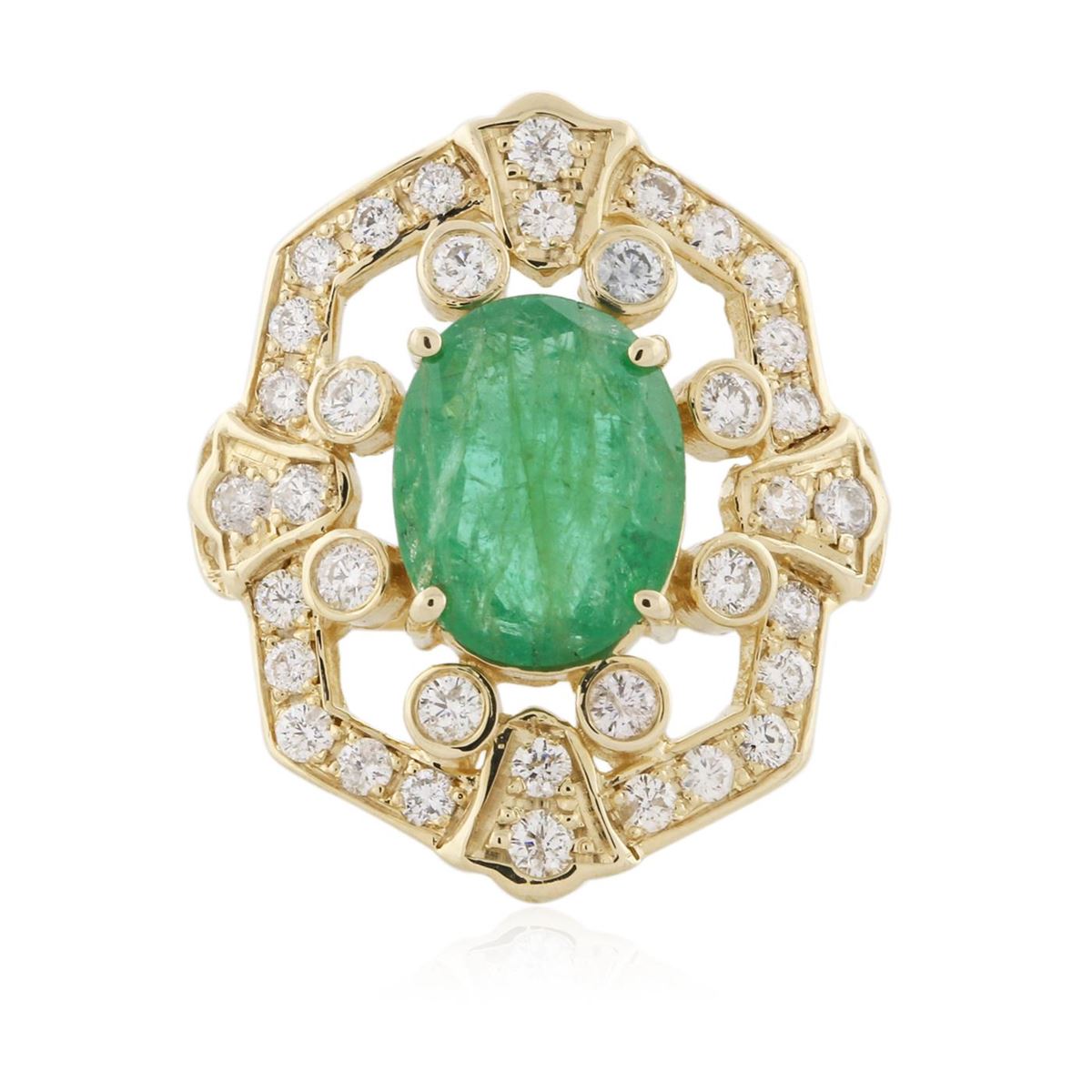 One electronically tested 14KT yellow gold Ladies combination cast & assembled fancy ring with a high polish finish. Condition is new. Identified with markings of "14K". Containing: One prong set oval modified brilliant cut natural emerald, measuring 11.70 x 9.20 x 4.80mm, approximate weight of 2.85ct., clarity is heavily included, type III, medium light, very slightly grayish, green color, (GIA G 4/3), cut is good. Colored gemstones are presumed to have been subjected to commonly used and possible undetectable color/clarity enhancement processes. Ten bezel set round brilliant cut diamonds, measuring 2.50 - 2.50 x 1.66mm (depth est.) approximate total weight of 10 Stones = 0.63ct. Clarity of SI-2 to I-1, Color of J - K, Cut is Good. Twenty-Seven bead set round brilliant cut diamonds, measuring 2.10 - 1.80 x 1.17mm (depth est.) approximate total weight of 27 Stones = 0.73ct. Clarity of SI-2 to I-1, Color of J - L, Cut is Good. Total Weight of Colored Stones 2.85ct. Total Weight of Diamonds 1.36ct. Total Weight of Ring 7.50 grams. GGL Appraised at $10,730.00.