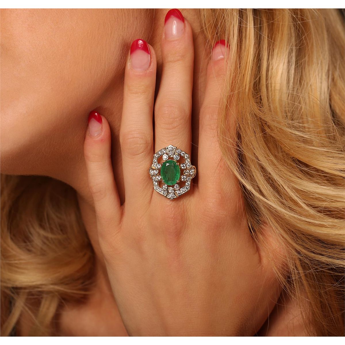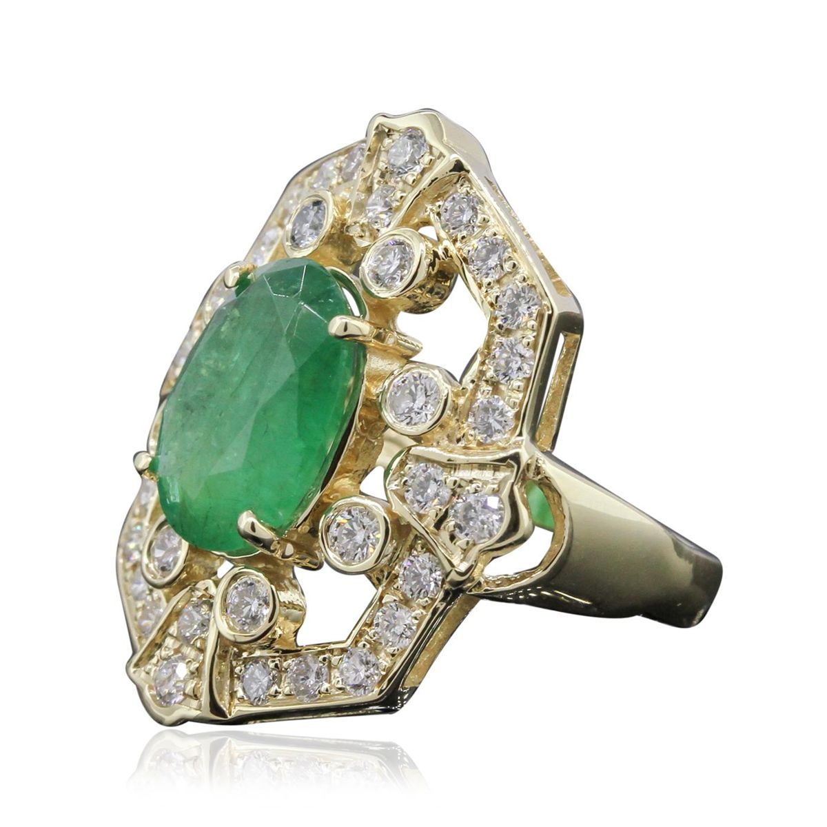 One electronically tested 14KT yellow gold Ladies combination cast & assembled fancy ring with a high polish finish. Condition is new. Identified with markings of "14K". Containing: One prong set oval modified brilliant cut natural emerald, measuring 11.70 x 9.20 x 4.80mm, approximate weight of 2.85ct., clarity is heavily included, type III, medium light, very slightly grayish, green color, (GIA G 4/3), cut is good. Colored gemstones are presumed to have been subjected to commonly used and possible undetectable color/clarity enhancement processes. Ten bezel set round brilliant cut diamonds, measuring 2.50 - 2.50 x 1.66mm (depth est.) approximate total weight of 10 Stones = 0.63ct. Clarity of SI-2 to I-1, Color of J - K, Cut is Good. Twenty-Seven bead set round brilliant cut diamonds, measuring 2.10 - 1.80 x 1.17mm (depth est.) approximate total weight of 27 Stones = 0.73ct. Clarity of SI-2 to I-1, Color of J - L, Cut is Good. Total Weight of Colored Stones 2.85ct. Total Weight of Diamonds 1.36ct. Total Weight of Ring 7.50 grams. GGL Appraised at $10,730.00.