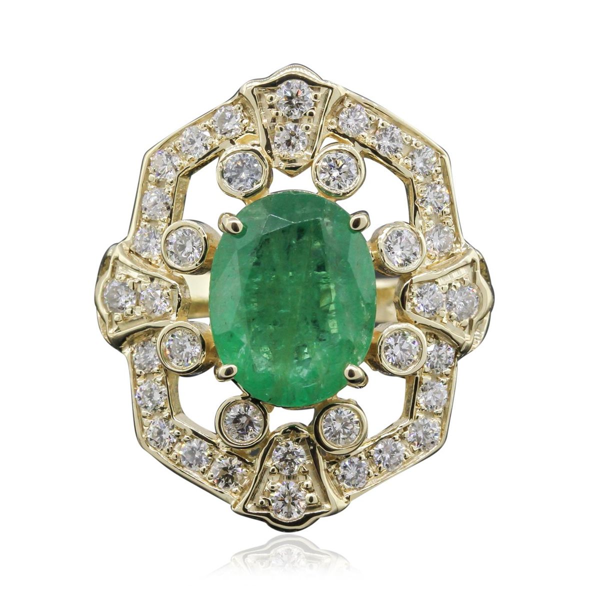 One electronically tested 14KT yellow gold Ladies combination cast & assembled fancy ring with a high polish finish. Condition is new. Identified with markings of "14K". Containing: One prong set oval modified brilliant cut natural emerald, measuring 11.70 x 9.20 x 4.80mm, approximate weight of 2.85ct., clarity is heavily included, type III, medium light, very slightly grayish, green color, (GIA G 4/3), cut is good. Colored gemstones are presumed to have been subjected to commonly used and possible undetectable color/clarity enhancement processes. Ten bezel set round brilliant cut diamonds, measuring 2.50 - 2.50 x 1.66mm (depth est.) approximate total weight of 10 Stones = 0.63ct. Clarity of SI-2 to I-1, Color of J - K, Cut is Good. Twenty-Seven bead set round brilliant cut diamonds, measuring 2.10 - 1.80 x 1.17mm (depth est.) approximate total weight of 27 Stones = 0.73ct. Clarity of SI-2 to I-1, Color of J - L, Cut is Good. Total Weight of Colored Stones 2.85ct. Total Weight of Diamonds 1.36ct. Total Weight of Ring 7.50 grams. GGL Appraised at $10,730.00.