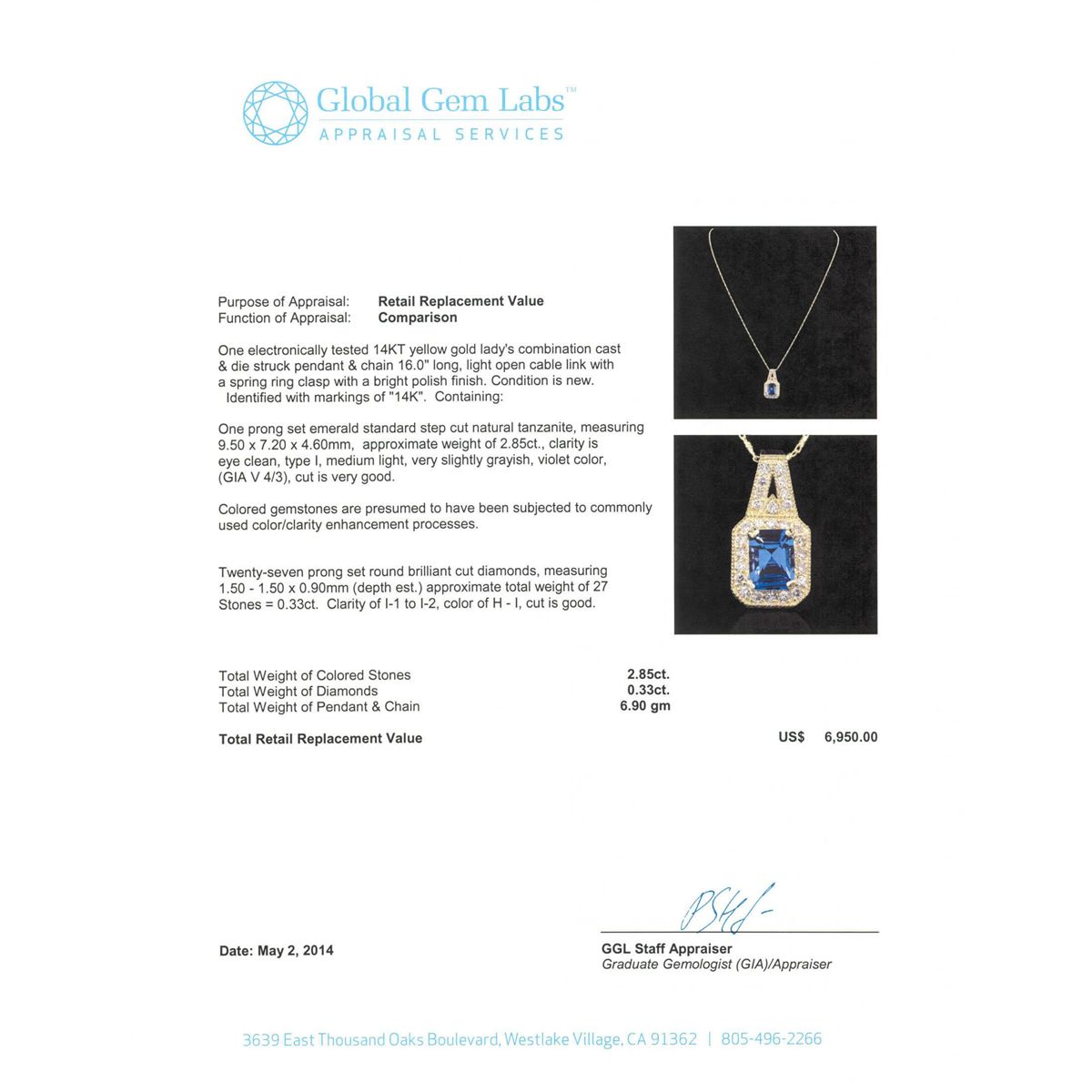 One electronically tested 14KT yellow gold Ladies combination cast & die struck pendant & chain 16.0" long, light open cable link with a spring ring clasp with a bright polish finish. Condition is new. Identified with markings of "14K". Containing: One prong set emerald standard step cut natural tanzanite, measuring 9.50 x 7.20 x 4.60mm, approximate weight of 2.85ct., clarity is eye clean, type I, medium light, very slightly grayish, violet color, (GIA V 4/3), cut is very good. Colored gemstones are presumed to have been subjected to commonly used color/clarity enhancement processes. Twenty-Seven prong set round brilliant cut diamonds, measuring 1.50 - 1.50 x 0.90mm (depth est.) approximate. Total Weight of 27 Stones = 0.33ct. Clarity: I-1 to I-2. Color: H - I, Cut is Good. Total Weight of Colored Stones 2.85ct. Total Weight of Diamonds 0.33ct. Total Weight of Pendant & Chain 6.90 grams. GGL Appraised at $6,950.00.