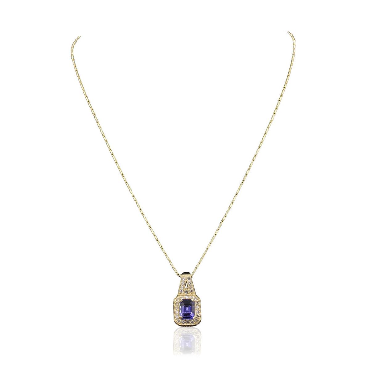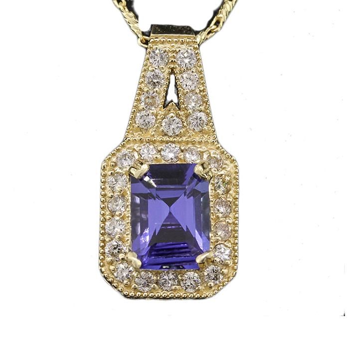 One electronically tested 14KT yellow gold Ladies combination cast & die struck pendant & chain 16.0" long, light open cable link with a spring ring clasp with a bright polish finish. Condition is new. Identified with markings of "14K". Containing: One prong set emerald standard step cut natural tanzanite, measuring 9.50 x 7.20 x 4.60mm, approximate weight of 2.85ct., clarity is eye clean, type I, medium light, very slightly grayish, violet color, (GIA V 4/3), cut is very good. Colored gemstones are presumed to have been subjected to commonly used color/clarity enhancement processes. Twenty-Seven prong set round brilliant cut diamonds, measuring 1.50 - 1.50 x 0.90mm (depth est.) approximate. Total Weight of 27 Stones = 0.33ct. Clarity: I-1 to I-2. Color: H - I, Cut is Good. Total Weight of Colored Stones 2.85ct. Total Weight of Diamonds 0.33ct. Total Weight of Pendant & Chain 6.90 grams. GGL Appraised at $6,950.00.