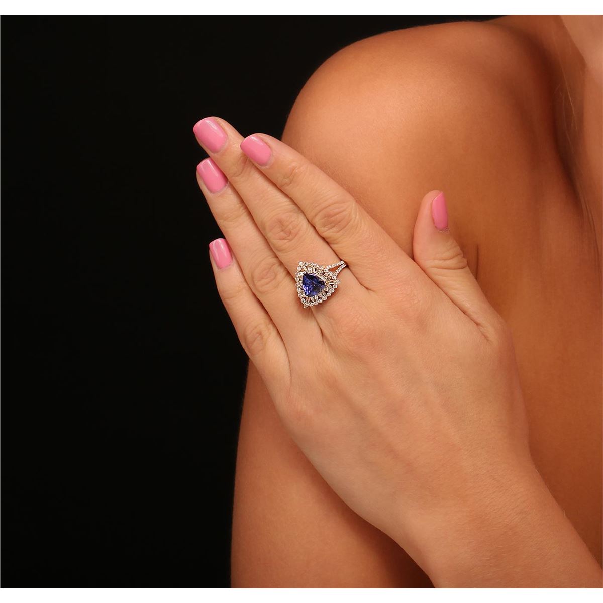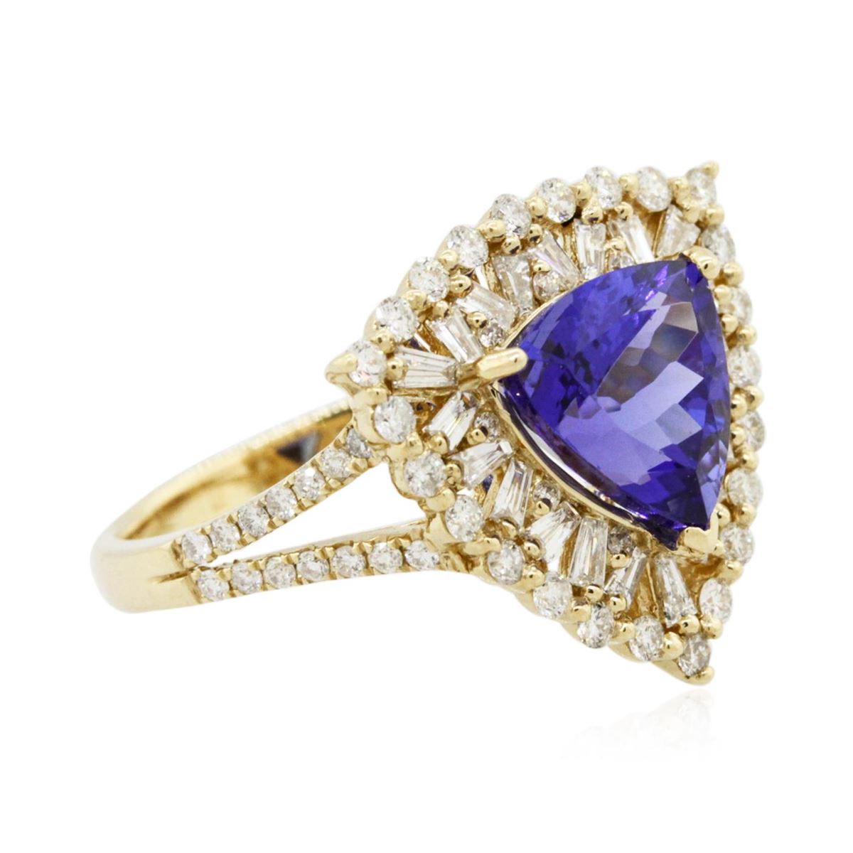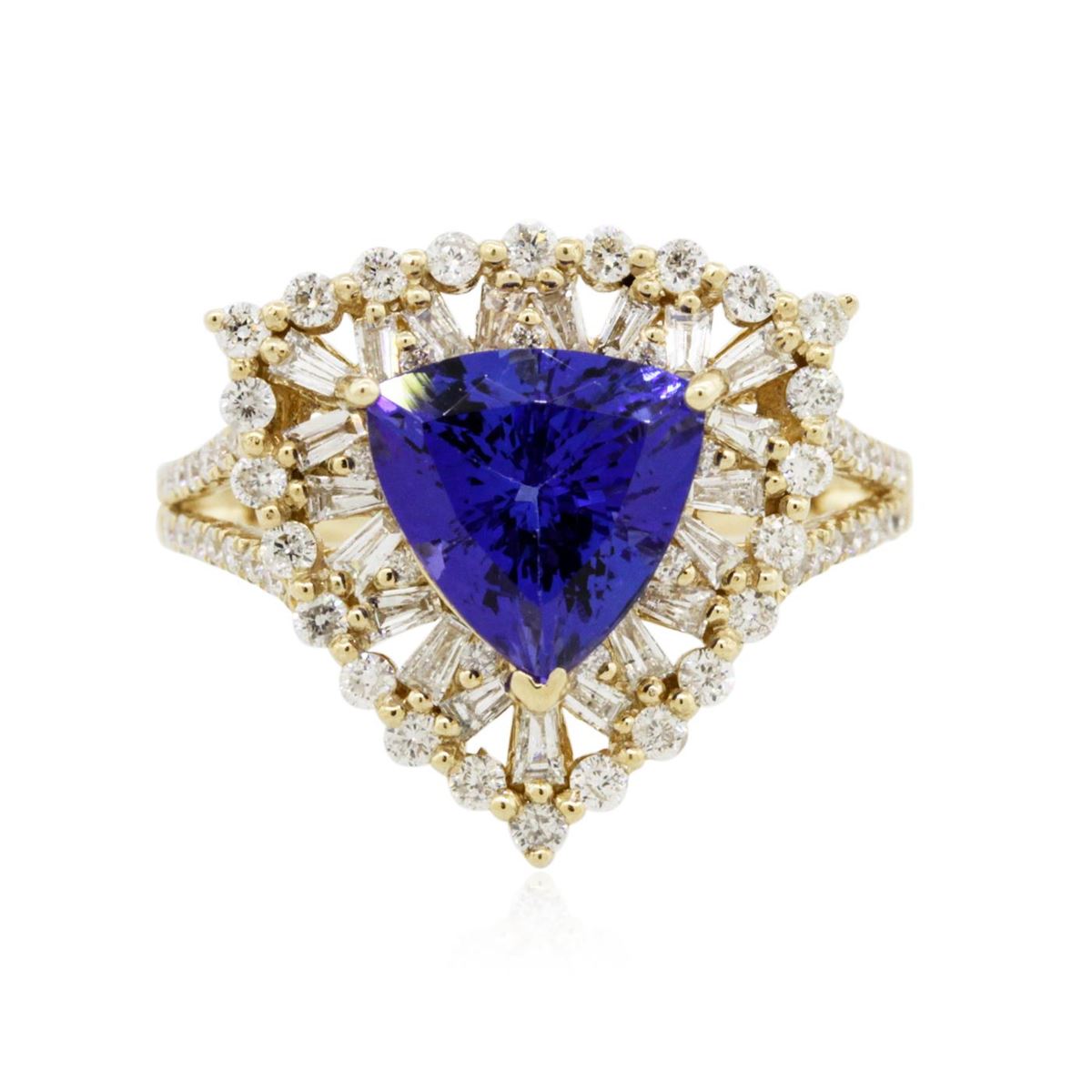 One electronically tested 14KT yellow gold Ladies combination cast & assembled ring with a bright polish finish. Identified with markings of "14K". Condition is new. Containing: Thirty-Seven prong set round brilliant cut diamonds, measuring 1.00 - 1.00 x 0.60mm (depth est.) approximate total weight of 37 Stones = 0.20ct. Clarity of I-1 to I-2, Color of H, Cut is Good. Twenty-Four prong set round brilliant cut diamonds, measuring 1.30 - 1.30 x 0.78mm (depth est.) approximate total weight of 24 Stones = 0.35ct. Clarity of I-1 to I-2, Color of H, Cut is Good. Nineteen prong set baguette cut diamonds, measuring 2.00 x 1.00 x 0.85mm (depth est.) approximate total weight of 19 Stones = 0.48ct. Clarity of SI-1 to SI-2, Color of J - K, Cut is Good. One prong set triangle modified brilliant cut natural tanzanite, measuring 9.00 x 9.00 x 5.85mm, approximate weight of 2.86ct., clarity is eye clean, type I, medium, moderately strong, blue color, (GIA B 5/4), cut is very good. Colored gemstones are presumed to have been subjected to commonly used color/clarity enhancement processes. Total Weight of Colored Stones 2.86ct. Total Weight of Diamonds 1.03ct. Total Weight of Ring 4.80 grams. GGL Appraised at $7,525.00.