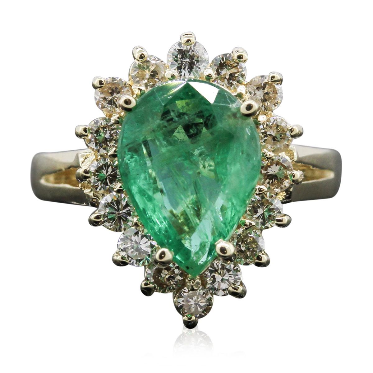 One electronically tested 14KT yellow gold Ladies combination cast & assembled fashion ring with a high polish finish. Condition is new. Identified with markings of "14K". Containing: One prong set pear modified mixed cut natural emerald, measuring 11.70 x 9.00 x 5.00mm, approximate weight of 2.86ct., clarity is moderately included, type III, medium light, moderately strong, very slightly bluish green color, (GIA vslbG 4/4), cut is good. Colored gemstones are presumed to have been subjected to commonly used and possible undetectable color/clarity enhancement processes. Sixteen prong set round brilliant cut diamonds, measuring 2.30 - 2.30 x 1.38mm (depth est.) approximate total weight of 16 Stones = 0.71ct. Clarity of SI-2 to I-1, Color of K - L, Cut is Good. Total Weight of Colored Stones 2.86ct. Total Weight of Diamonds 0.71ct. Total Weight of Ring 7.00 grams. GGL Appraised at $9,460.00.