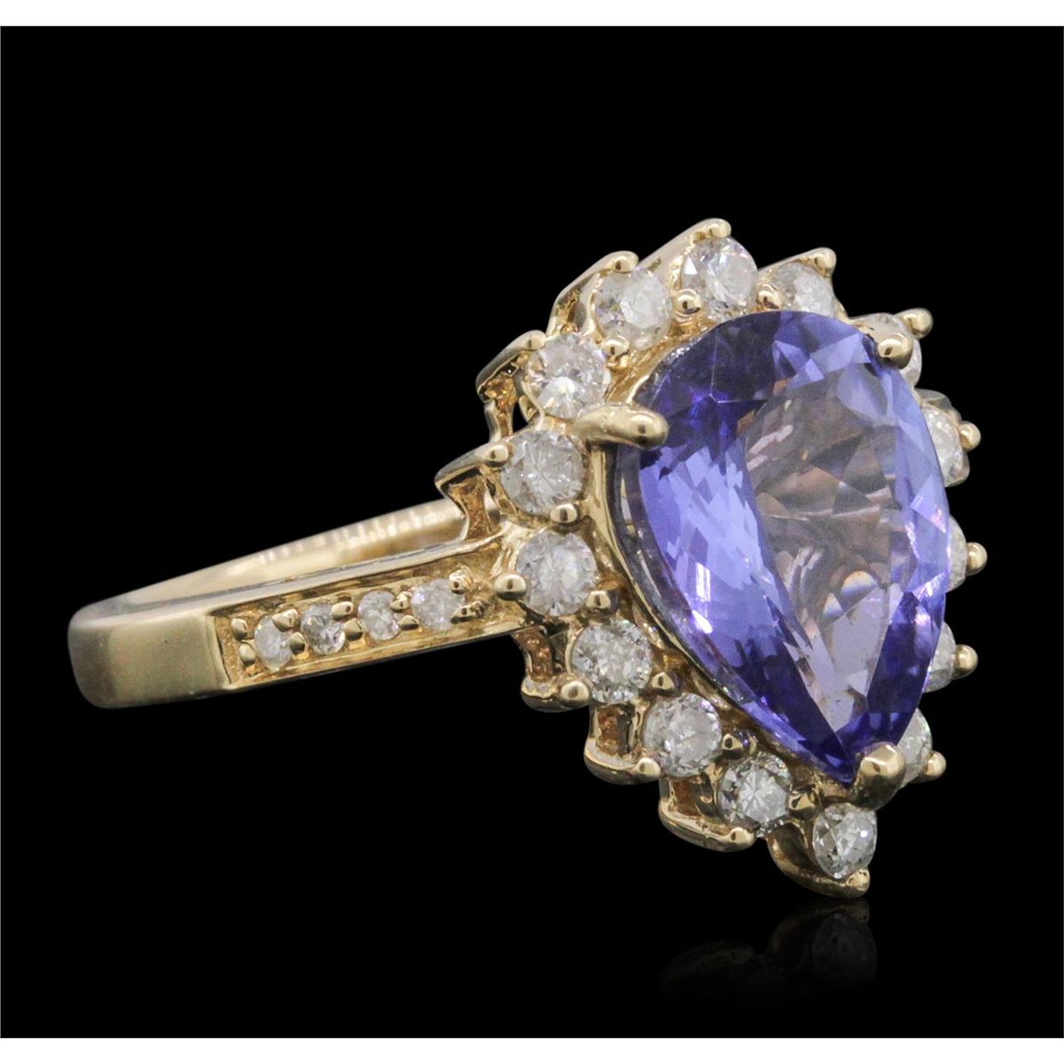 One electronically tested 14KT yellow gold ladies combination cast & assembled tanzanite and diamond ring with a flat shank with a bright polish finish. Identified with markings of "14K". Condition is new. Containing: One prong set pear modified brilliant cut natural tanzanite, measuring 10.50 x 7.91 x 5.14mm, approximate weight of 2.86ct., clarity is eye clean, type I, medium, very slightly grayish, violet color, (GIA V 5/3), cut is good. Fifteen prong set round brilliant cut diamonds, measuring 1.80 - 1.80 x 1.08mm (depth est.) approximate total weight of 15 Stones = 0.32ct. Clarity: I-1 to I-2. Color: J, Cut is Good. Eight prong set round brilliant cut diamonds, measuring 1.00 - 1.00 x 0.60mm (depth est.) approximate total weight of 8 Stones = 0.03ct. Clarity: I-1 to I-2. Color: J, Cut is Good. Colored gemstones are presumed to have been subjected to commonly used enhancement processes. All diamonds and colored gemstones are graded in the mounting, unless otherwise stated. Total Weight of Colored Stones 2.86ct. Total Weight of Diamonds 0.35ct. Total Weight of Ring 5.70 grams. GGL Appraised at $7,195.00.
