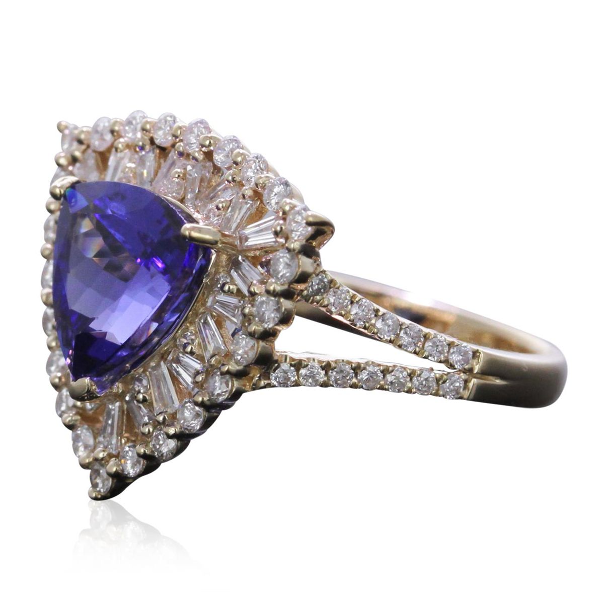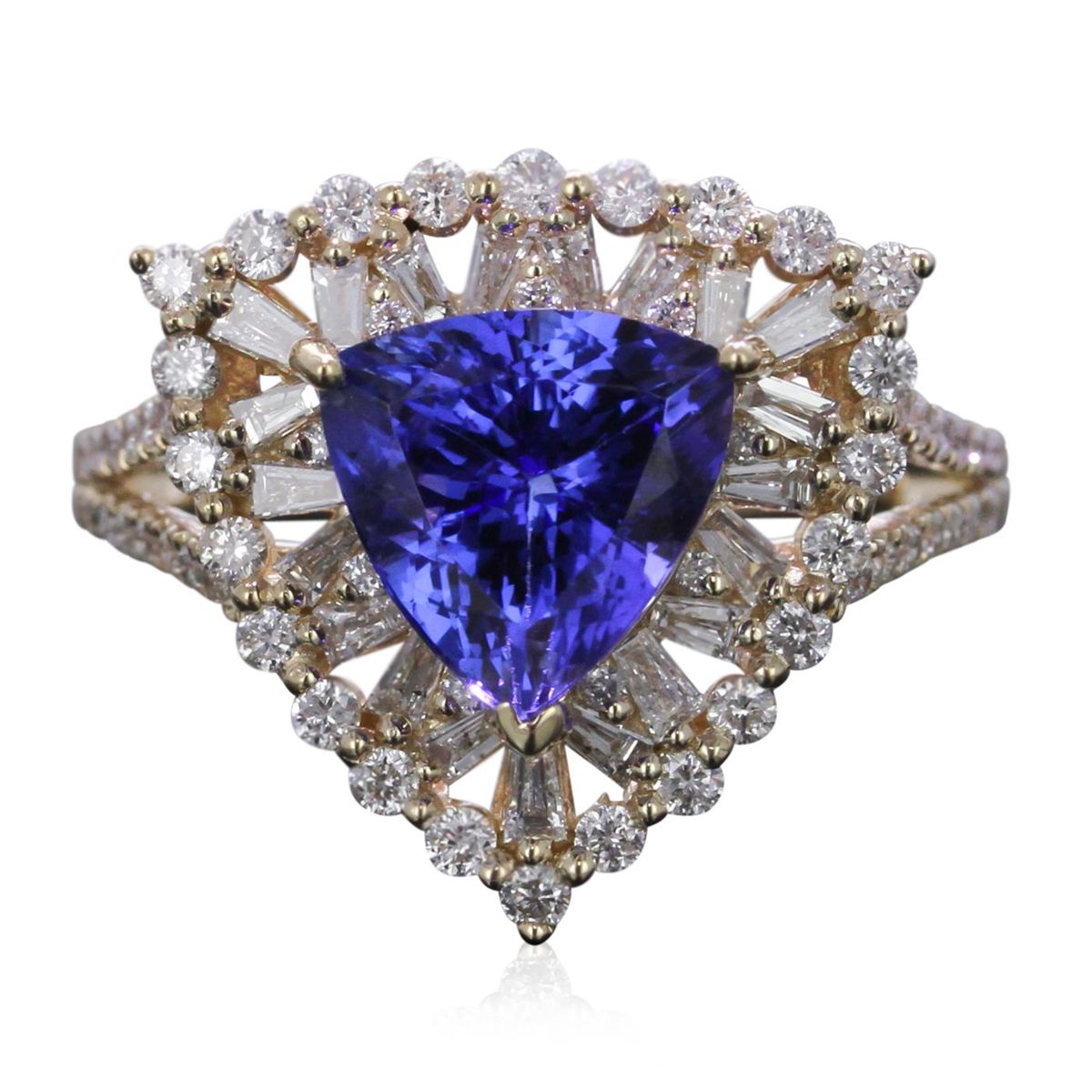 One electronically tested 14KT yellow gold Ladies combination cast & assembled ring with a bright polish finish. Identified with markings of "14K". Condition is new. Containing: Thirty-Seven prong set round brilliant cut diamonds, measuring 1.00 - 1.00 x 0.60mm (depth est.) approximate total weight of 37 Stones = 0.20ct. Clarity of I-1 to I-2, Color of H, Cut is Good. Twenty-Four prong set round brilliant cut diamonds, measuring 1.30 - 1.30 x 0.78mm (depth est.) approximate total weight of 24 Stones = 0.35ct. Clarity of I-1 to I-2, Color of H, Cut is Good. Nineteen prong set baguette cut diamonds, measuring 2.00 x 1.00 x 0.85mm (depth est.) approximate total weight of 19 Stones = 0.48ct. Clarity of SI-1 to SI-2, Color of J - K, Cut is Good. One prong set triangle modified brilliant cut natural tanzanite, measuring 9.00 x 9.00 x 5.85mm, approximate weight of 2.86ct., clarity is eye clean, type I, medium, moderately strong, blue color, (GIA B 5/4), cut is very good. Colored gemstones are presumed to have been subjected to commonly used color/clarity enhancement processes. Total Weight of Colored Stones 2.86ct. Total Weight of Diamonds 1.03ct. Total Weight of Ring 4.80 grams. GGL Appraised at $7,525.00.