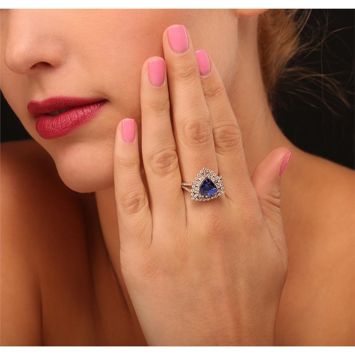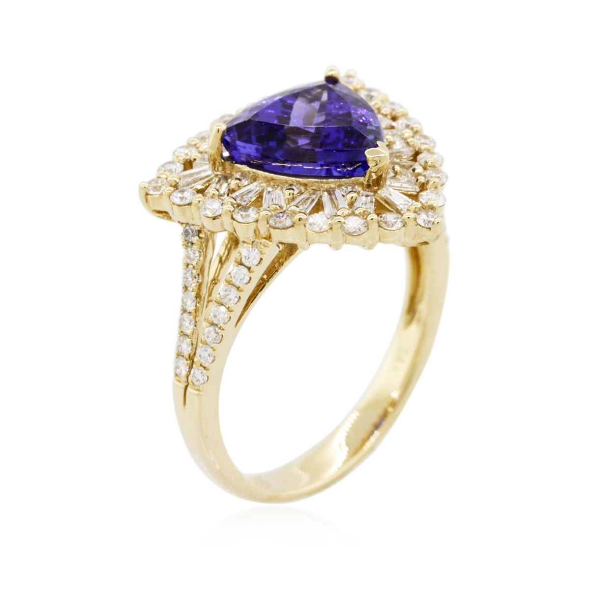 One electronically tested 14KT yellow gold Ladies combination cast & assembled ring with a bright polish finish. Identified with markings of "14K". Condition is new. Containing: Thirty-Seven prong set round brilliant cut diamonds, measuring 1.00 - 1.00 x 0.60mm (depth est.) approximate total weight of 37 Stones = 0.20ct. Clarity of I-1 to I-2, Color of H, Cut is Good. Twenty-Four prong set round brilliant cut diamonds, measuring 1.30 - 1.30 x 0.78mm (depth est.) approximate total weight of 24 Stones = 0.35ct. Clarity of I-1 to I-2, Color of H, Cut is Good. Nineteen prong set baguette cut diamonds, measuring 2.00 x 1.00 x 0.85mm (depth est.) approximate total weight of 19 Stones = 0.48ct. Clarity of SI-1 to SI-2, Color of J - K, Cut is Good. One prong set triangle modified brilliant cut natural tanzanite, measuring 9.00 x 9.00 x 5.85mm, approximate weight of 2.86ct., clarity is eye clean, type I, medium, moderately strong, blue color, (GIA B 5/4), cut is very good. Colored gemstones are presumed to have been subjected to commonly used color/clarity enhancement processes. Total Weight of Colored Stones 2.86ct. Total Weight of Diamonds 1.03ct. Total Weight of Ring 4.80 grams. GGL Appraised at $7,525.00.