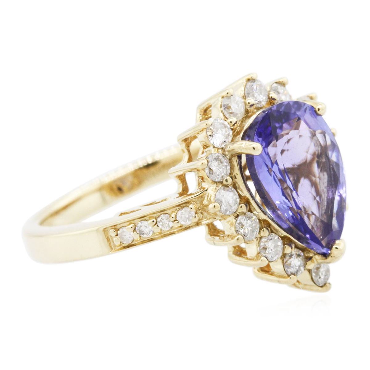 One electronically tested 14KT yellow gold ladies combination cast & assembled tanzanite and diamond ring with a flat shank with a bright polish finish. Identified with markings of "14K". Condition is new. Containing: One prong set pear modified brilliant cut natural tanzanite, measuring 10.50 x 7.91 x 5.14mm, approximate weight of 2.86ct., clarity is eye clean, type I, medium, very slightly grayish, violet color, (GIA V 5/3), cut is good. Fifteen prong set round brilliant cut diamonds, measuring 1.80 - 1.80 x 1.08mm (depth est.) approximate total weight of 15 Stones = 0.32ct. Clarity: I-1 to I-2. Color: J, Cut is Good. Eight prong set round brilliant cut diamonds, measuring 1.00 - 1.00 x 0.60mm (depth est.) approximate total weight of 8 Stones = 0.03ct. Clarity: I-1 to I-2. Color: J, Cut is Good. Colored gemstones are presumed to have been subjected to commonly used enhancement processes. All diamonds and colored gemstones are graded in the mounting, unless otherwise stated. Total Weight of Colored Stones 2.86ct. Total Weight of Diamonds 0.35ct. Total Weight of Ring 5.70 grams. GGL Appraised at $7,195.00.