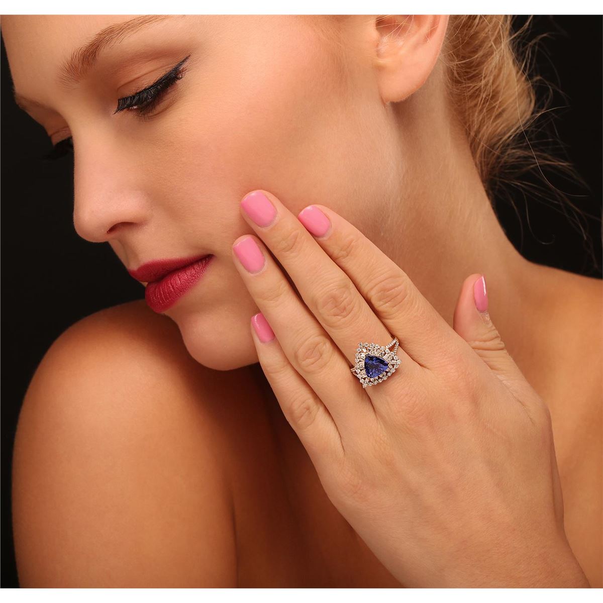 One electronically tested 14KT yellow gold Ladies combination cast & assembled ring with a bright polish finish. Identified with markings of "14K". Condition is new. Containing: Thirty-Seven prong set round brilliant cut diamonds, measuring 1.00 - 1.00 x 0.60mm (depth est.) approximate total weight of 37 Stones = 0.20ct. Clarity of I-1 to I-2, Color of H, Cut is Good. Twenty-Four prong set round brilliant cut diamonds, measuring 1.30 - 1.30 x 0.78mm (depth est.) approximate total weight of 24 Stones = 0.35ct. Clarity of I-1 to I-2, Color of H, Cut is Good. Nineteen prong set baguette cut diamonds, measuring 2.00 x 1.00 x 0.85mm (depth est.) approximate total weight of 19 Stones = 0.48ct. Clarity of SI-1 to SI-2, Color of J - K, Cut is Good. One prong set triangle modified brilliant cut natural tanzanite, measuring 9.00 x 9.00 x 5.85mm, approximate weight of 2.86ct., clarity is eye clean, type I, medium, moderately strong, blue color, (GIA B 5/4), cut is very good. Colored gemstones are presumed to have been subjected to commonly used color/clarity enhancement processes. Total Weight of Colored Stones 2.86ct. Total Weight of Diamonds 1.03ct. Total Weight of Ring 4.80 grams. GGL Appraised at $7,525.00.