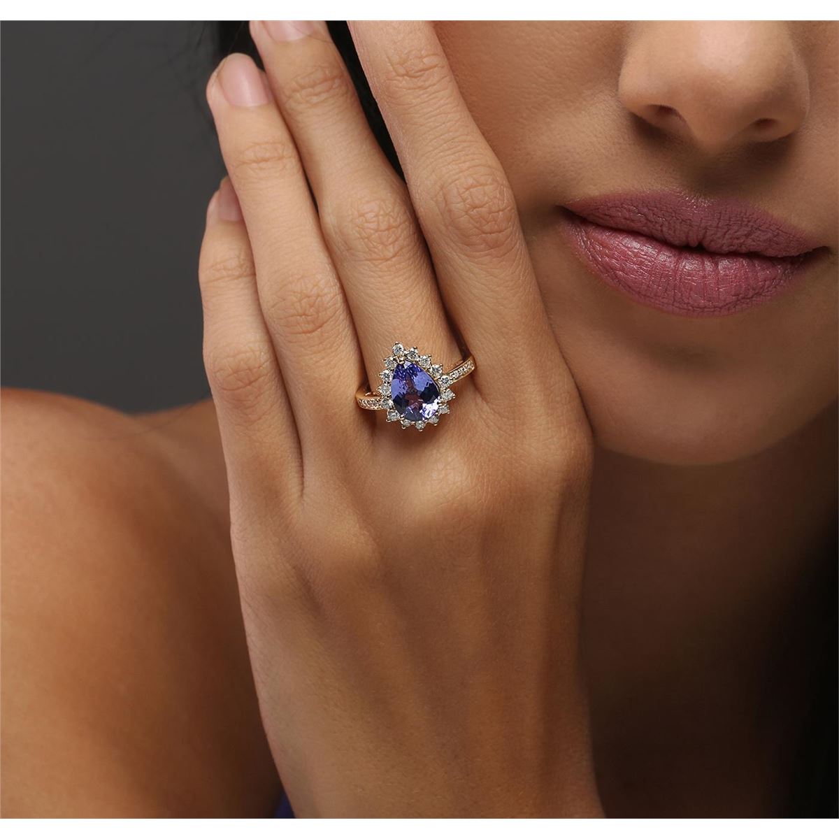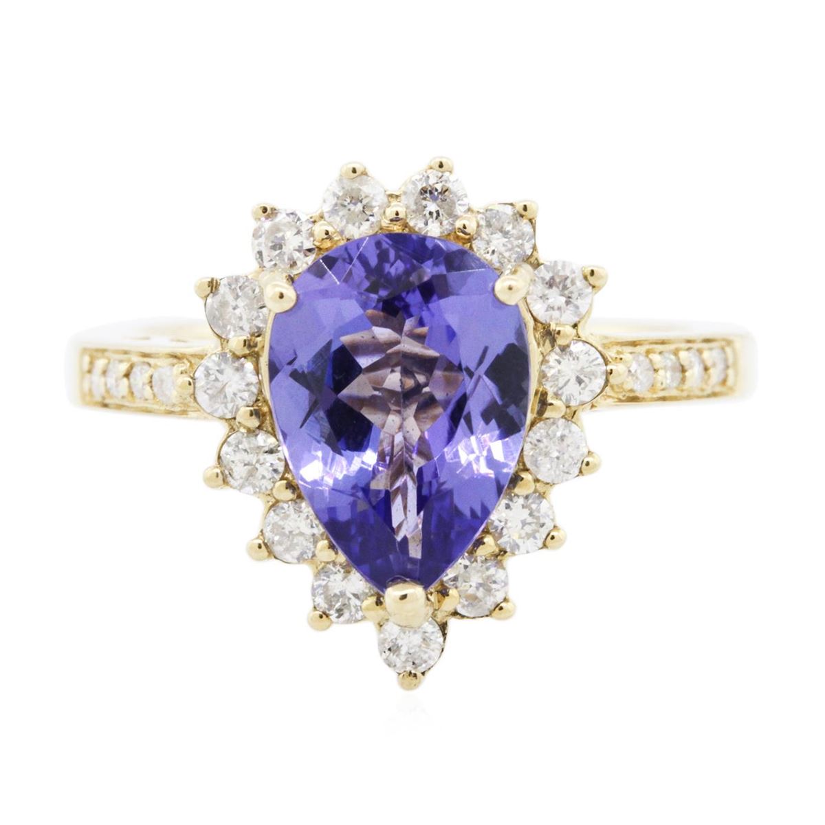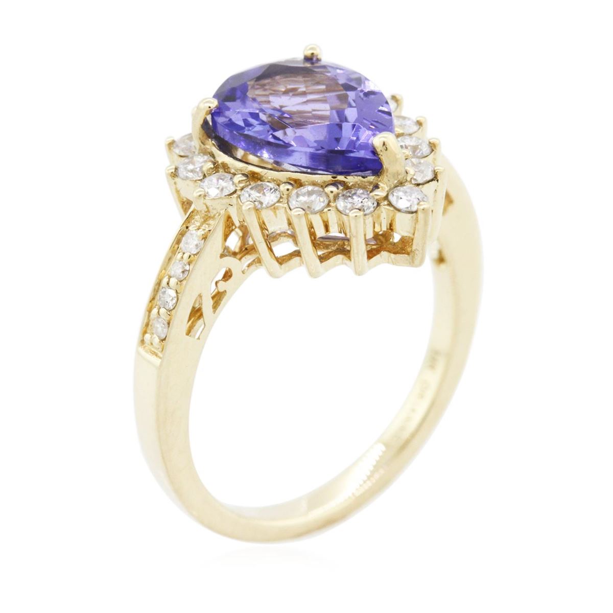 One electronically tested 14KT yellow gold ladies combination cast & assembled tanzanite and diamond ring with a flat shank with a bright polish finish. Identified with markings of "14K". Condition is new. Containing: One prong set pear modified brilliant cut natural tanzanite, measuring 10.50 x 7.91 x 5.14mm, approximate weight of 2.86ct., clarity is eye clean, type I, medium, very slightly grayish, violet color, (GIA V 5/3), cut is good. Fifteen prong set round brilliant cut diamonds, measuring 1.80 - 1.80 x 1.08mm (depth est.) approximate total weight of 15 Stones = 0.32ct. Clarity: I-1 to I-2. Color: J, Cut is Good. Eight prong set round brilliant cut diamonds, measuring 1.00 - 1.00 x 0.60mm (depth est.) approximate total weight of 8 Stones = 0.03ct. Clarity: I-1 to I-2. Color: J, Cut is Good. Colored gemstones are presumed to have been subjected to commonly used enhancement processes. All diamonds and colored gemstones are graded in the mounting, unless otherwise stated. Total Weight of Colored Stones 2.86ct. Total Weight of Diamonds 0.35ct. Total Weight of Ring 5.70 grams. GGL Appraised at $7,195.00.