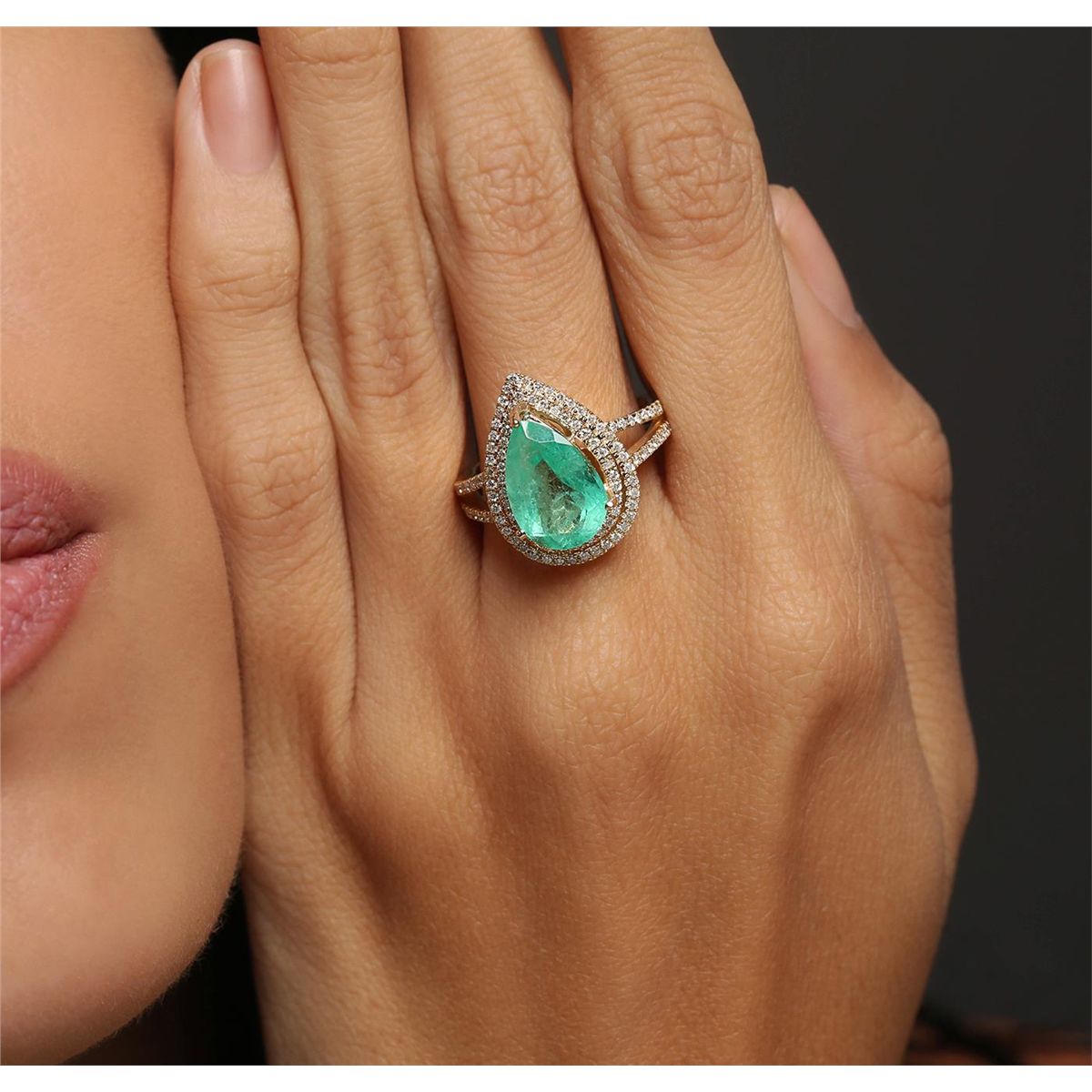 One electronically tested 14KT yellow gold ladies combination cast & assembled ring with a bright polish finish. Identified with markings of "14K". Condition is new. Containing: One prong set pear modified brilliant cut natural emerald, measuring 12.01 x 8.82 x 4.99mm, approximate weight of 2.88ct., clarity is heavily included, type III, medium light, very slightly grayish, very slightly bluish green color, (GIA vslbG 4/3), cut is good. One Hundred Four prong set round brilliant cut diamonds, measuring 1.10 - 1.10 x 0.66mm (depth est.) approximate total weight of 104 Stones = 0.50ct. Clarity: I-1 to I-2. Color: K - L, Cut is Good. Colored gemstones are presumed to have been subjected to commonly used enhancement processes. All diamonds and colored gemstones are graded in the mounting, unless otherwise stated. Total Weight of Colored Stones 2.88ct. Total Weight of Diamonds 0.50ct. Total Weight of Ring 6.40 grams. GGL Appraised at $8,300.00.