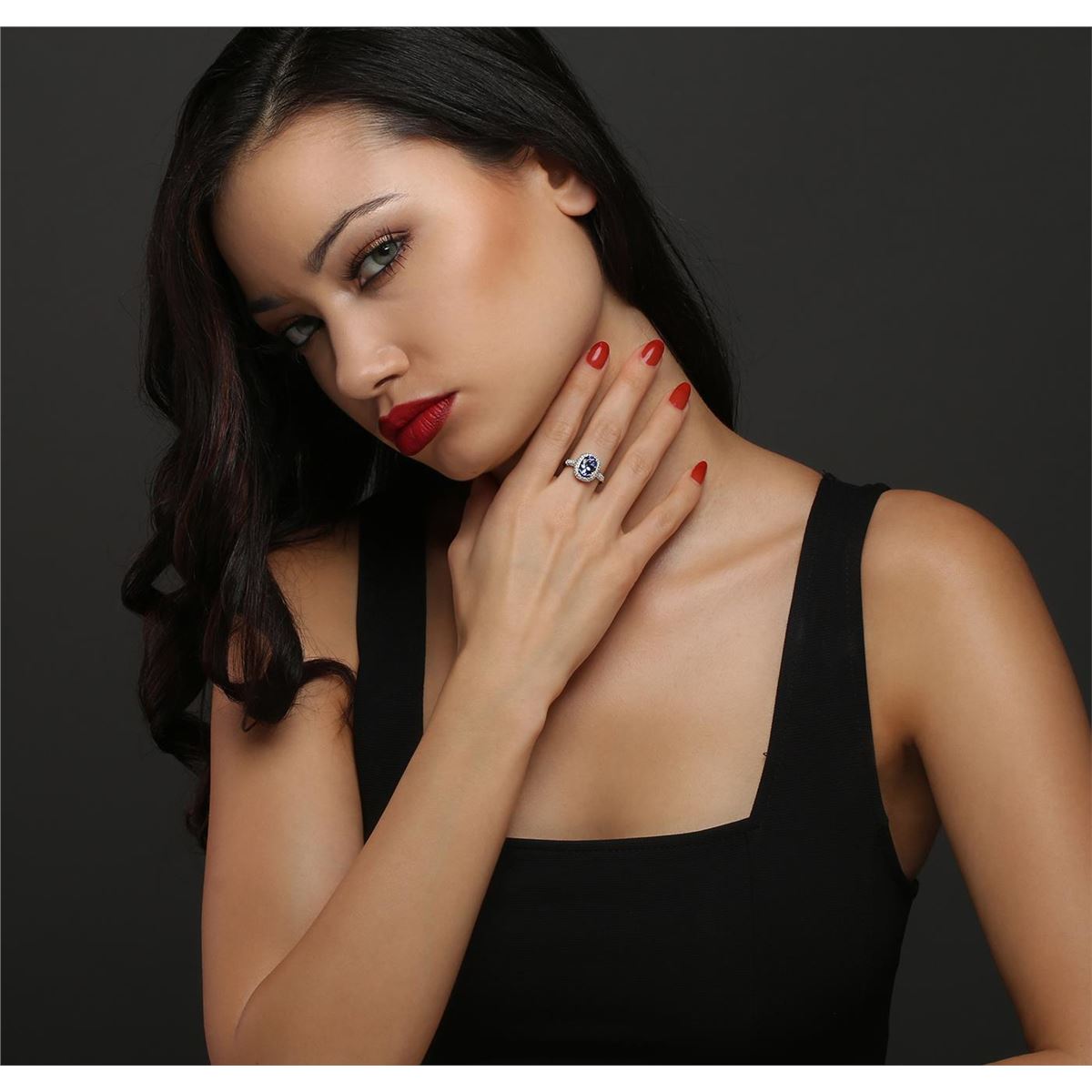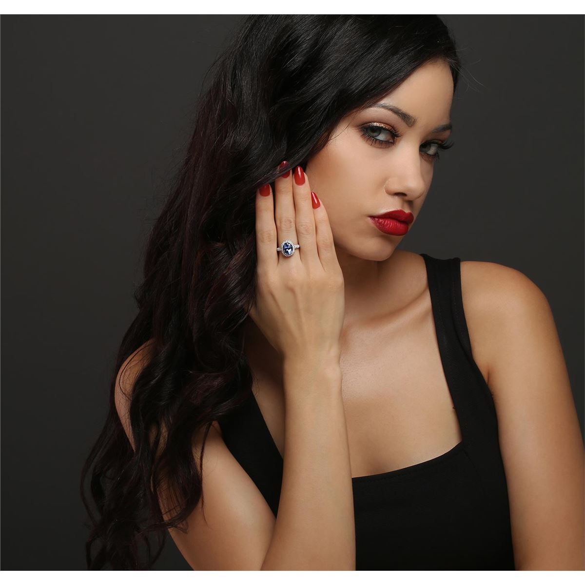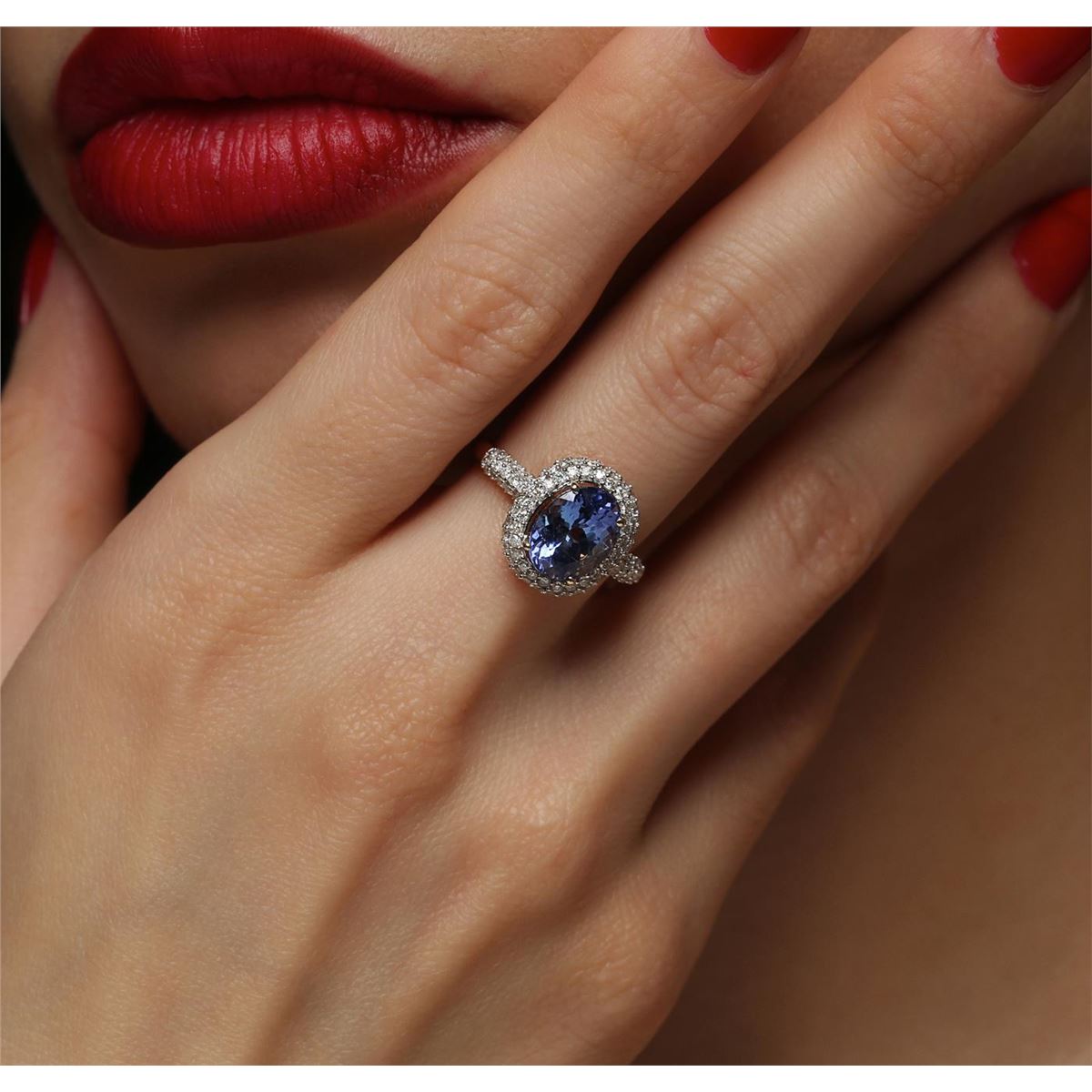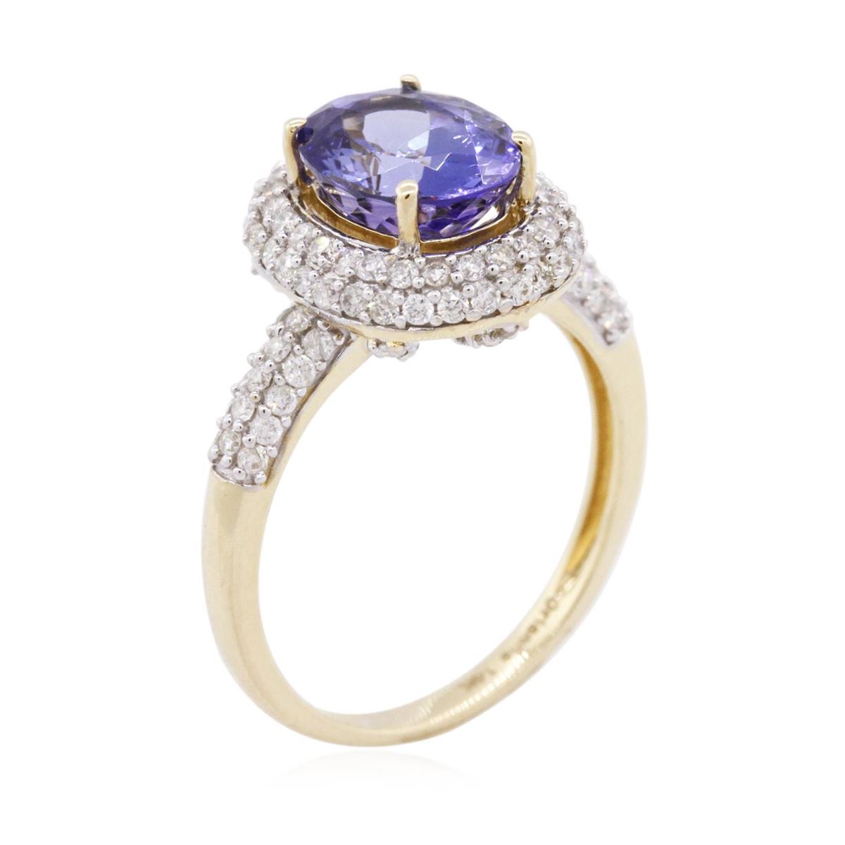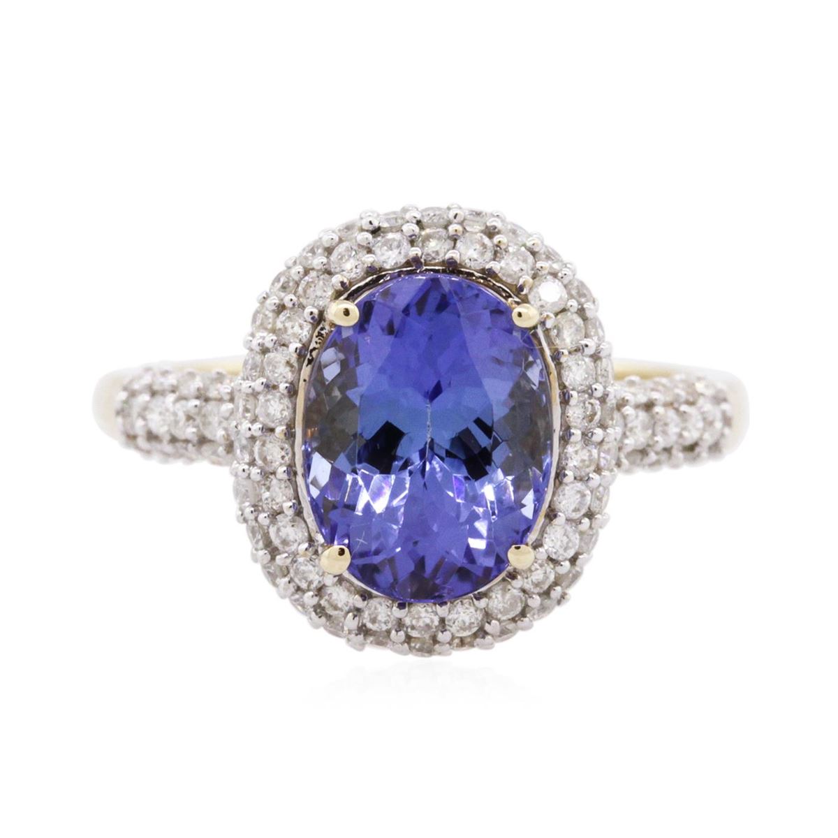 One electronically tested 14KT yellow gold ladies cast tanzanite and diamond ring. The featured tanzanite is set within a tiered diamond bezel supported by diamond set shoulders, completed by a two millimeter wide band. Bright polish finish with rhodium accents. Trademark is Orianne. Identified with markings of "14K". Condition is new, good workmanship. Containing: One prong set oval mixed cut natural tanzanite, measuring 9.80 x 7.45 x 5.50mm, 6% bulge factor, approximate weight of 2.91ct., clarity is eye clean, type I, medium dark, very slightly grayish, bluish violet color, (GIA bV 6/3), cut is good. Transmitting light with no distortion, transparent. Graded in the setting. Tanzanite is a very rare gemstone that is only found in the country of Tanzania. Originally discovered in 1967. Tiffany & Company, named the stone Tanzanite. It is found in the Usumburu Mountains that border the Umba Valley of northern Tanzania. Tanzanite occurs in gray, brown, violet, blue, reddish-purple, & green. The gem is interesting because of its exceptional pleochroism. Rotated in different directions a tanzanite will exhibit multiple changes of color. Tanzanite has a low tolerance to ultrasonic cleaning, and should not be cleaned using this method. One Hundred Four prong set round brilliant cut diamonds, measuring 1.40 - 1.30 x 0.81mm (depth est.) approximate total weight of 104 Stones = 1.04ct. Graded in the setting. Clarity: I-1 to I-2. Color: H - J. Total Weight of Colored Stones 2.91ct. Total Weight of Diamonds 1.04ct. Total Weight of Ring 4.09 grams. AIG Appraised at $9,945.00.