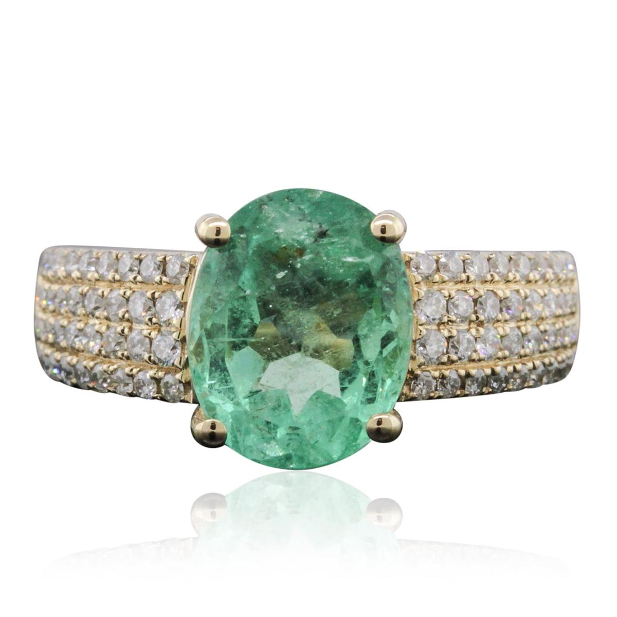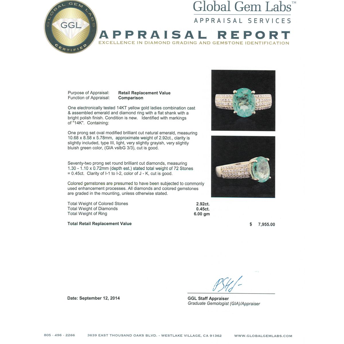 One electronically tested 14KT yellow gold ladies combination cast & assembled emerald and diamond ring with a flat shank with a bright polish finish. Identified with markings of "14K". Condition is new. Containing: One prong set oval modified brilliant cut natural emerald, measuring 10.68 x 8.58 x 5.78mm, approximate weight of 2.92ct., clarity is slightly included, type III, light, very slightly grayish, very slightly bluish green color, (GIA vslbG 3/3), cut is good. Seventy-Two prong set round brilliant cut diamonds, measuring 1.30 - 1.10 x 0.72mm (depth est.) stated total weight of 72 Stones = 0.45ct. Clarity: I-1 to I-2. Color: J - K, Cut is Good. Colored gemstones are presumed to have been subjected to commonly used enhancement processes. All diamonds and colored gemstones are graded in the mounting, unless otherwise stated total weight of Colored Stones 2.92ct. Total Weight of Diamonds 0.45ct. Total Weight of Ring 6.00 grams. GGL Appraised at $7,955.00.