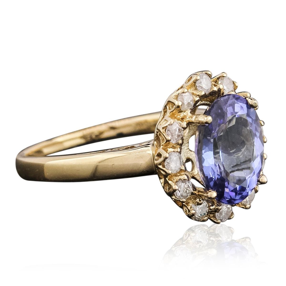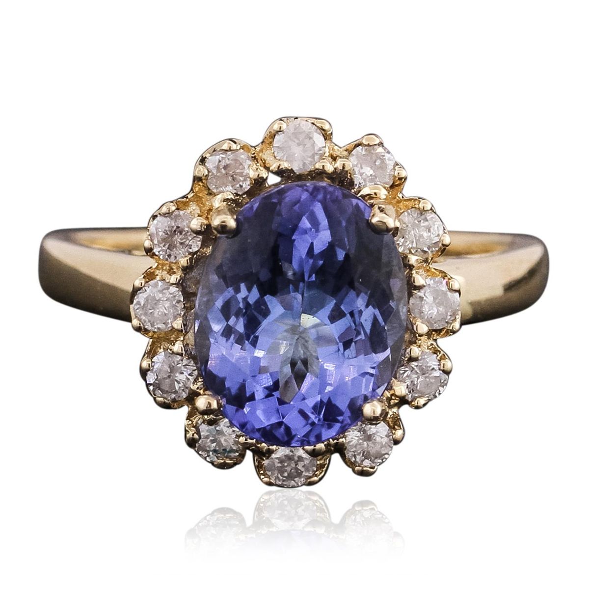 One electronically tested 14KT yellow gold ladies combination cast & assembled tanzanite and diamond ring with a flat shank with a bright polish finish. Identified with markings of "14K". Condition is new. Containing: One prong set oval modified brilliant cut natural tanzanite, measuring 10.00 x 8.14 x 5.29mm, approximate weight of 2.92ct., clarity is eye clean, type I, medium light, very slightly grayish, violet color, (GIA V 4/3), cut is good. Twelve prong set round brilliant cut diamonds, measuring 1.90 - 1.90 x 1.14mm (depth est.) approximate total weight of 12 Stones = 0.30ct. Clarity: SI-2 to I-2. Color: J - K, Cut is Good. Colored gemstones are presumed to have been subjected to commonly used enhancement processes. All diamonds and colored gemstones are graded in the mounting, unless otherwise stated. Total Weight of Colored Stones 2.92ct. Total Weight of Diamonds 0.30ct. Total Weight of Ring 3.80 grams. GGL Appraised at $5,960.00.