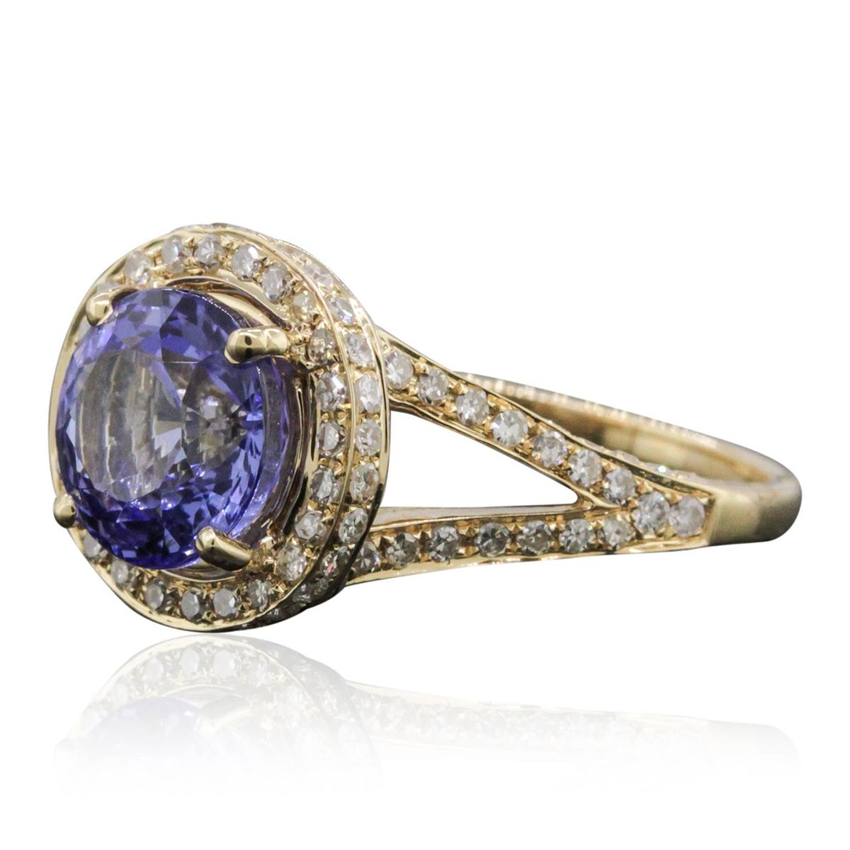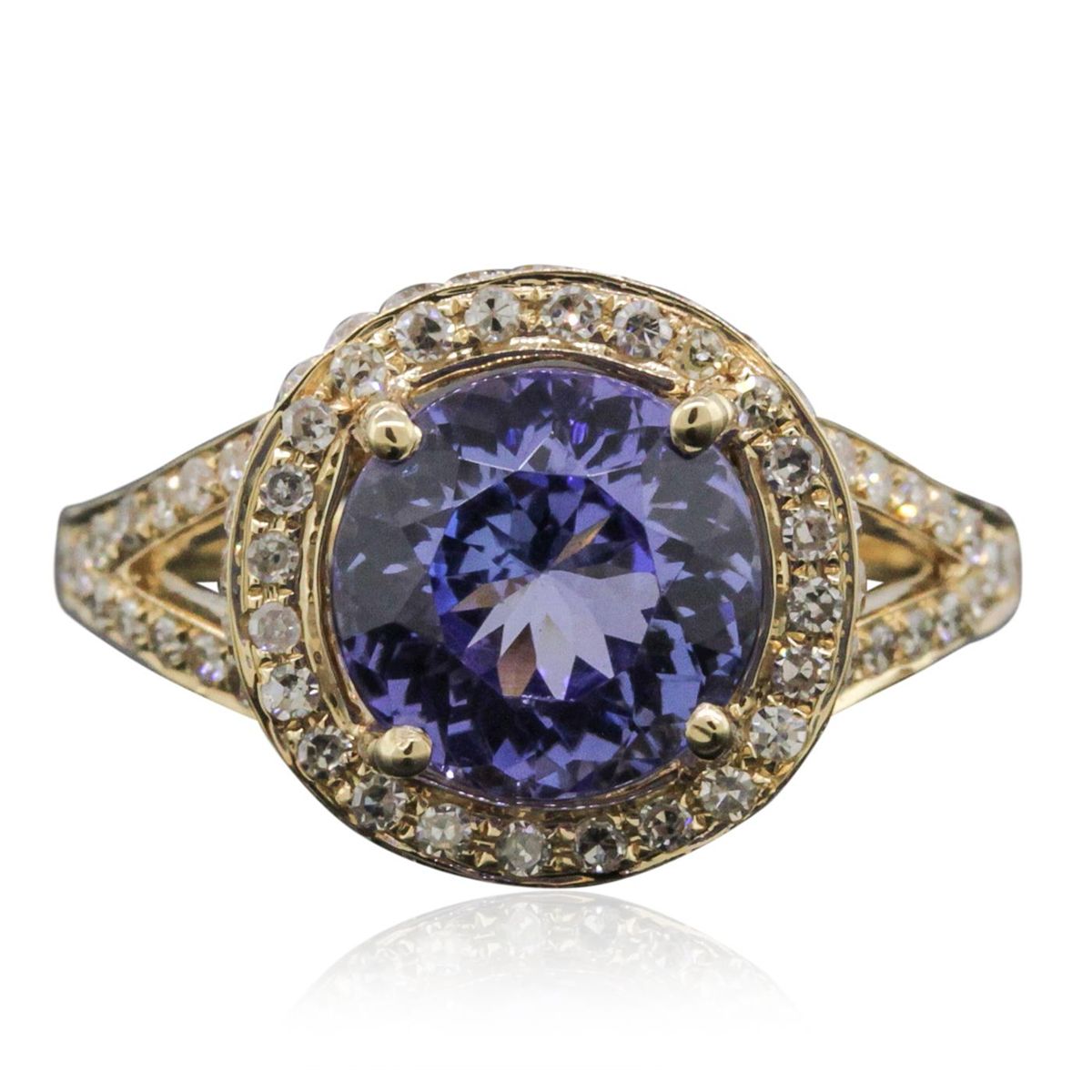 One electronically tested 14KT yellow gold ladies combination cast & assembled tanzanite and diamond ring with a split shank with a bright polish finish. Identified with markings of "14K". Condition is new. Containing: One prong set round modified brilliant cut natural tanzanite, measuring 8.80 - 8.76 x 5.71 mm, approximate weight of 2.96ct., clarity is eye clean, type I, medium light, very slightly grayish, violet color, (GIA V 4/3), cut is good. One Hundred Fifty-Three prong set single cut diamonds, measuring 1.00 - 1.00 x 0.60mm (depth est.) approximate total weight of 153 Stones = 0.55ct. Clarity: SI-1 to SI-2. Color: J, Cut is Good. Colored gemstones are presumed to have been subjected to commonly used enhancement processes. All diamonds and colored gemstones are graded in the mounting, unless otherwise stated. Total Weight of Colored Stones 2.96ct. Total Weight of Diamonds 0.55ct. Total Weight of Ring 5.10 grams. GGL Appraised at $7,305.00.