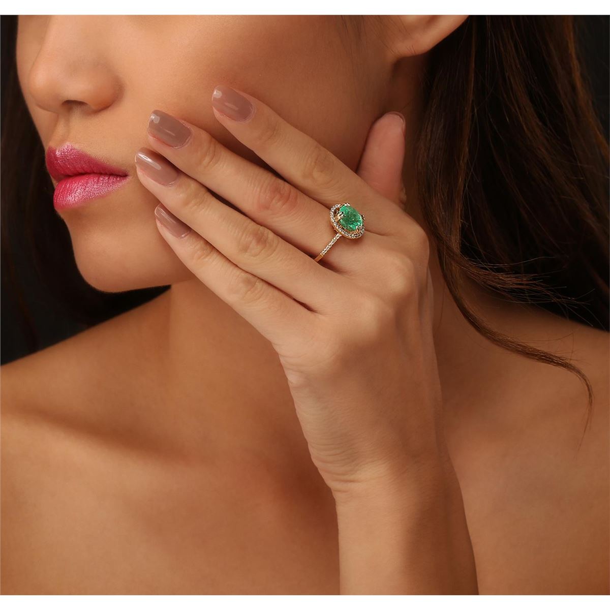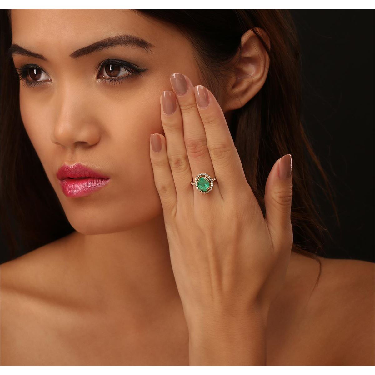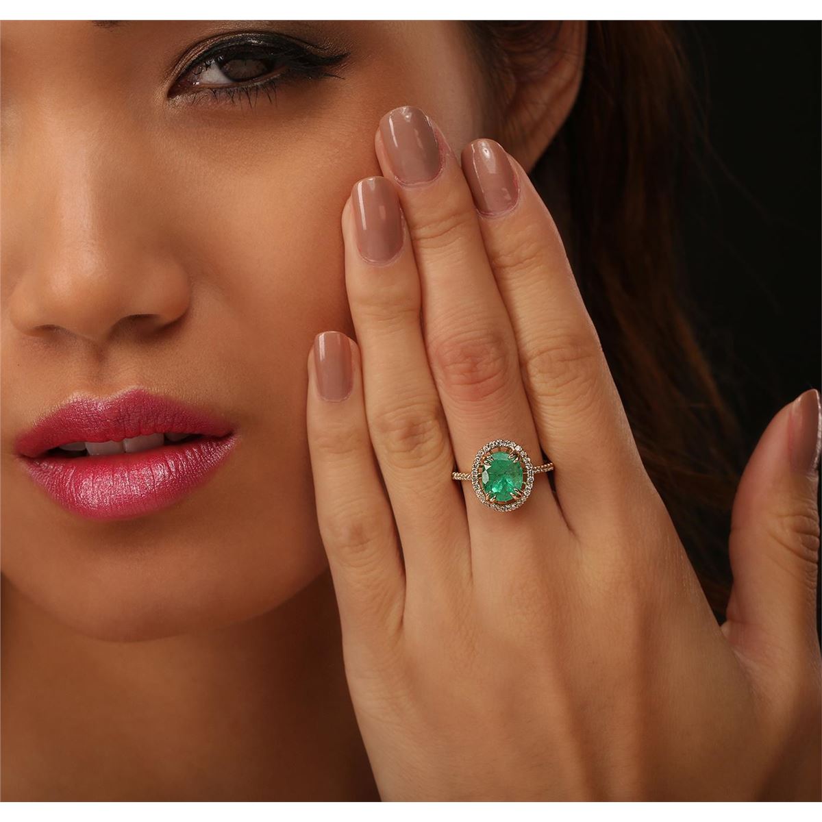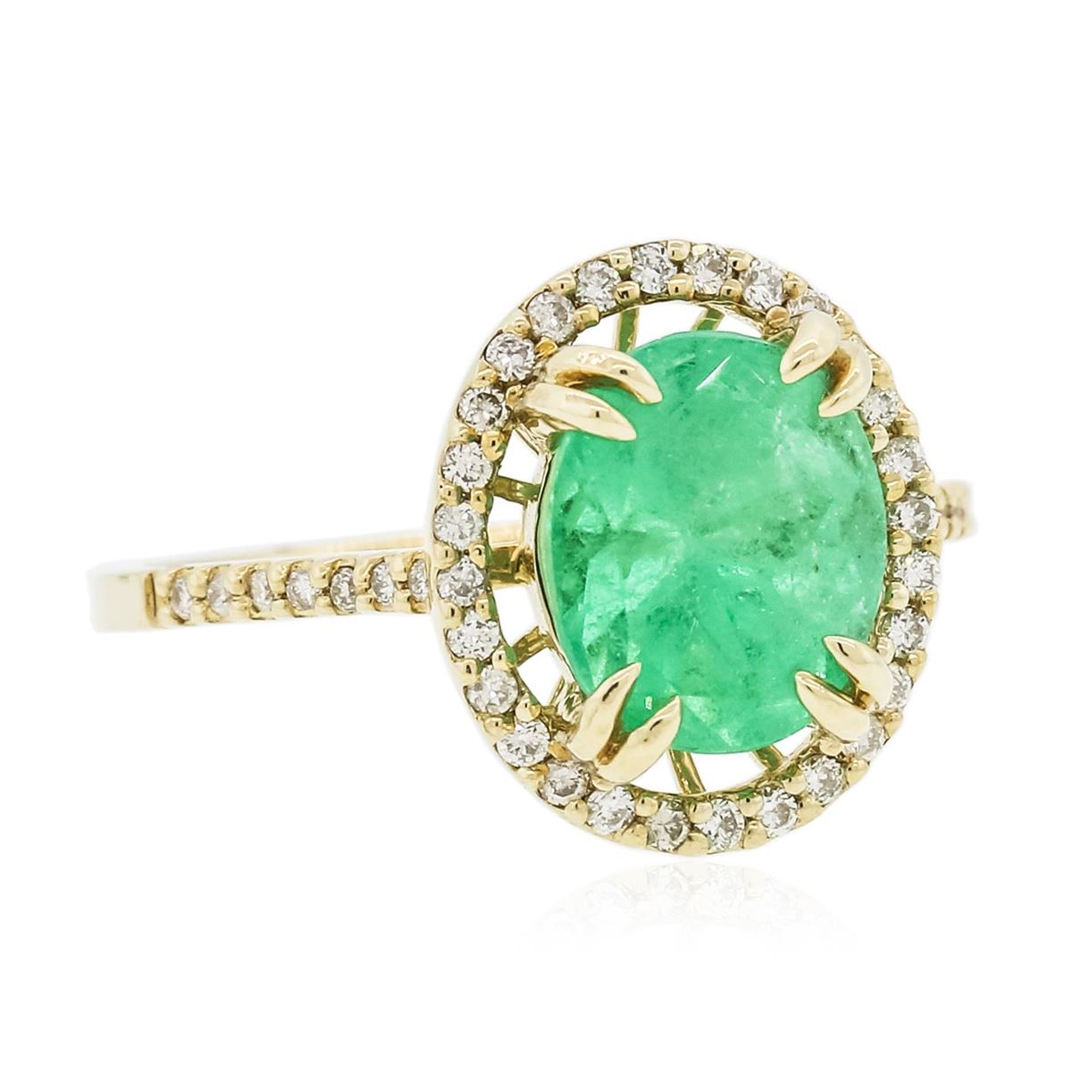 One electronically tested 14KT yellow gold ladies cast emerald and diamond ring with a bright polish finish. The featured emerald is set within a diamond bezel supported by diamond set shoulders, completed by a one and one-half millimeter wide band. Trademark is PMI. Identified with markings of "14K". Condition is new, good workmanship. Containing: One prong set oval mixed cut natural emerald, measuring 9.25 x 7.75 x 7.00mm, 8%. bulge factor, approximate weight of 2.97ct., clarity is heavily included, type III, medium, moderately strong, green color, (GIA G 5/4), cut is good. Transmitting light with a minimum of distortion, transparent. Naturally occurring internal & external characteristics are present. Indications of oil residue. Graded in the setting. Forty-Two prong set round brilliant cut diamonds, measuring 1.20 - 1.10 x 0.69mm (depth est.) approximate total weight of 42 Stones = 0.33ct. Graded in the setting. Clarity: SI-1 to I-1. Color: G - I. Total Weight of Colored Stones 2.97ct. Total Weight of Diamonds 0.33ct. Total Weight of Ring 3.58 grams. AIG Appraised at $5,260.00.