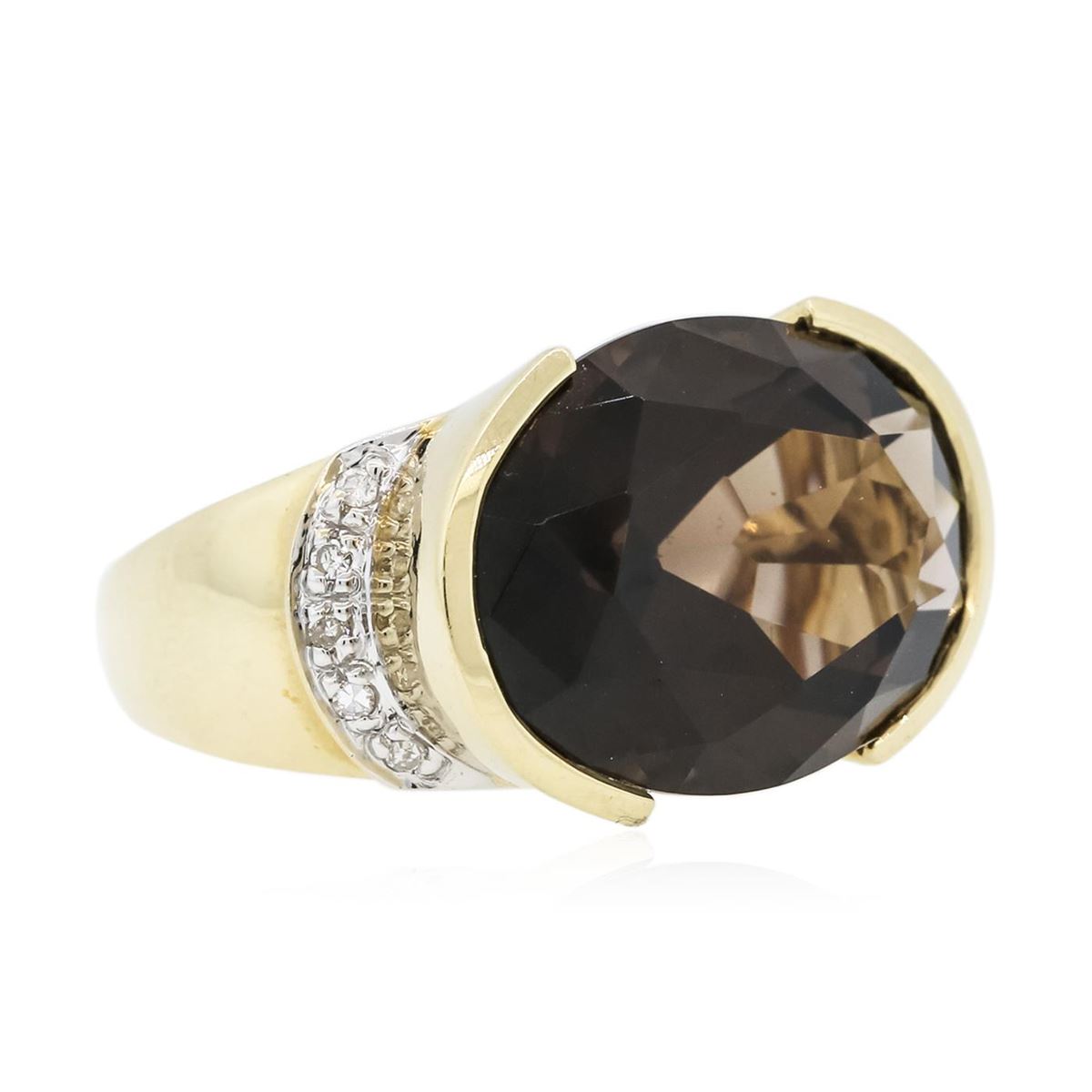 One electronically tested 14KT yellow gold ladies combination cast & assembled vintage ring with a bright polish finish. Identified with markings of "14K". Condition is very good. Containing: One half bezel set oval modified brilliant cut natural smoky quartz, measuring 24.00 x 15.00 x 10.57mm, approximate weight of 20.17ct., clarity is eye clean, medium, very slightly grayish, brown color, (GIA Br 5/3), cut is good. Ten prong set single cut diamonds, measuring 1.30 - 1.30 x 0.78mm (depth est.) approximate total weight of 10 Stones = 0.08ct. Clarity: SI-2. Color: J - K, Cut is Good. Colored gemstones are presumed to have been subjected to commonly used enhancement processes. All diamonds and colored gemstones are graded in the mounting, unless otherwise stated. Total Weight of Colored Stones 20.17ct. Total Weight of Diamonds 0.08ct. Total Weight of Ring 14.80 grams. GGL Appraised at $5,905.00.