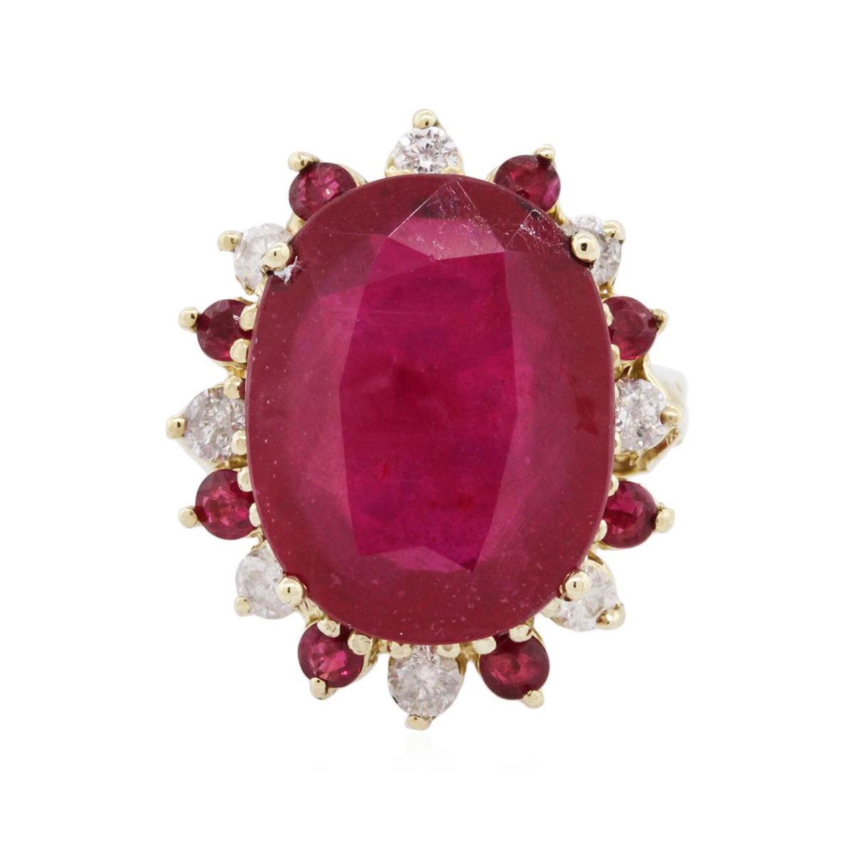 One electronically tested 14KT yellow gold ladies cast ruby and diamond ring with a bright polish finish. Identified with markings of "14K". Condition is new. Containing: One prong set oval modified brilliant cut natural ruby, measuring 17.45 x 14.45 x 9.39mm, approximate weight of 20.14ct., clarity is heavily included, medium dark, very slightly grayish, reddish purple color, (GIA rP 6/3), cut is good. Eight prong set round modified brilliant cut natural rubies, measuring 2.30 - 2.30 x 1.50 mm, approximate total weight of 0.48ct., clarity is heavily included, medium dark, very slightly brownish, strongly purplish red color, (GIA stpR 6/3), cut is good. Eight prong set round brilliant cut diamonds, measuring 2.50 - 2.50 x 1.50mm (depth est.) approximate total weight of 8 Stones = 0.46ct. Clarity: I-1 to I-2. Color: I - J, Cut is Good. Colored gemstones are presumed to have been subjected to commonly used enhancement processes. All diamonds and colored gemstones are graded in the mounting, unless otherwise stated. Total Weight of Colored Stones 20.62ct. Total Weight of Diamonds 0.46ct. Total Weight of Ring 9.10 grams. GGL Appraised at $4,885.00.
