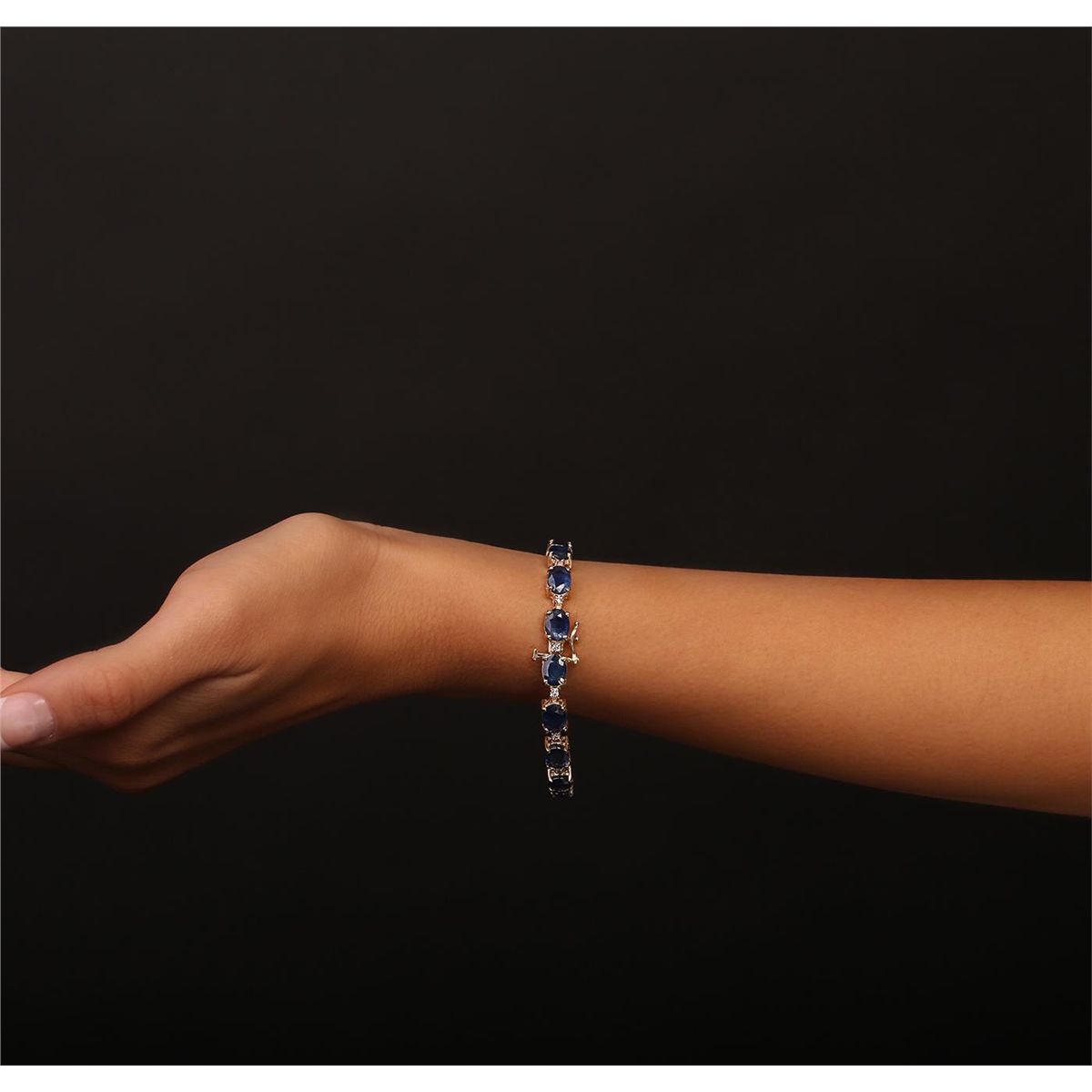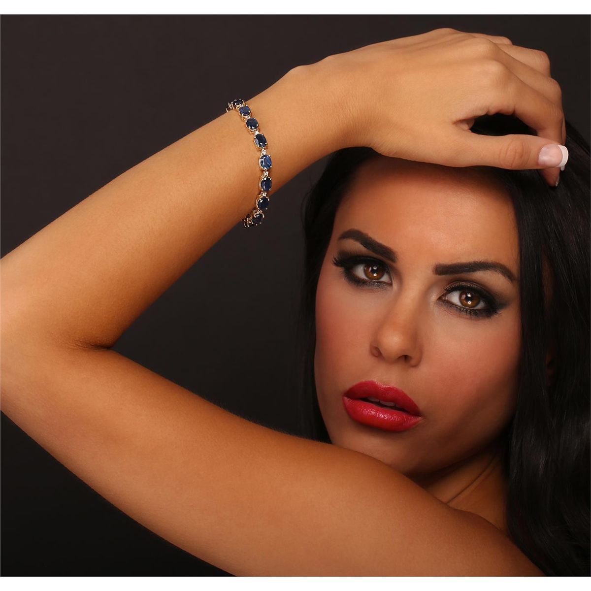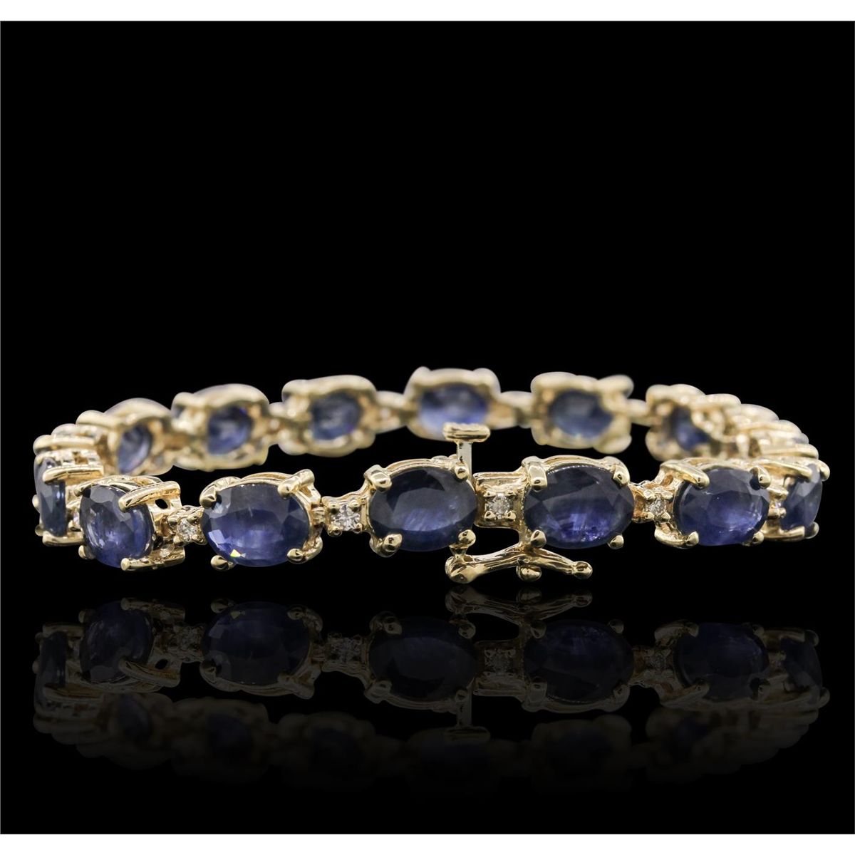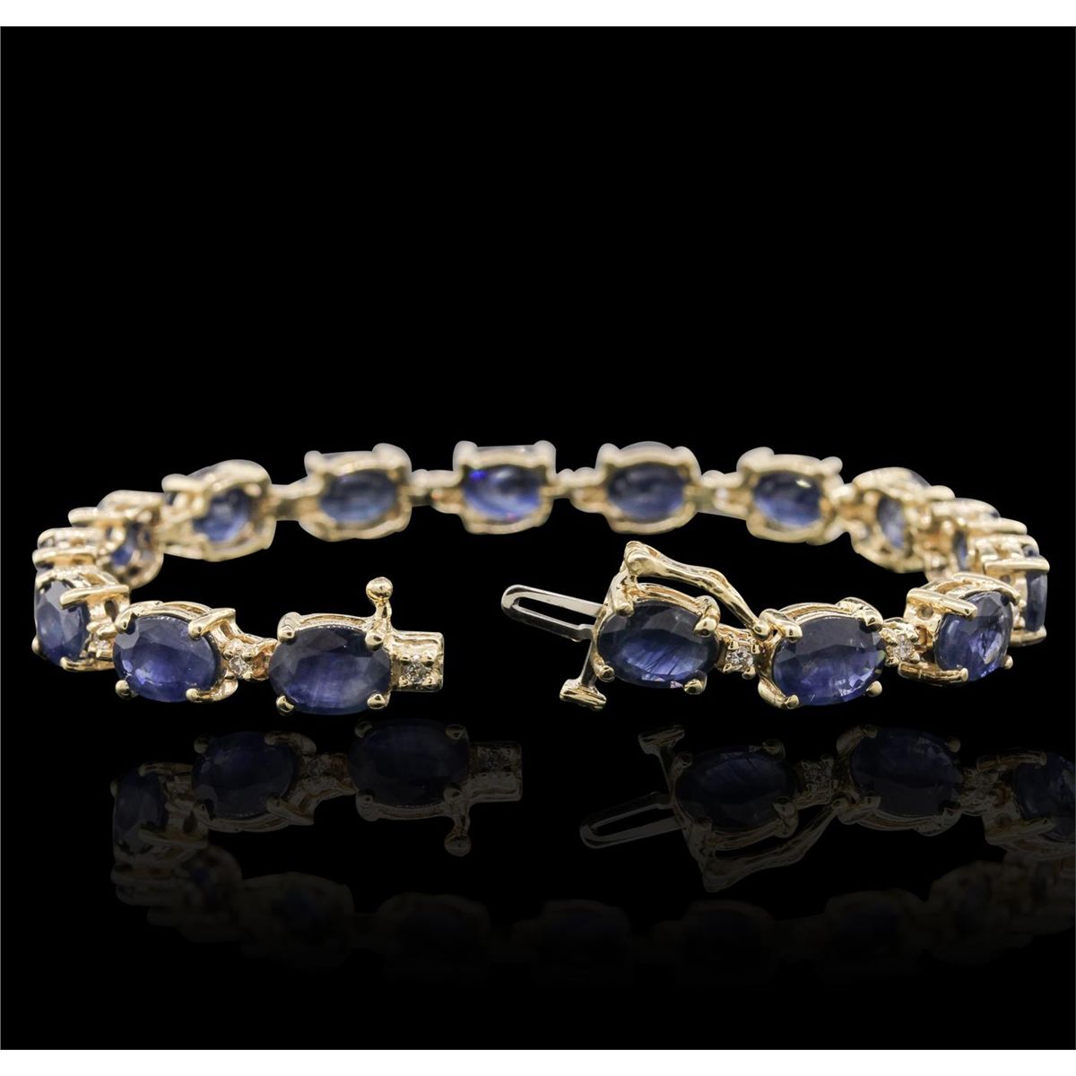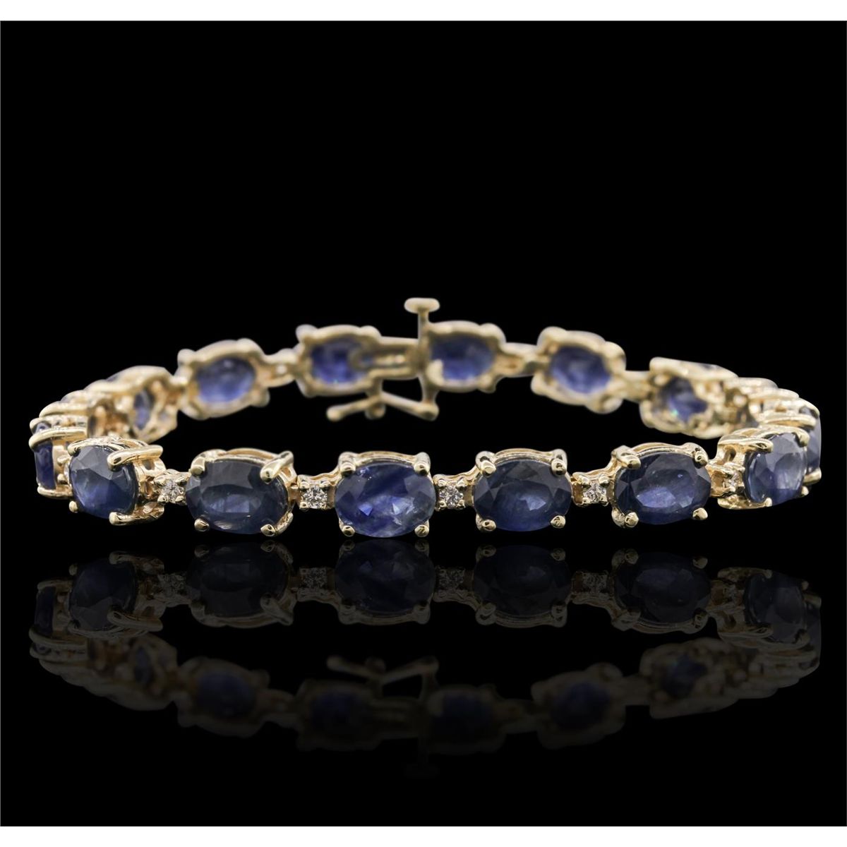 One electronically tested 14KT yellow gold Ladies combination cast & assembled bracelet with a hidden box clasp with a bright polish finish. Condition is new. Measurements: 7" in length. Identified with markings of "14K". Containing: Sixteen prong set oval modified brilliant cut natural blue sapphires, measuring 8.00 x 6.00 x 3.30mm, approximate. Total Weight of 20.64ct., clarity is heavily included, type II, medium, moderately strong, blue color, (GIA B 5/4), cut is good. Colored gemstones are presumed to have been subjected to commonly used color/clarity enhancement processes. Sixteen prong set round brilliant cut diamonds, measuring 1.50 - 1.50 x 0.90mm (depth est.) approximate. Total Weight of 16 Stones = 0.20ct. Clarity: SI-1 to SI-2. Color: J - K, Cut is Good. Total Weight of Colored Stones 20.64ct. Total Weight of Diamonds 0.20ct. Total Weight of Bracelet 18.60 grams. GGL Appraised at $17,560.00.