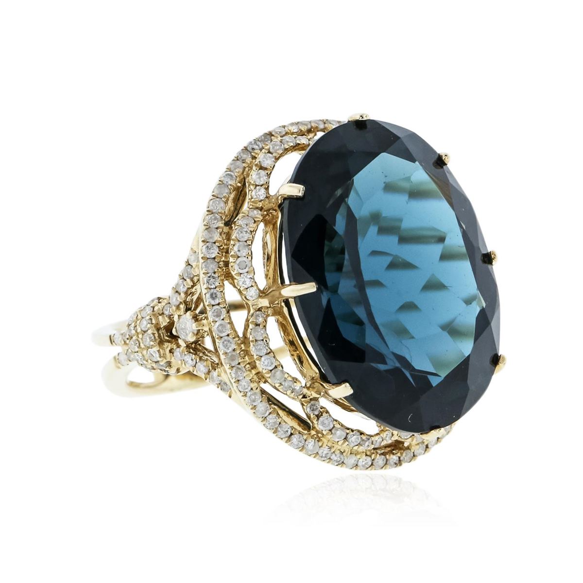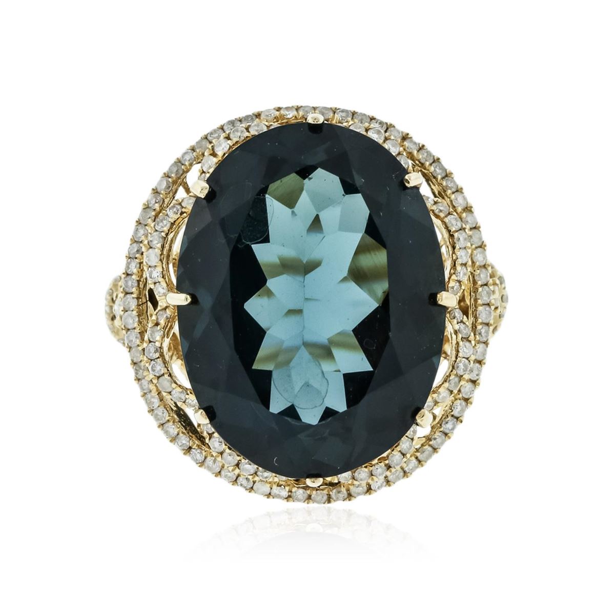 One electronically tested 14KT yellow gold ladies cast topaz and diamond ring with a bright polish finish. The featured topaz is set within a diamond lattice gallery, supported by diamond set split shoulders and completed by a single band split in two, one millimeter wide each. Trademark is Orianne. Identified with markings of "14K". Condition is new, good workmanship. Containing: One prong set oval mixed cut natural blue topaz, measuring 19.70 x 14.00. x 9.00.mm, 8%. bulge factor, approximate weight of 20.72ct., clarity is eye clean, type I, dark, very slightly grayish, very slightly greenish blue color, (GIA vslgB 7/3), cut is good. Transmitting light with no distortion, transparent. Graded in the setting.A deposit of a thin layer has been applied to the topaz to produce the intense color effect. The process utilizes a very high temperature treatment, diffusion of ions into the topaz, plus in some cases neutron bombardment has been used to create the color center. Diffusion processes causes the added ions to become part of the crystal surface with no distinct boundary. Do not put a gem treated in this manner into an ultrasonic cleaner. One Hundred Seventy-Three prong set round brilliant cut diamonds, measuring 1.70 - 0.90 x 0.78mm (depth est.) approximate. Total Weight of 173 Stones = 0.67ct. Graded in the setting. Clarity: I-2 to I-3 . Color: G - I. Total Weight of Colored Stones 20.72ct. Total Weight of Diamonds 0.67ct. Total Weight of Ring 10.30gm. AIG Appraised at $4,050.00.