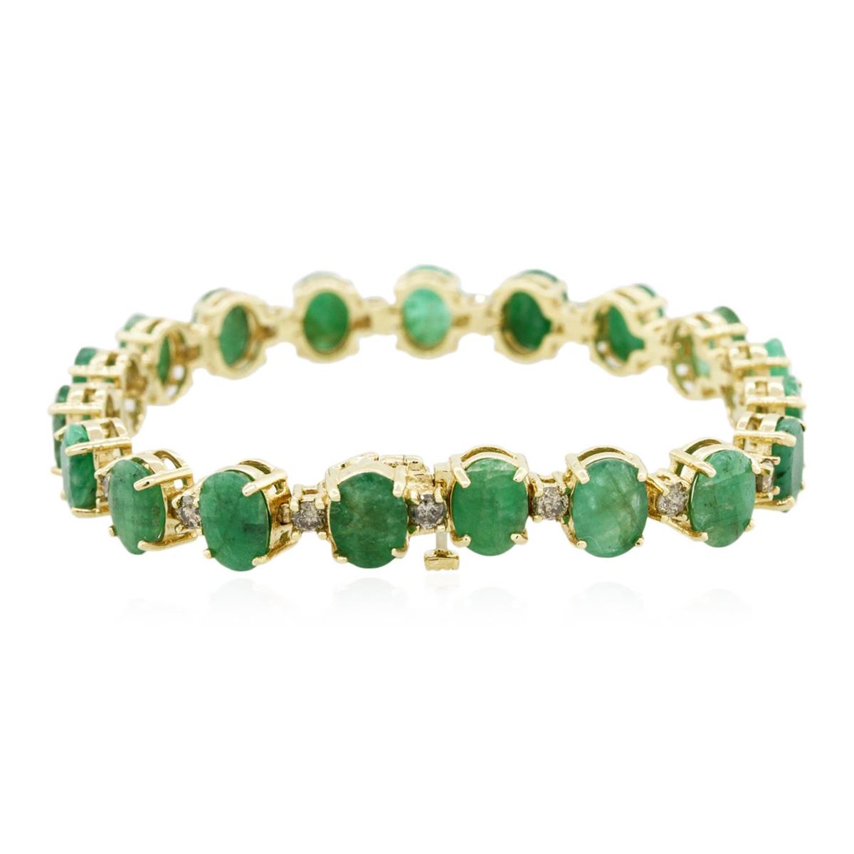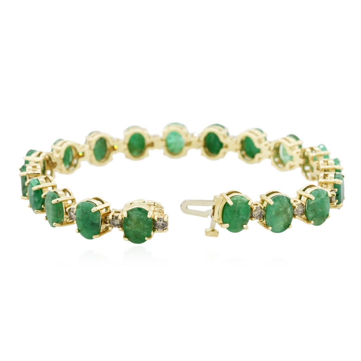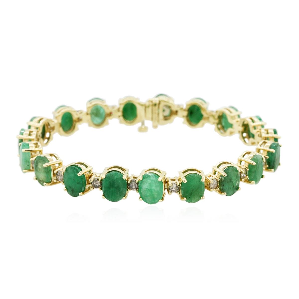 One electronically tested 14KT yellow gold ladies cast & assembled emerald and diamond bracelet with a bright polish finish. Condition is new, good workmanship. Seven inch length bracelet features a flexible ribbon of emeralds alternated by diamonds terminating in a concealed clasp with safety bar. Identified with markings of "14K". Containing: Nineteen prong set oval mixed cut natural emeralds, measuring 8.00 x 6.00 x 3.90mm, 6%. bulge factor, approximate. Total Weight of 20.90ct., clarity is severely included, type III, medium, very slightly grayish, very slightly bluish green color, (GIA vslbG 5/3), cut is good. Transmitting light somewhat diffusely, translucent. Naturally occurring internal & external characteristics are present. Indications of oil residue. Measurements & the color grade are an average for the group. Graded in the setting. Nineteen prong set round brilliant cut diamonds, measuring 3.00 - 3.00 x 1.80mm (depth est.) approximate. Total Weight of 19 Stones = 1.97ct. Color grade is an average for the group. Graded in the setting. Clarity: I-1 to I-3. Total Weight of Colored Stones 20.90ct. Total Weight of Diamonds 1.97ct. Total Weight of Bracelet 21.00 grams. AIG Appraised at $10,370.00.