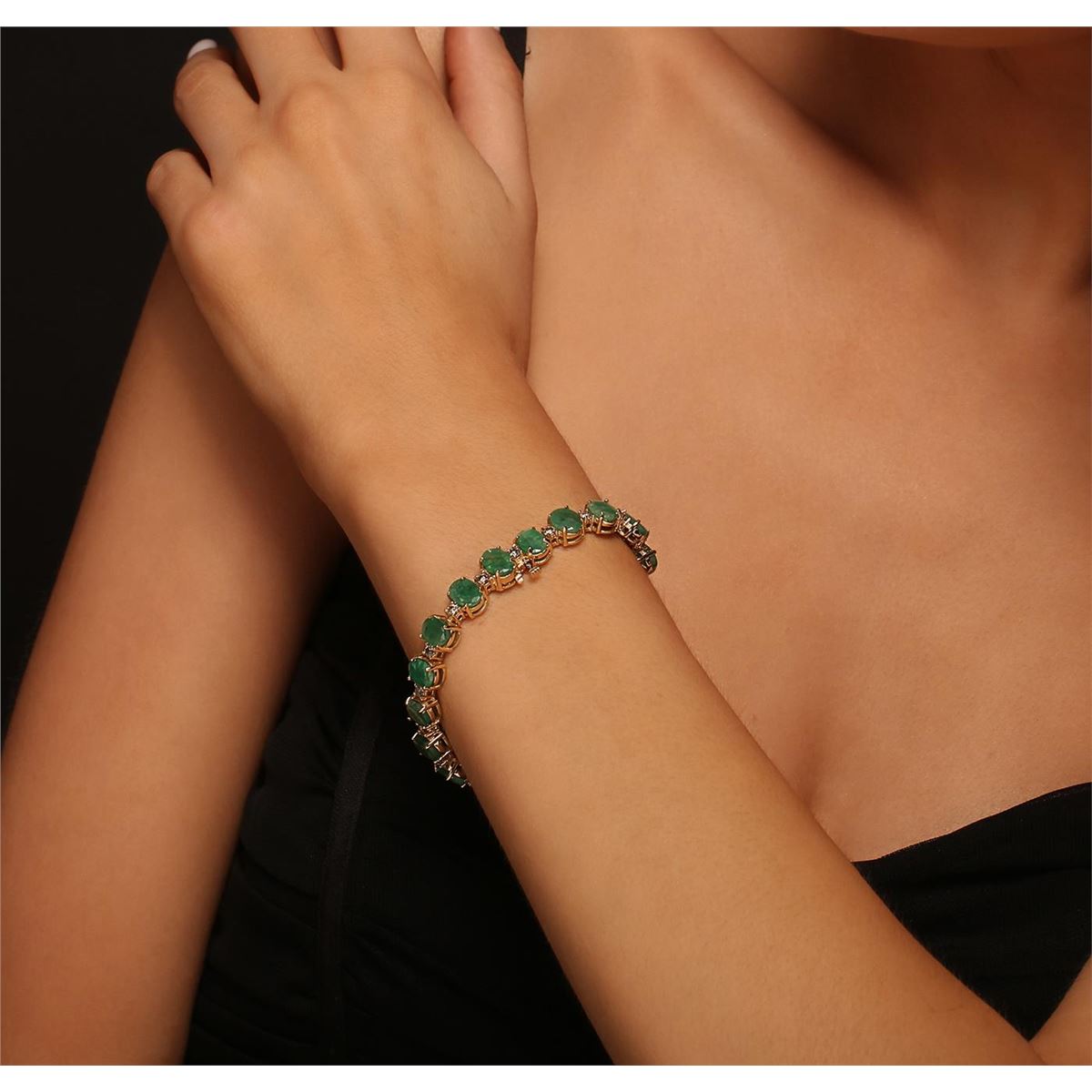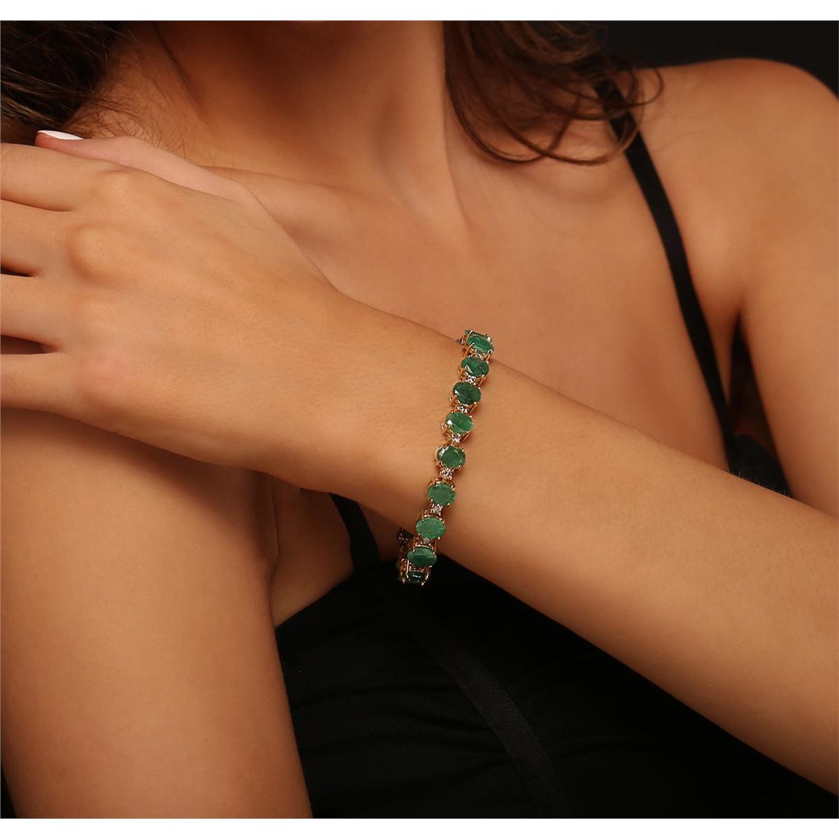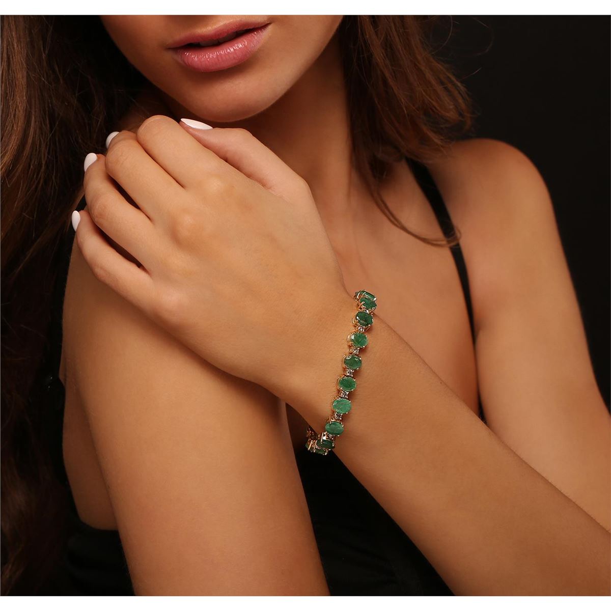 One electronically tested 14KT yellow gold ladies cast & assembled emerald and diamond bracelet with a bright polish finish. Condition is new, good workmanship. Seven inch length bracelet features a flexible ribbon of emeralds alternated by diamonds terminating in a concealed clasp with safety bar. Identified with markings of "14K". Containing: Nineteen prong set oval mixed cut natural emeralds, measuring 8.00 x 6.00 x 3.90mm, 6%. bulge factor, approximate. Total Weight of 20.90ct., clarity is severely included, type III, medium, very slightly grayish, very slightly bluish green color, (GIA vslbG 5/3), cut is good. Transmitting light somewhat diffusely, translucent. Naturally occurring internal & external characteristics are present. Indications of oil residue. Measurements & the color grade are an average for the group. Graded in the setting. Nineteen prong set round brilliant cut diamonds, measuring 3.00 - 3.00 x 1.80mm (depth est.) approximate. Total Weight of 19 Stones = 1.97ct. Color grade is an average for the group. Graded in the setting. Clarity: I-1 to I-3. Total Weight of Colored Stones 20.90ct. Total Weight of Diamonds 1.97ct. Total Weight of Bracelet 21.00 grams. AIG Appraised at $10,370.00.