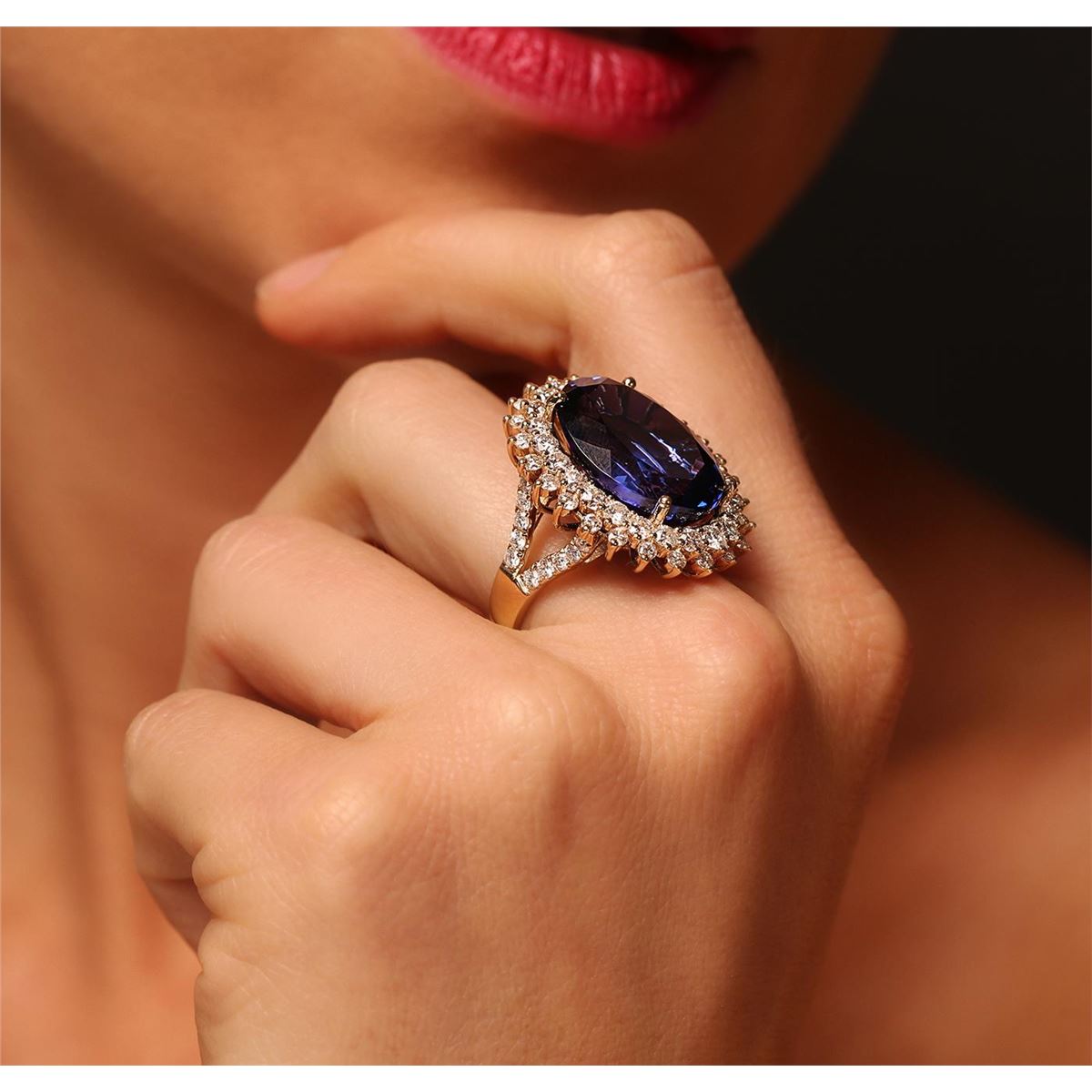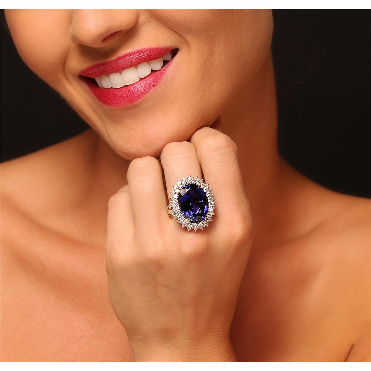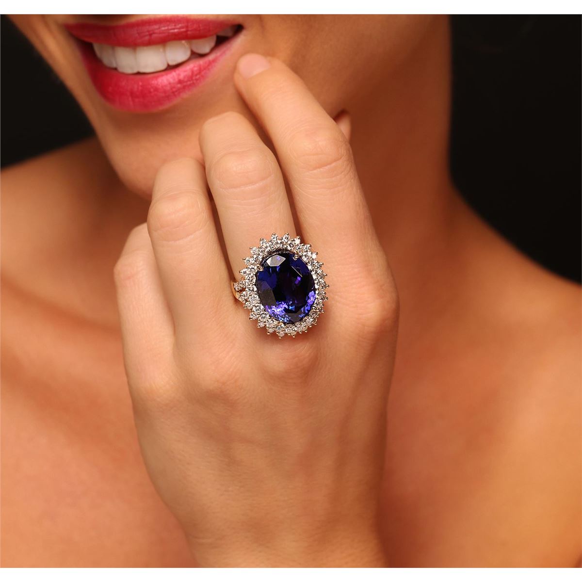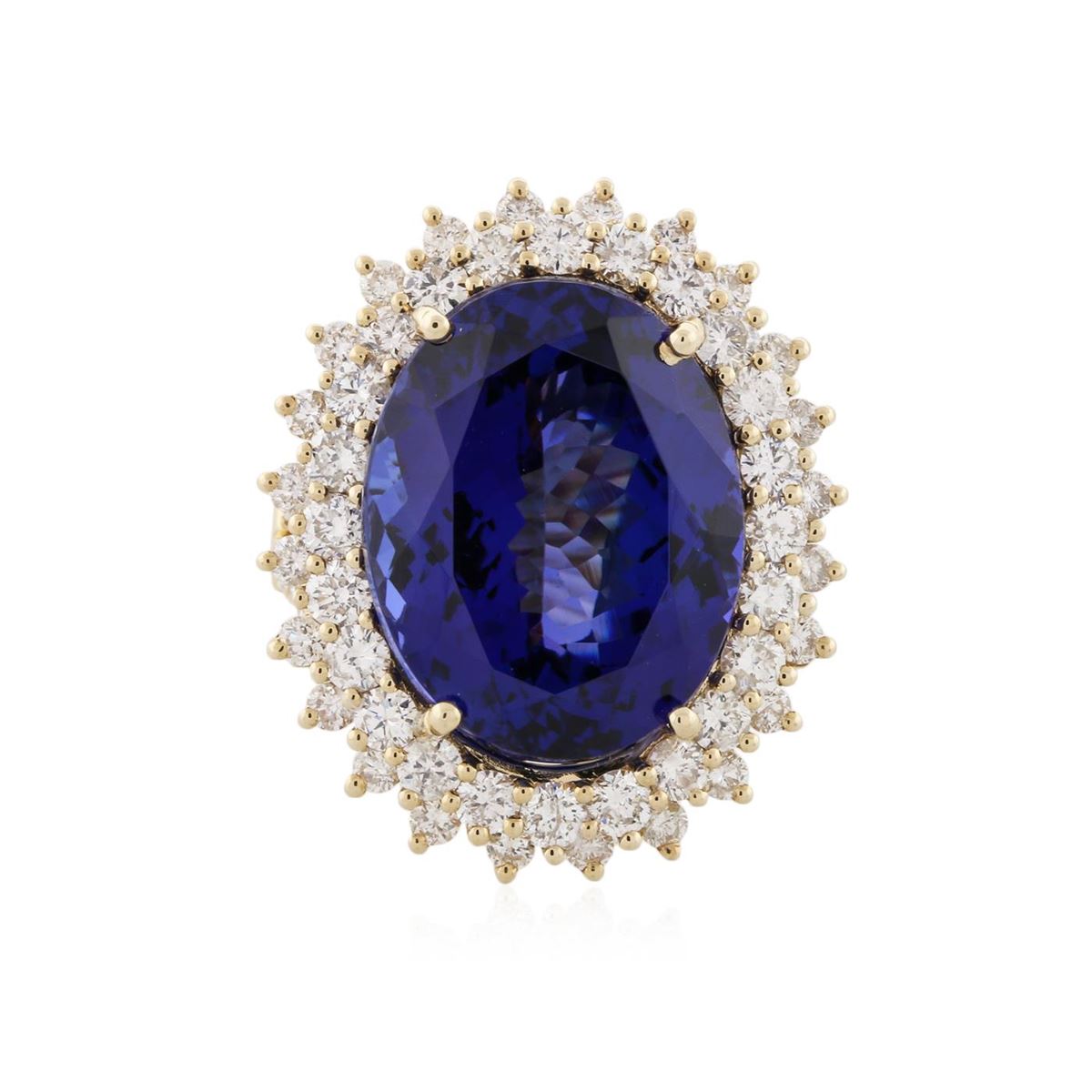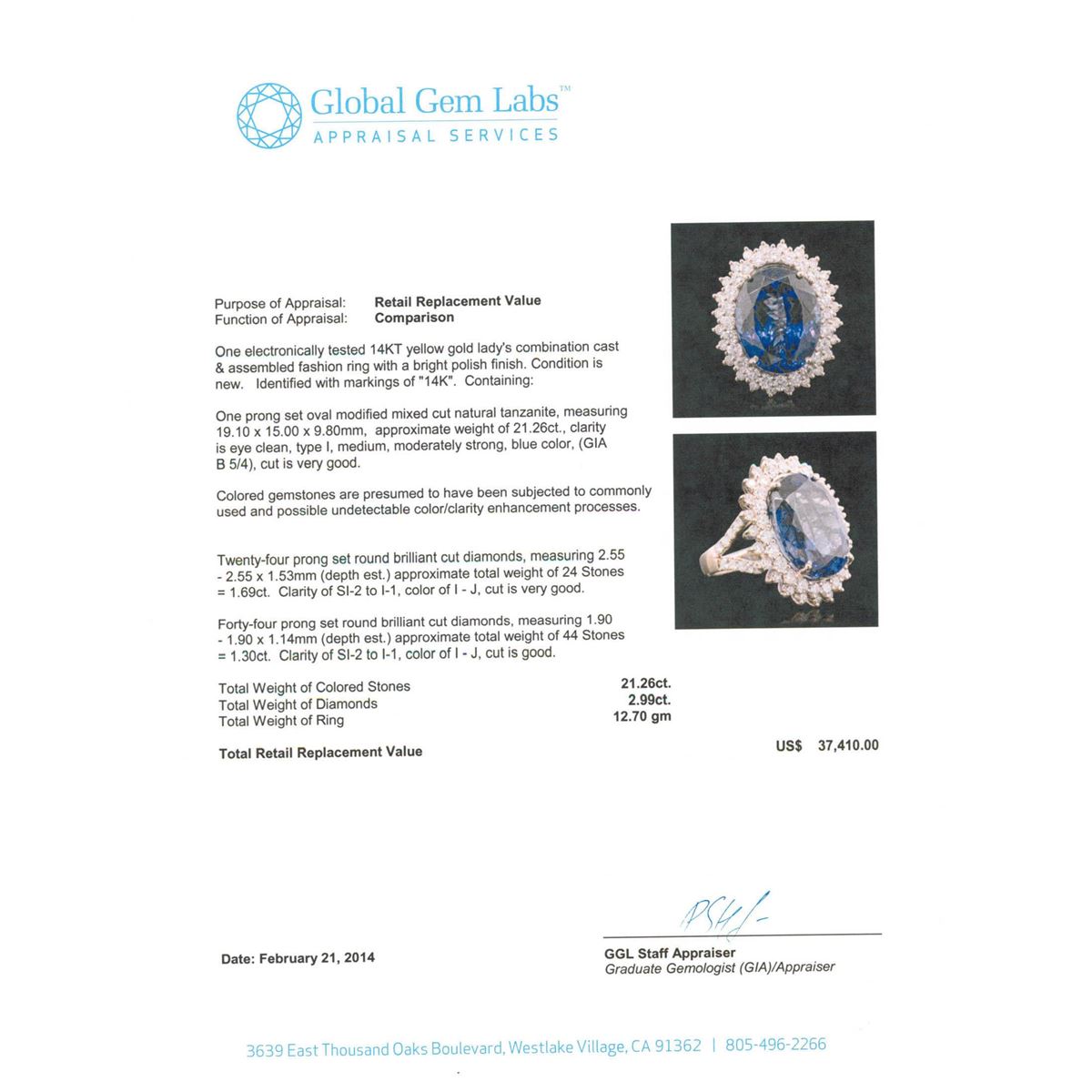One electronically tested 14KT yellow gold Ladies combination cast & assembled fashion ring with a bright polish finish. Condition is new. Identified with markings of "14K". Containing: One prong set oval modified mixed cut natural tanzanite, measuring 19.10 x 15.00 x 9.80mm, approximate weight of 21.26ct., clarity is eye clean, type I, medium, moderately strong, blue color, (GIA B 5/4), cut is very good. Colored gemstones are presumed to have been subjected to commonly used and possible undetectable color/clarity enhancement processes. Twenty-Four prong set round brilliant cut diamonds, measuring 2.55 - 2.55 x 1.53mm (depth est.) approximate. Total Weight of 24 Stones = 1.69ct. Clarity: SI-2 to I-1. Color: I - J, Cut is Very Good. Forty-Four prong set round brilliant cut diamonds, measuring 1.90 - 1.90 x 1.14mm (depth est.) approximate. Total Weight of 44 Stones = 1.30ct. Clarity: SI-2 to I-1. Color: I - J, Cut is Good. Total Weight of Colored Stones 21.26ct. Total Weight of Diamonds 2.99ct. Total Weight of Ring 12.70 grams. GGL Appraised at $37,410.00.