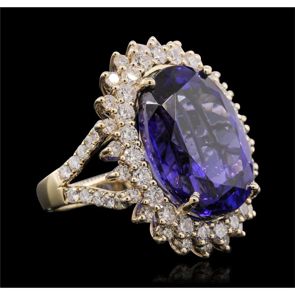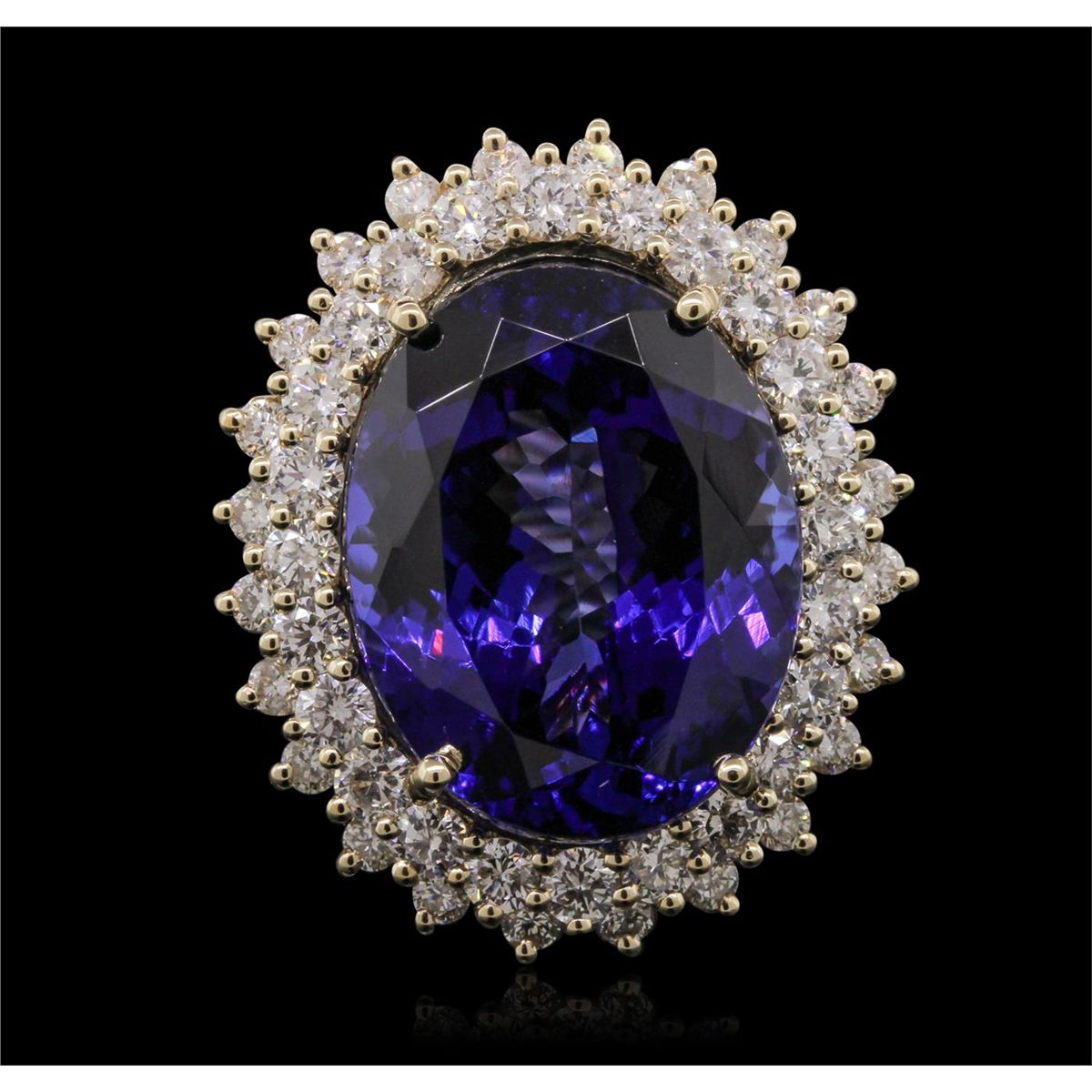 One electronically tested 14KT yellow gold Ladies combination cast & assembled fashion ring with a bright polish finish. Condition is new. Identified with markings of "14K". Containing: One prong set oval modified mixed cut natural tanzanite, measuring 19.10 x 15.00 x 9.80mm, approximate weight of 21.26ct., clarity is eye clean, type I, medium, moderately strong, blue color, (GIA B 5/4), cut is very good. Colored gemstones are presumed to have been subjected to commonly used and possible undetectable color/clarity enhancement processes. Twenty-Four prong set round brilliant cut diamonds, measuring 2.55 - 2.55 x 1.53mm (depth est.) approximate. Total Weight of 24 Stones = 1.69ct. Clarity: SI-2 to I-1. Color: I - J, Cut is Very Good. Forty-Four prong set round brilliant cut diamonds, measuring 1.90 - 1.90 x 1.14mm (depth est.) approximate. Total Weight of 44 Stones = 1.30ct. Clarity: SI-2 to I-1. Color: I - J, Cut is Good. Total Weight of Colored Stones 21.26ct. Total Weight of Diamonds 2.99ct. Total Weight of Ring 12.70 grams. GGL Appraised at $37,410.00.