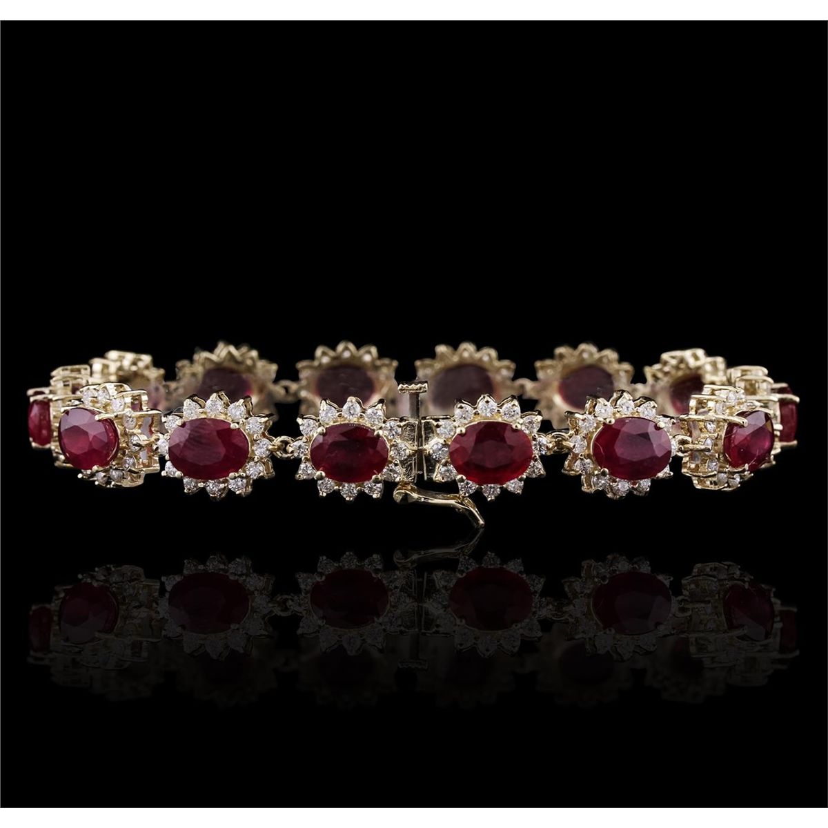 One electronically tested 14KT yellow gold ladies combination cast & assembled bracelet with a hidden box clasp with a bright polish finish. Condition is new. Identified with markings of "14K". Containing: Thirteen prong set oval modified brilliant cut natural rubies, measuring 8.00 x 6.00 x 4.20mm, approximate. Total Weight of 21.45ct., clarity is heavily included, type II, medium dark, moderately strong, strongly purplish red color, (GIA stpR 6/4), cut is good. One Hundred Sixty-Eight prong set round brilliant cut diamonds, measuring 1.50 - 1.50 x 0.90mm (depth est.) approximate. Total Weight of 168 Stones = 2.07ct. Clarity: I-1 to I-2. Color: J - K, Cut is Good. Colored gemstones are presumed to have been subjected to commonly used enhancement processes. All diamonds and colored gemstones are graded in the mounting, unless otherwise stated. Total Weight of Colored Stones 21.45ct. Total Weight of Diamonds 2.07ct. Total Weight of Bracelet 23.50 grams. GGL Appraised at $17,100.00.