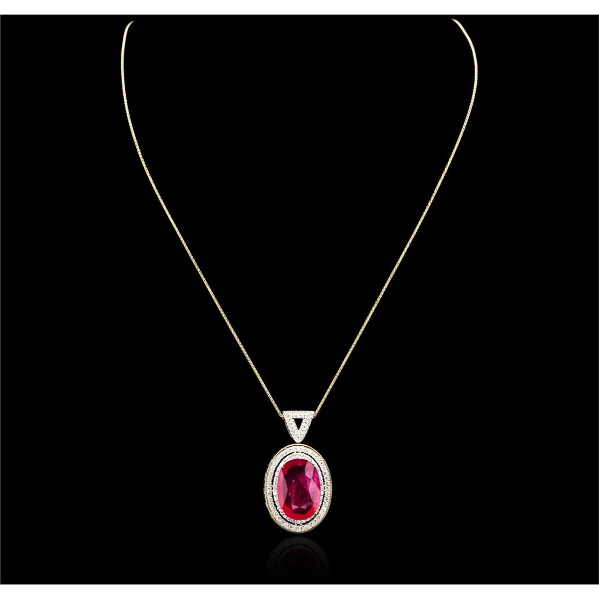 One electronically tested 14KT yellow gold ladies combination cast & assembled ruby and diamond pendant & chain 17.0" long, cable link with a lobster claw clasp with a bright polish finish. Identified with markings of "585". Condition is new. Containing: One prong set oval modified brilliant cut natural ruby, measuring 20.00 x 14.00 x 9.10mm, approximate weight of 21.67ct., clarity is heavily included, medium dark, moderately strong, strongly purplish red color, (GIA stpR 6/4), cut is good. One Hundred Twenty-Two prong set round brilliant cut diamonds, measuring 1.30 - 1.30 x 0.78mm (depth est.) approximate total weight of 122 Stones = 0.98ct. Clarity: SI-2 to I-1. Color: I - J, Cut is Good. Colored gemstones are presumed to have been subjected to commonly used enhancement processes. All diamonds and colored gemstones are graded in the mounting, unless otherwise stated. Total Weight of Colored Stones 21.67ct. Total Weight of Diamonds 0.98ct. Total Weight of Pendant & Chain 15.30 grams. GGL Appraised at $6,960.00.