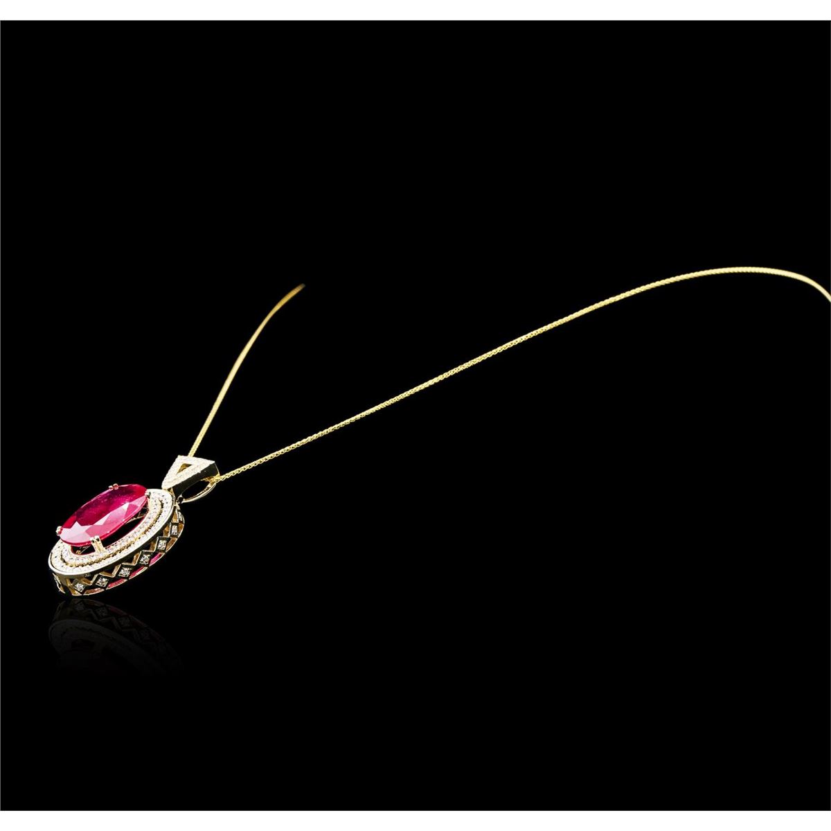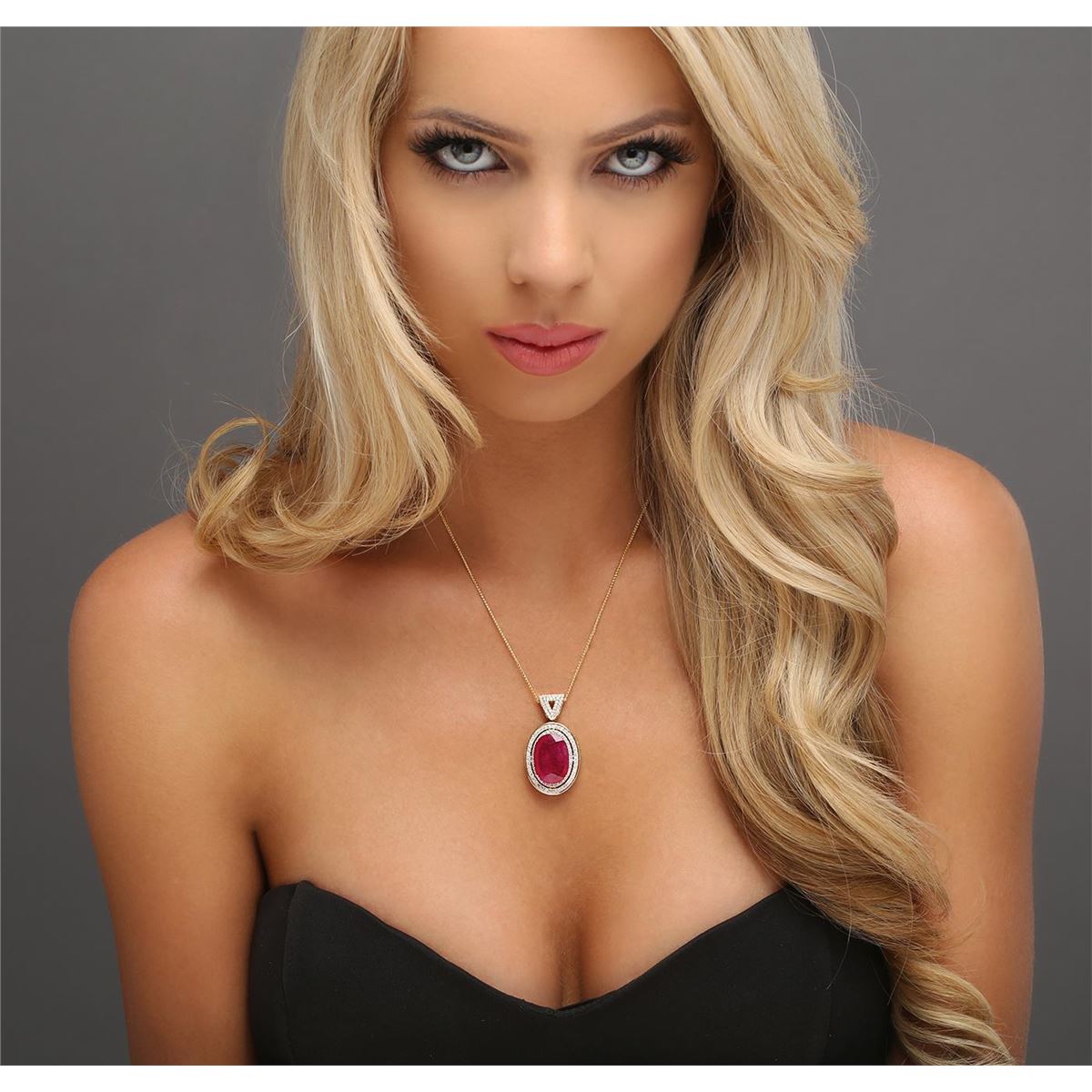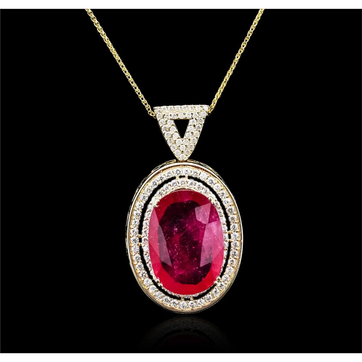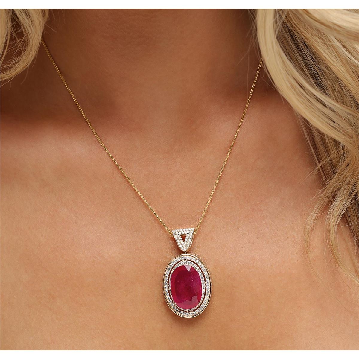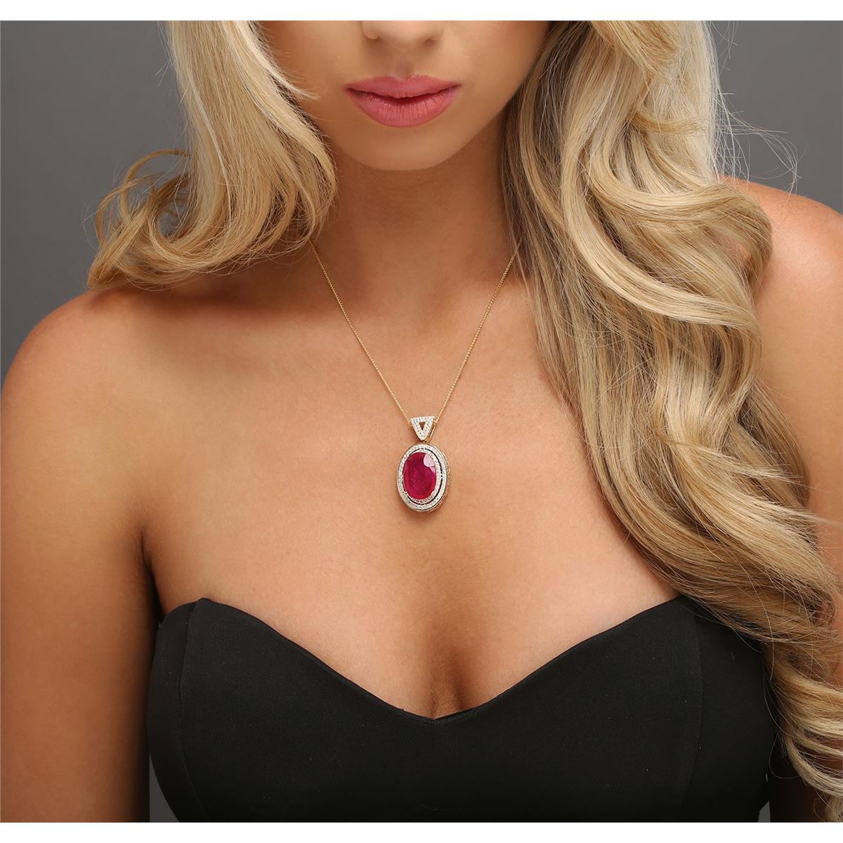 One electronically tested 14KT yellow gold ladies combination cast & assembled ruby and diamond pendant & chain 17.0" long, cable link with a lobster claw clasp with a bright polish finish. Identified with markings of "585". Condition is new. Containing: One prong set oval modified brilliant cut natural ruby, measuring 20.00 x 14.00 x 9.10mm, approximate weight of 21.67ct., clarity is heavily included, medium dark, moderately strong, strongly purplish red color, (GIA stpR 6/4), cut is good. One Hundred Twenty-Two prong set round brilliant cut diamonds, measuring 1.30 - 1.30 x 0.78mm (depth est.) approximate total weight of 122 Stones = 0.98ct. Clarity: SI-2 to I-1. Color: I - J, Cut is Good. Colored gemstones are presumed to have been subjected to commonly used enhancement processes. All diamonds and colored gemstones are graded in the mounting, unless otherwise stated. Total Weight of Colored Stones 21.67ct. Total Weight of Diamonds 0.98ct. Total Weight of Pendant & Chain 15.30 grams. GGL Appraised at $6,960.00.
