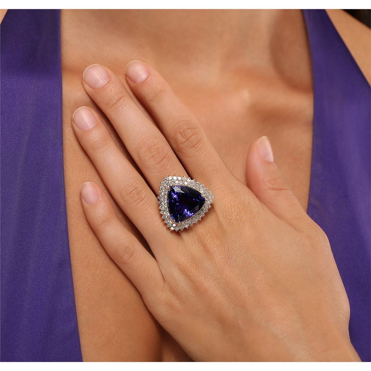 One electronically tested 14KT yellow gold ladies cast tanzanite and diamond ring with a bright polish finish. Condition is new, good workmanship. The featured tanzanite is set within a two tiered diamond lattice gallery, completed by a three millimeter wide band. Identified with markings of "K14". Containing: One prong set triangle modified brilliant cut natural tanzanite, measuring 17.40 x 17.20 x 10.69mm, 10% bulge factor, exact weight 21.69ct., clarity is eye clean, type I, medium dark, moderately strong, violetish blue color, (GIA vB 6/4), cut is good. Transmitting light with no distortion, transparent. GIA. Colored Stone Grading Report attached. Graded loose prior to setting in the GIA Laboratory, Report # 2151633919. Tanzanite is a very rare gemstone that is only found in the country of Tanzania. Originally discovered in 1967. Tiffany & Company, named the stone Tanzanite. It is found in the Usumburu Mountains that border the Umba Valley of northern Tanzania. Tanzanite occurs in gray, brown, violet, blue, reddish-purple, & green. The gem is interesting because of its exceptional pleochroism. Rotated in different directions a tanzanite will exhibit multiple changes of color. Tanzanite has a low tolerance to ultrasonic cleaning, and should not be cleaned using this method. Sixty-three prong set round brilliant cut diamonds, measuring 2.10 - 2.00 x 1.23mm (depth est.) approximate total weight of 63 Stones = 2.48ct. Faint secondary color throughout. Graded in the setting. Clarity I-1 to 1-2. Color K - M. Total Weight of Colored Stones 21.69ct. Total Weight of Diamonds 2.48ct. Total Weight of Ring 14.50gm. AIG Appraised at $66,920.00.