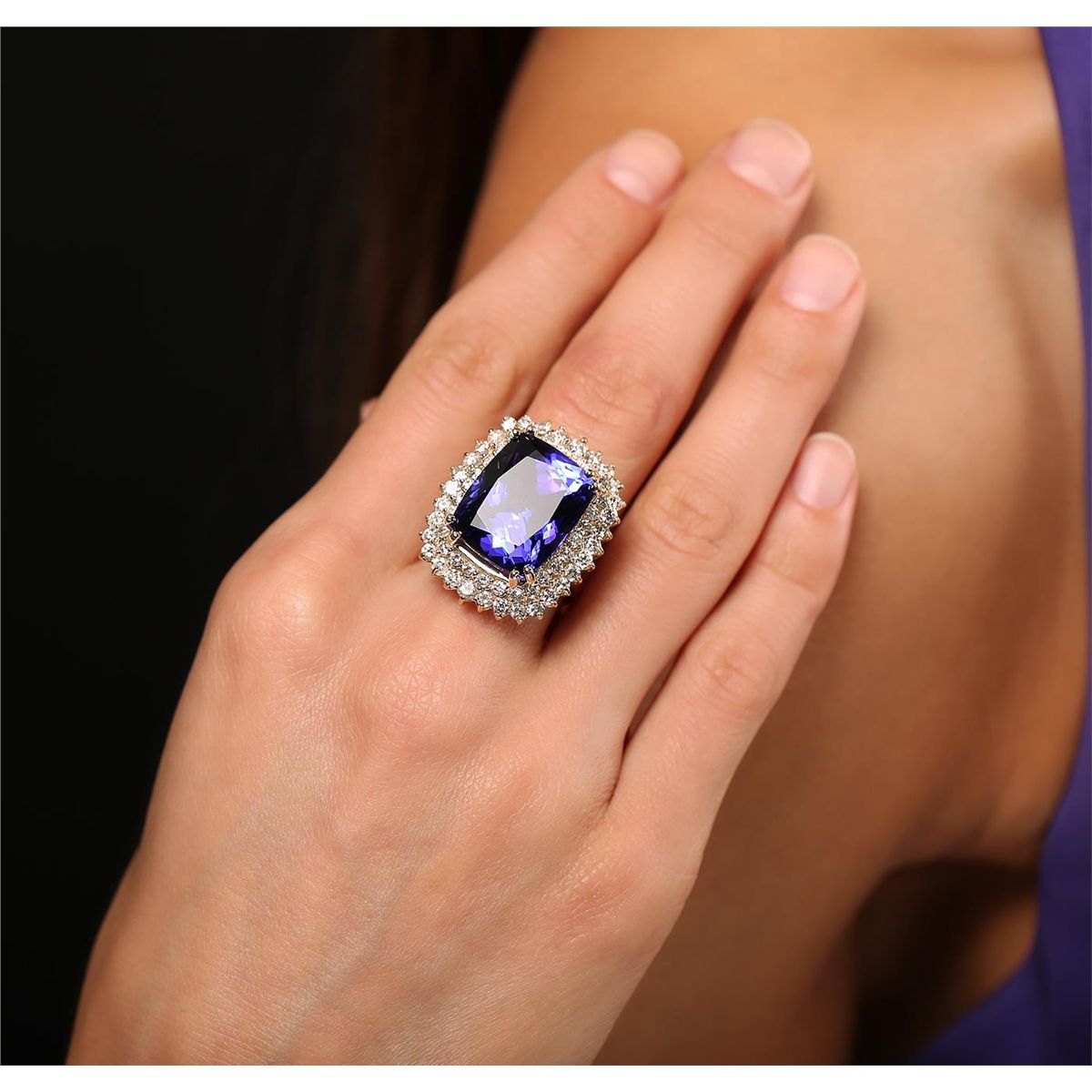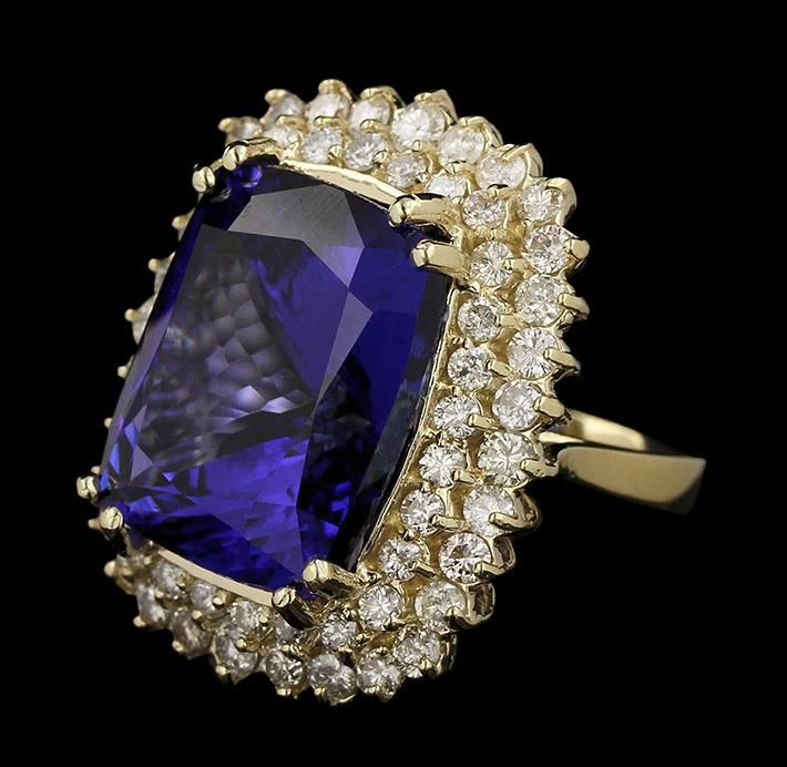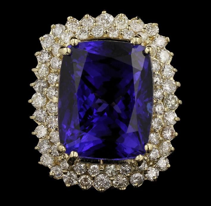 One electronically tested 14KT yellow gold ladies cast tanzanite and diamond ring with a bright polish finish. Condition is new, good workmanship. The featured tanzanite is set within tiered diamond bezels supported by a lattice under gallery, completed by a three millimeter wide band. Identified with markings of "K14". Containing: One prong set cushion modified brilliant cut natural tanzanite, measuring 17.97 x 14.55 x 10.45mm, exact weight 21.70ct., clarity is eye clean, type I, dark, moderately strong, violetish blue color, (GIA vB 7/4), cut is good. Transmitting light with no distortion, transparent. GIA Colored Stone Grading Report attached. Graded loose prior to setting in the GIA Laboratory, Report #2151735091. Tanzanite is a very rare gemstone that is only found in the country of Tanzania. Originally discovered in 1967. Tiffany & Company, named the stone Tanzanite. It is found in the Usumburu Mountains that border the Umba Valley of northern Tanzania. Tanzanite occurs in gray, brown, violet, blue, reddish-purple, & green. The gem is interesting because of its exceptional pleochroism. Rotated in different directions a tanzanite will exhibit multiple changes of color. Tanzanite has a low tolerance to ultrasonic cleaning, and should not be cleaned using this method. Sixty prong set round brilliant cut diamonds, measuring 2.40 - 2.00 x 1.32mm (depth est.) approximate total weight of 60 Stones = 2.43ct. Graded in the setting. Clarity SI-1 to I-1. Color H - J. Total Weight of Colored Stones 21.70ct. Total Weight of Diamonds 2.43ct. Total Weight of Ring 15.33gm. AIGAppraised at $67,980.00.