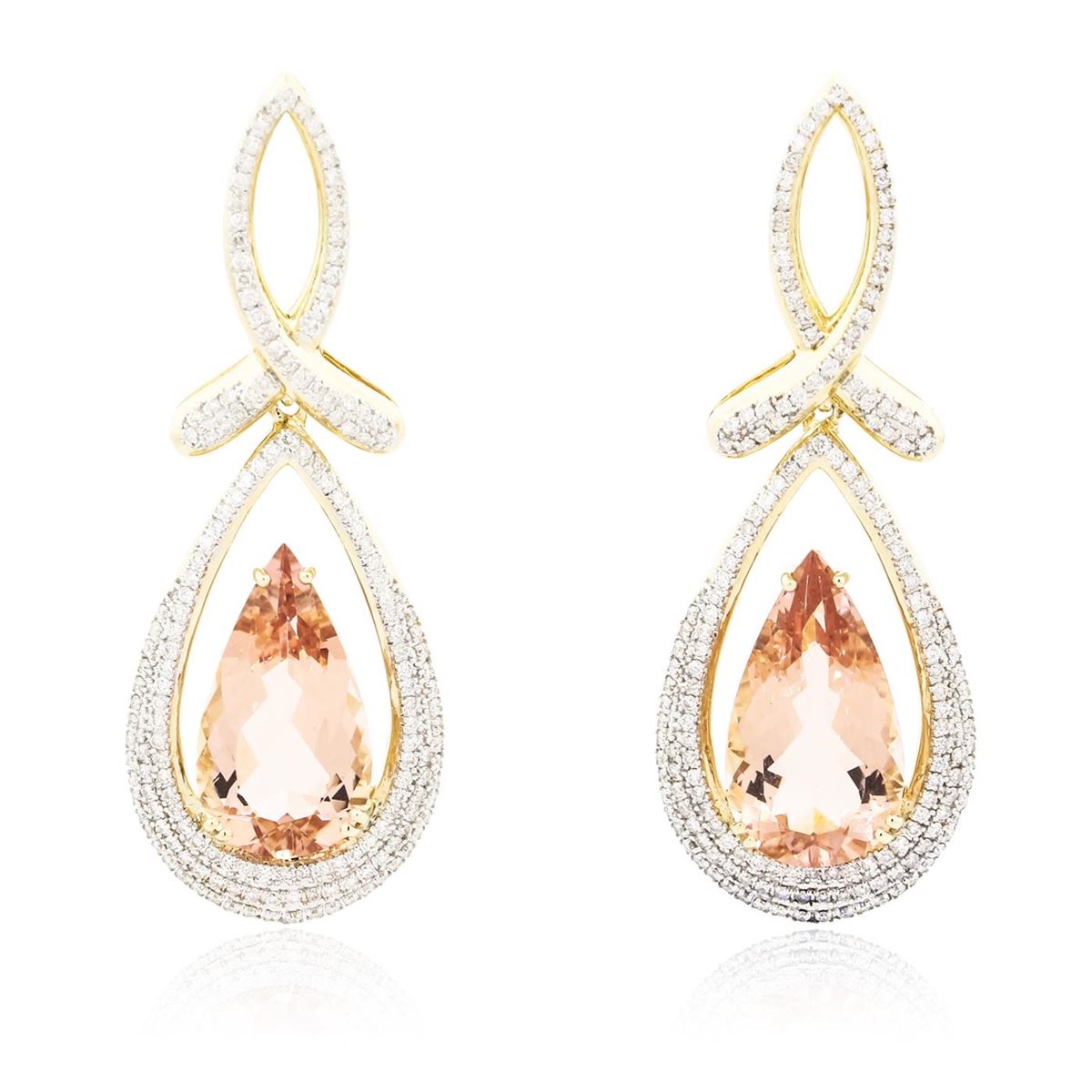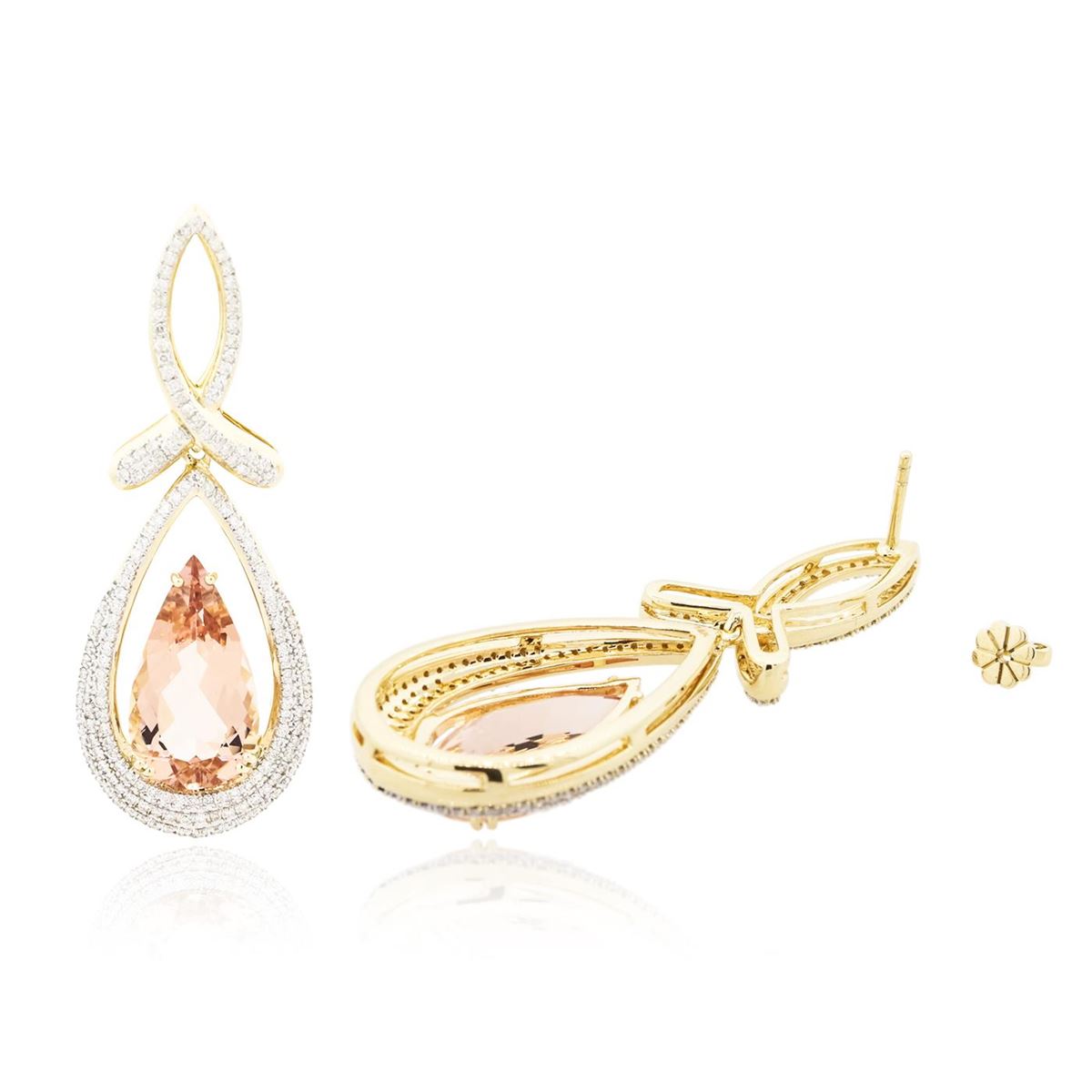 One pair electronically tested 14KT yellow gold Ladies combination cast & assembled earrings with friction posts with a bright polish finish. Condition is new. Containing: Two prong set pear modified brilliant cut natural morganites, measuring 21.22 x 12.10 x 7.87mm, approximate. Total Weight of 21.98ct., clarity is eye clean, type I, light, brownish, reddish orange color, (GIA rO 3/1), cut is good. Colored gemstones are presumed to have been subjected to commonly used color/clarity enhancement processes. Three Hundred Fifty prong set round brilliant cut diamonds, measuring 1.30 - 1.30 x 0.78mm (depth est.) approximate. Total Weight of 350 Stones = 2.80ct. Clarity: I-1 to I-2. Color: H - I, Cut is Good. Total Weight of Colored Stones 21.98ct. Total Weight of Diamonds 2.80ct. Total Weight of Earrings 30.80 grams. GGL Appraised at $20,335.00.