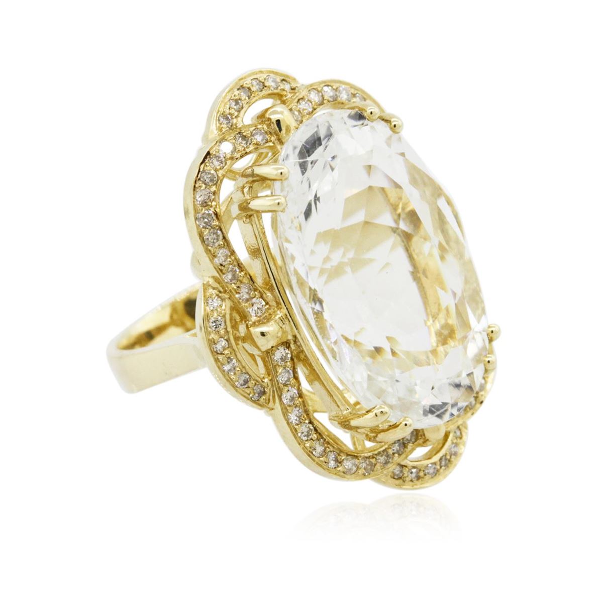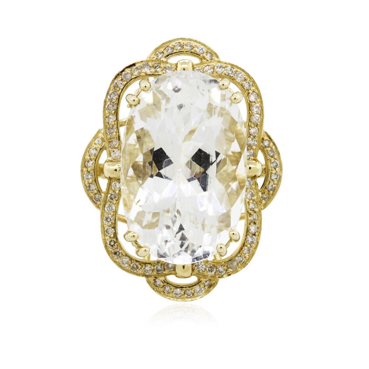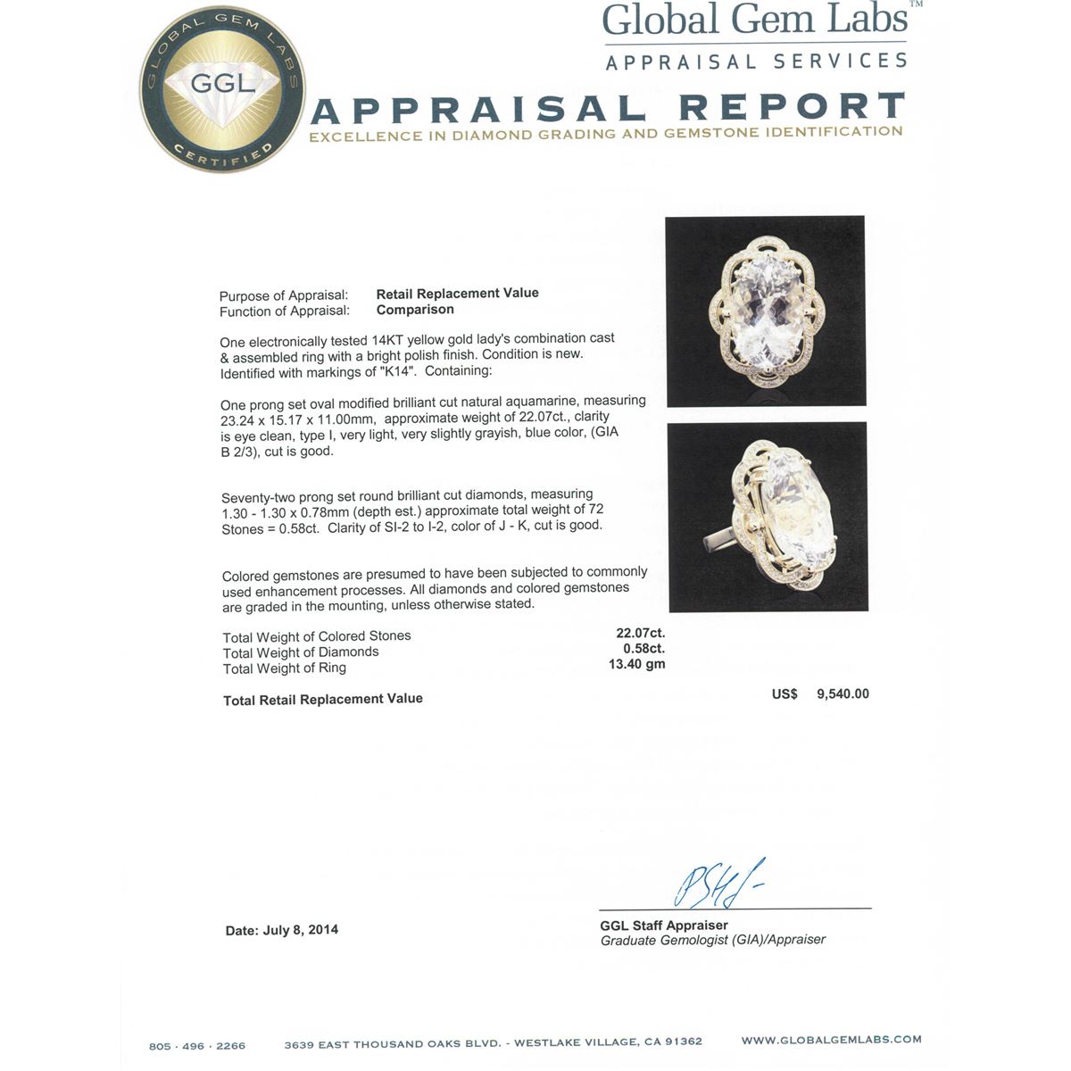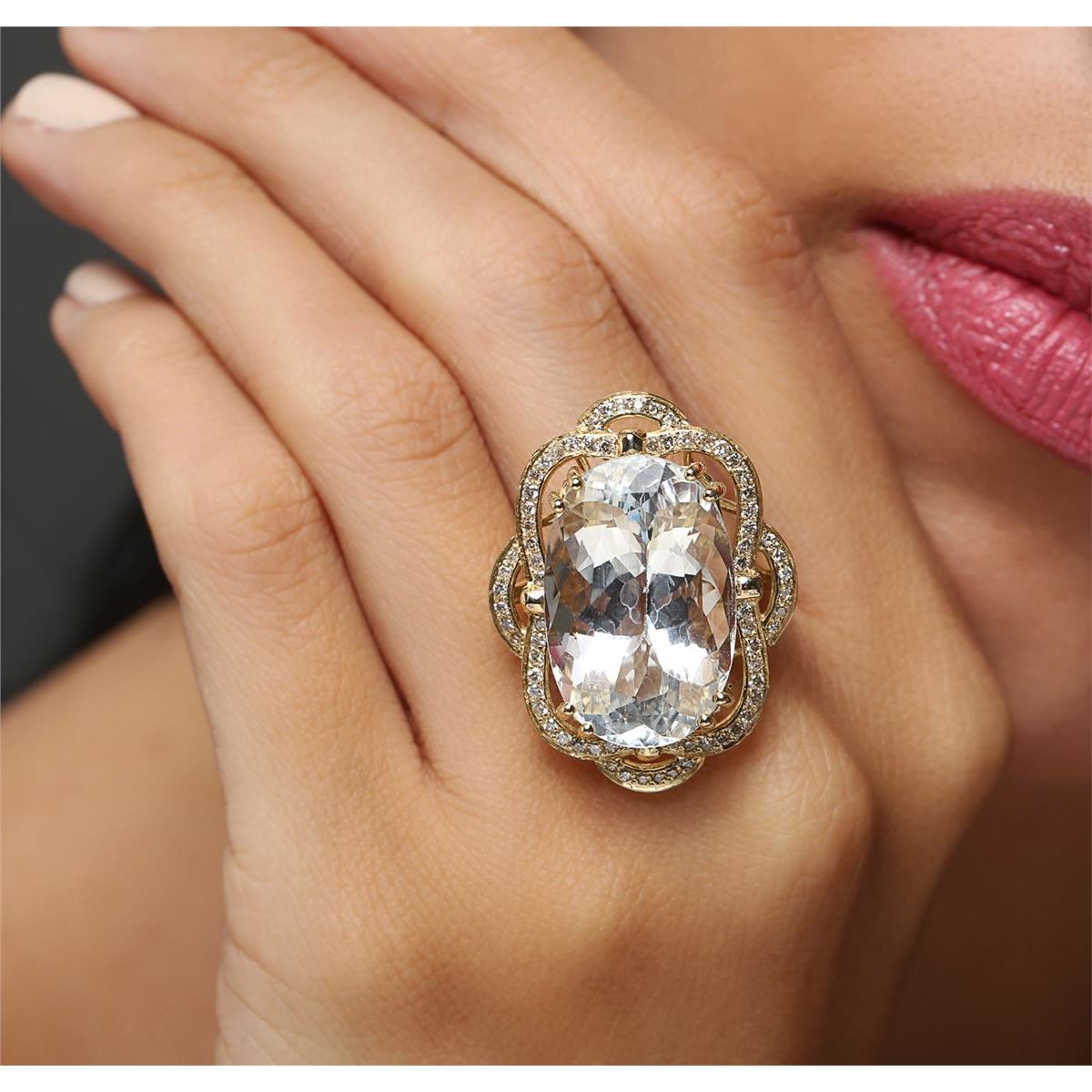 One electronically tested 14KT yellow gold Ladies combination cast & assembled ring with a bright polish finish. Condition is new. Identified with markings of "K14". Containing: One prong set oval modified brilliant cut natural aquamarine, measuring 23.24 x 15.17 x 11.00mm, approximate weight of 22.07ct., clarity is eye clean, type I, very light, very slightly grayish, blue color, (GIA B 2/3), cut is good. Seventy-Two prong set round brilliant cut diamonds, measuring 1.30 - 1.30 x 0.78mm (depth est.) approximate. Total Weight of 72 Stones = 0.58ct. Clarity: SI-2 to I-2. Color: J - K, Cut is Good. Colored gemstones are presumed to have been subjected to commonly used enhancement processes. All diamonds and colored gemstones are graded in the mounting, unless otherwise stated. Total Weight of Colored Stones 22.07ct. Total Weight of Diamonds 0.58ct. Total Weight of Ring 13.40 grams. GGL Appraised at $9,540.00.