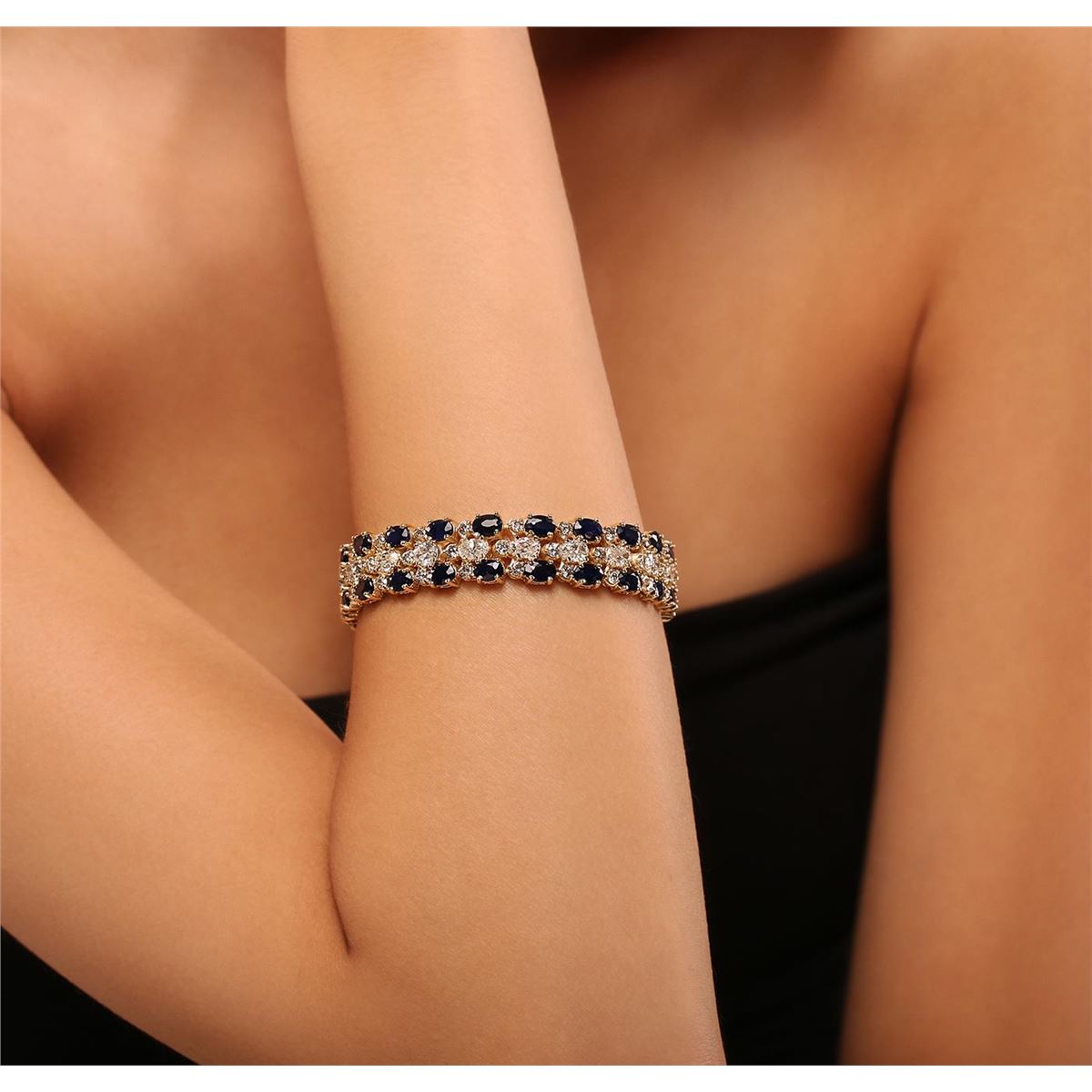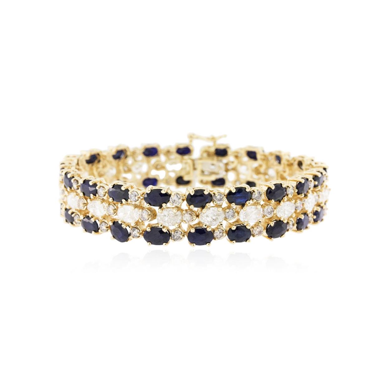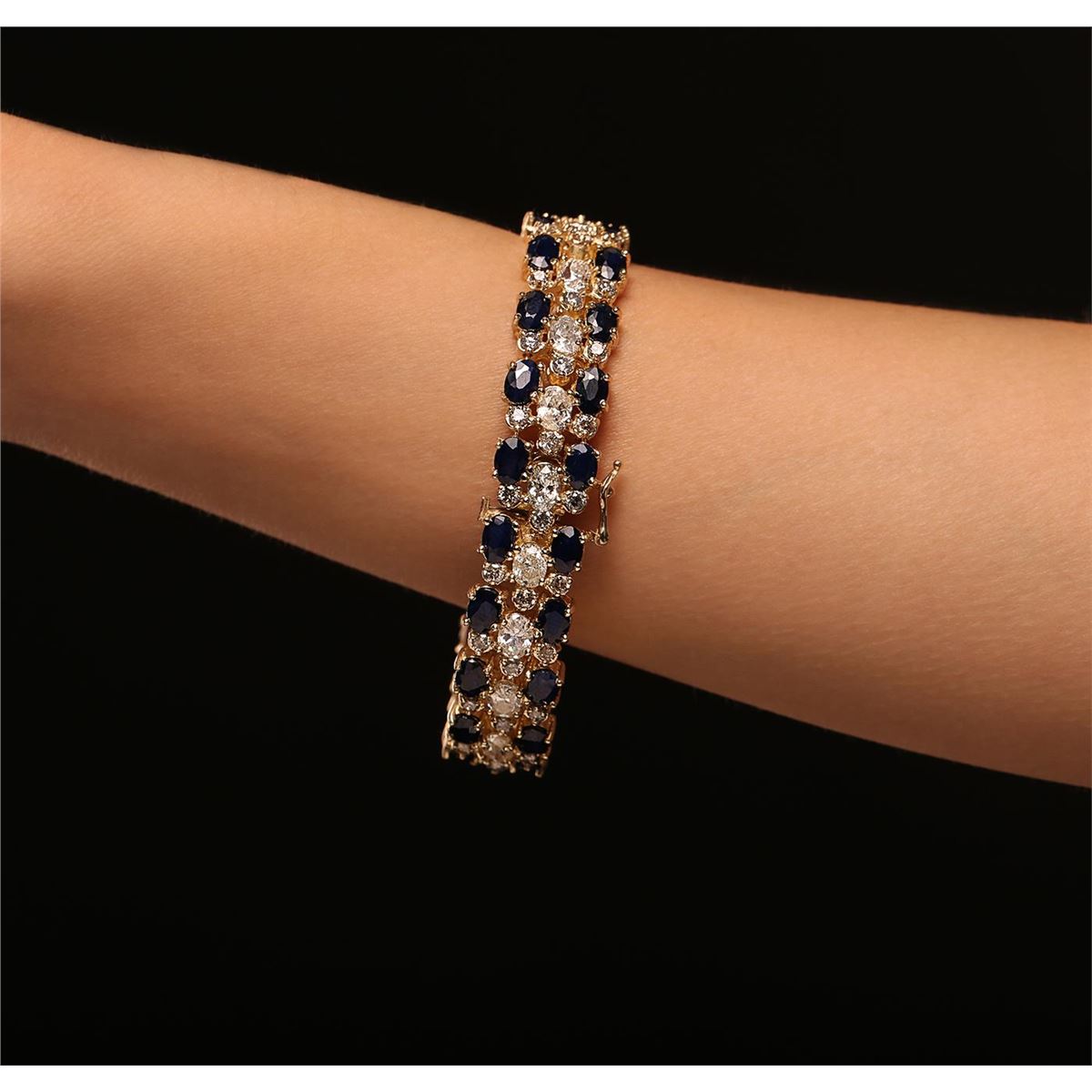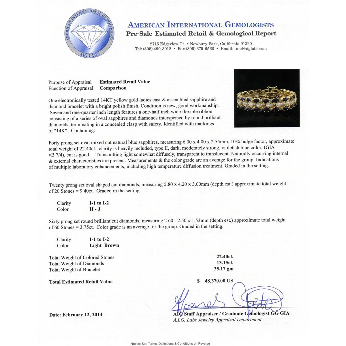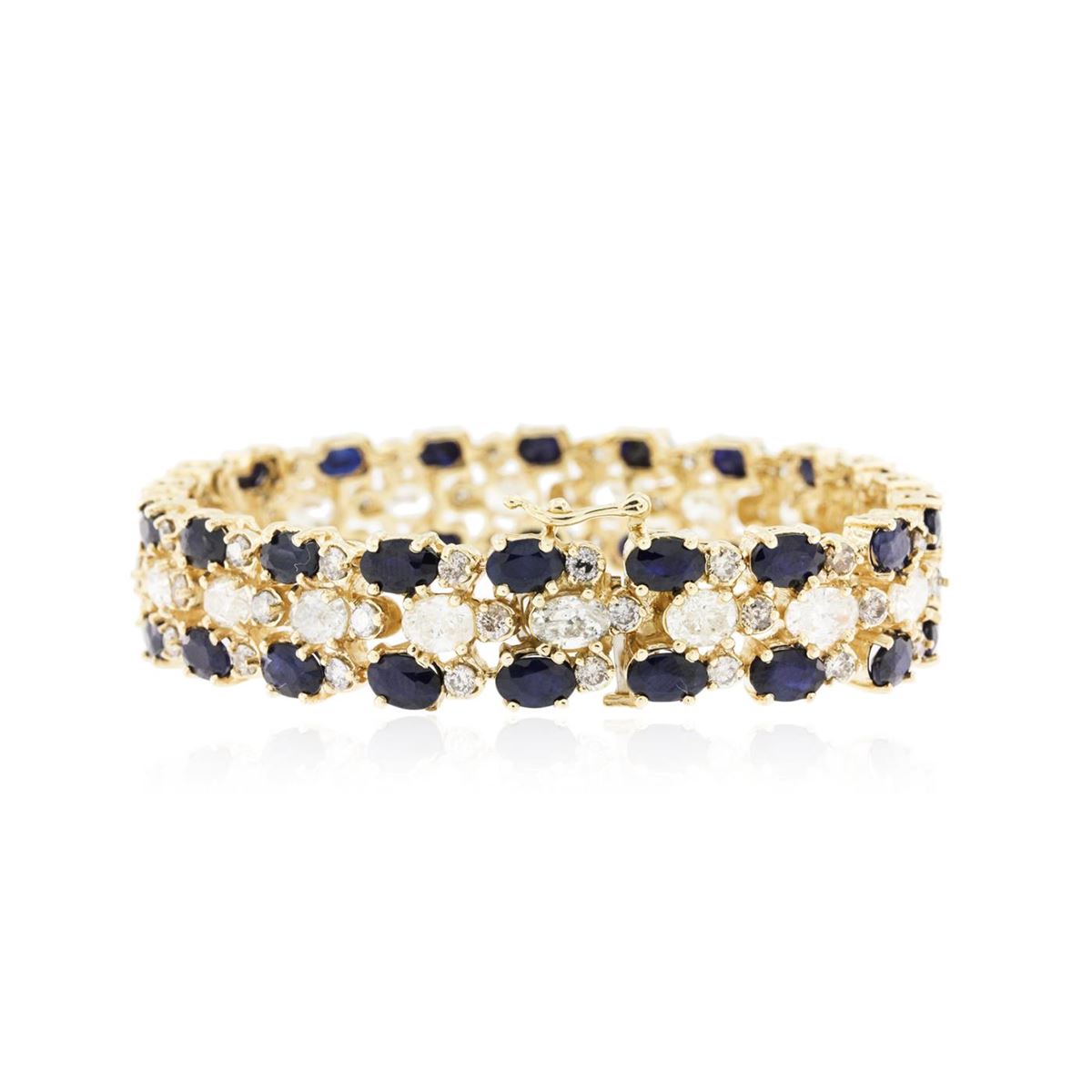 One electronically tested 14KT yellow gold ladies cast & assembled sapphire and diamond bracelet with a bright polish finish. Condition is new, good workmanship. Seven and one-quarter inch length features a one-half inch wide flexible ribbon consisting of a series of oval sapphires and diamonds interspersed by round brilliant diamonds, terminating in a concealed clasp with safety. Identified with markings of "14K". Containing: Forty prong set oval mixed cut natural blue sapphires, measuring 6.00 x 4.00 x 2.55mm, 10%. bulge factor, approximate. Total Weight of 22.40ct., clarity is heavily included, type II, dark, moderately strong, violetish blue color, (GIA vB 7/4), cut is good. Transmitting light somewhat diffusely, transparent to translucent. Naturally occurring internal & external characteristics are present. Measurements & the color grade are an average for the group. Indications of multiple laboratory enhancements, including high temperature diffusion treatment. Graded in the setting. Twenty prong set oval shaped cut diamonds, measuring 5.80 x 4.20 x 3.00mm (depth est.) approximate. Total Weight of 20 Stones = 9.40ct. Graded in the setting. Clarity: I-1 to I-2. Color: H - J. Sixty prong set round brilliant cut diamonds, measuring 2.60 - 2.50 x 1.53mm (depth est.) approximate. Total Weight of 60 Stones = 3.75ct. Color grade is an average for the group. Graded in the setting. Clarity: I-1 to I-2. Total Weight of Colored Stones 22.40ct. Total Weight of Diamonds 13.15ct. Total Weight of Bracelet 35.17 grams. AIG Appraised at $48,370.00.