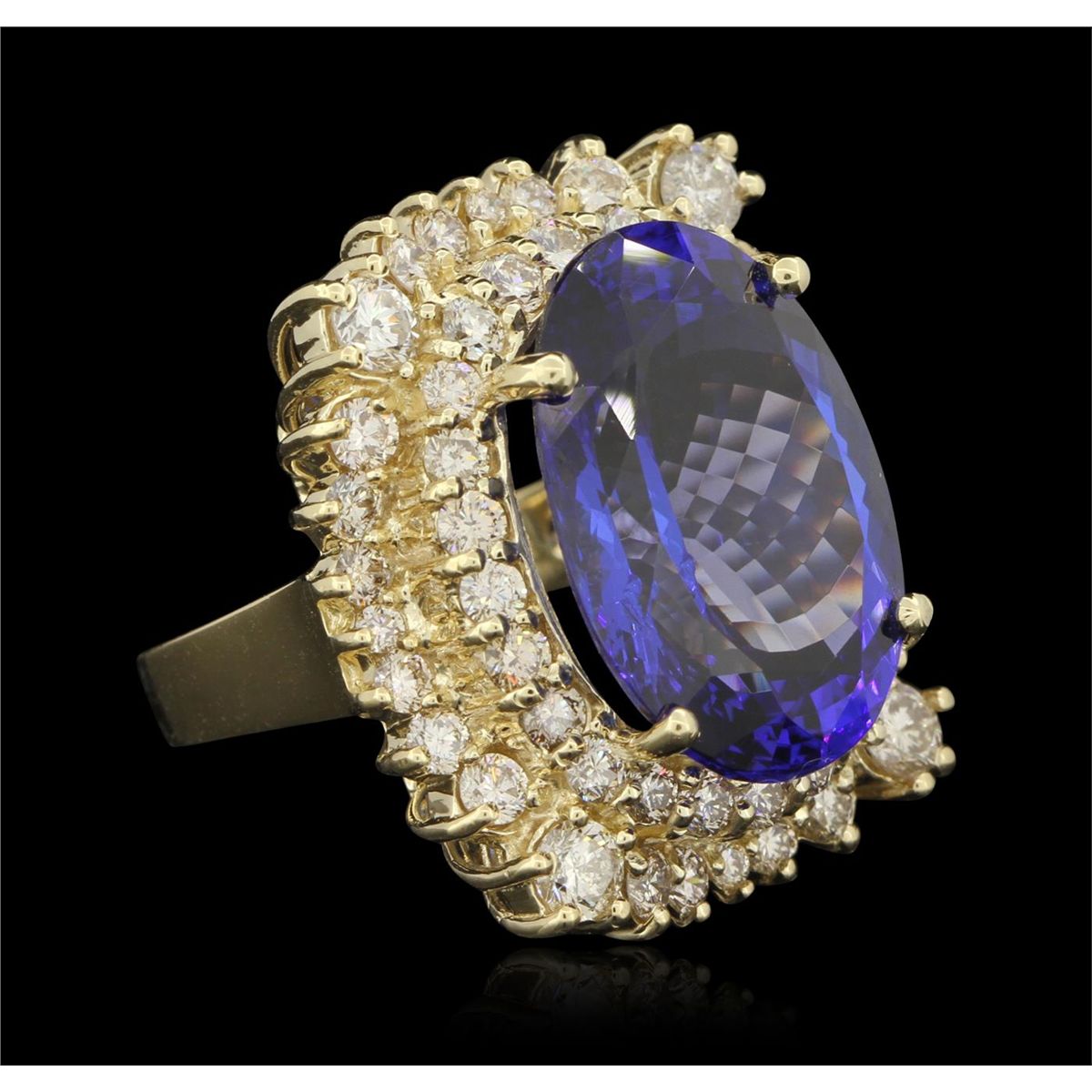 One electronically tested 14KT yellow gold ladies cast tanzanite and diamond ring with a bright polish finish. Condition is new, good workmanship. The featured tanzanite is set within a two tiered diamond lattice gallery, completed by a three and one-half millimeter wide band. Identified with markings of "K14". Containing: One prong set oval mixed cut natural tanzanite, measuring 21.43 x 15.44 x 10.07mm, exact weight 22.93ct., clarity is eye clean, type I, medium dark, moderately strong, violetish blue color, (GIA vB 6/4), cut is good. Transmitting light with no distortion, transparent. GIA Colored Stone Grading Report attached. Graded loose prior to setting in the GIA Laboratory, Report # 2151634358 Tanzanite is a very rare gemstone that is only found in the country of Tanzania. Originally discovered in 1967. Tiffany & Company, named the stone Tanzanite. It is found in the Usumburu Mountains that border the Umba Valley of northern Tanzania. Tanzanite occurs in gray, brown, violet, blue, reddish-purple, & green. The gem is interesting because of its exceptional pleochroism. Rotated in different directions a tanzanite will exhibit multiple changes of color. Tanzanite has a low tolerance to ultrasonic cleaning, and should not be cleaned using this method. Fifty-two prong set round brilliant cut diamonds, measuring 3.90 - 1.90 x 1.74mm (depth est.) approximate total weight of 52 Stones = 4.28ct. Graded in the setting. Clarity VS-1 to SI-1. Color K - M. Total Weight of Colored Stones 22.93ct. Total Weight of Diamonds 4.28ct. Total Weight of Ring 21.80gm. AIG Appraised at $73,110.00.