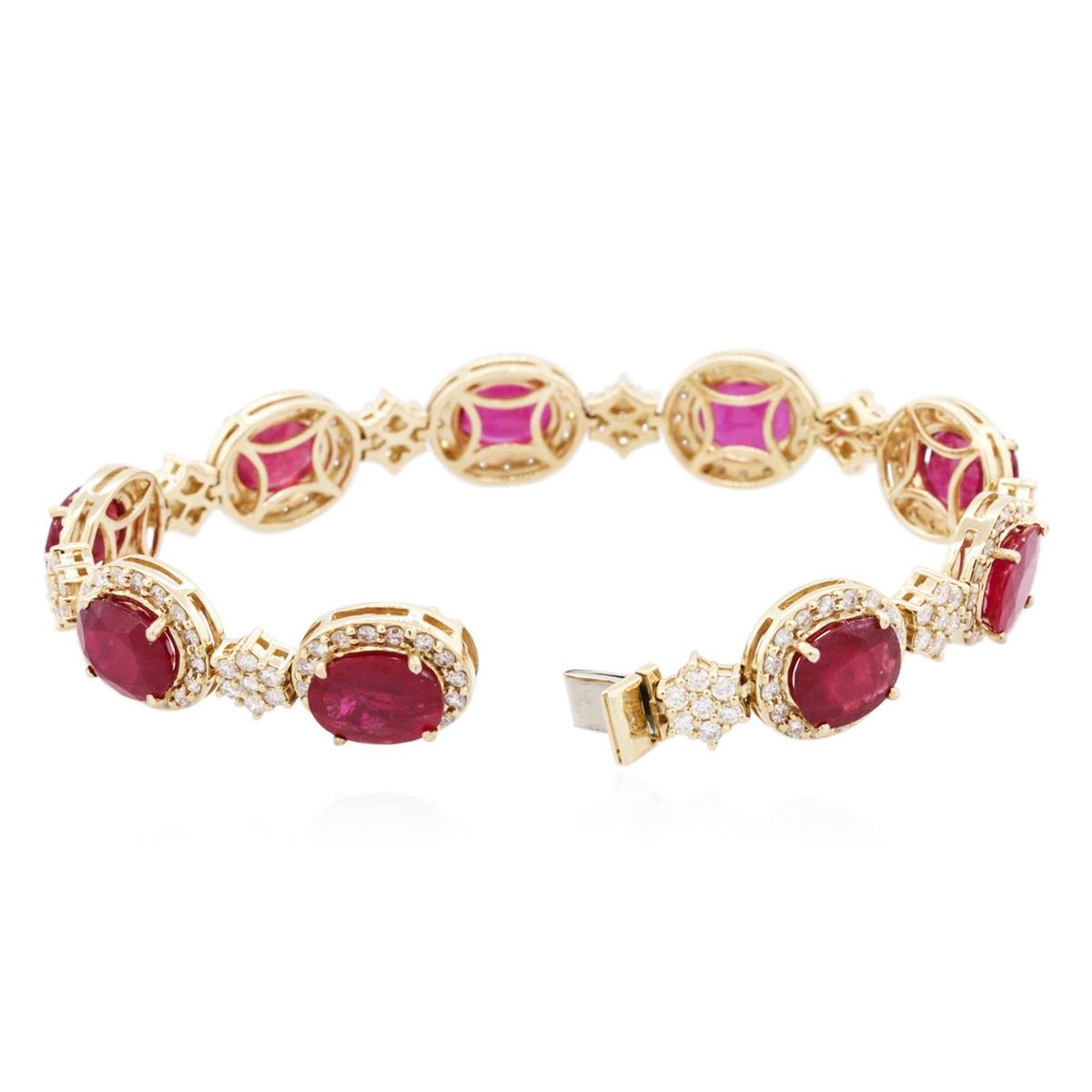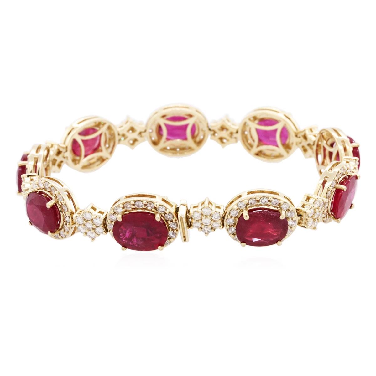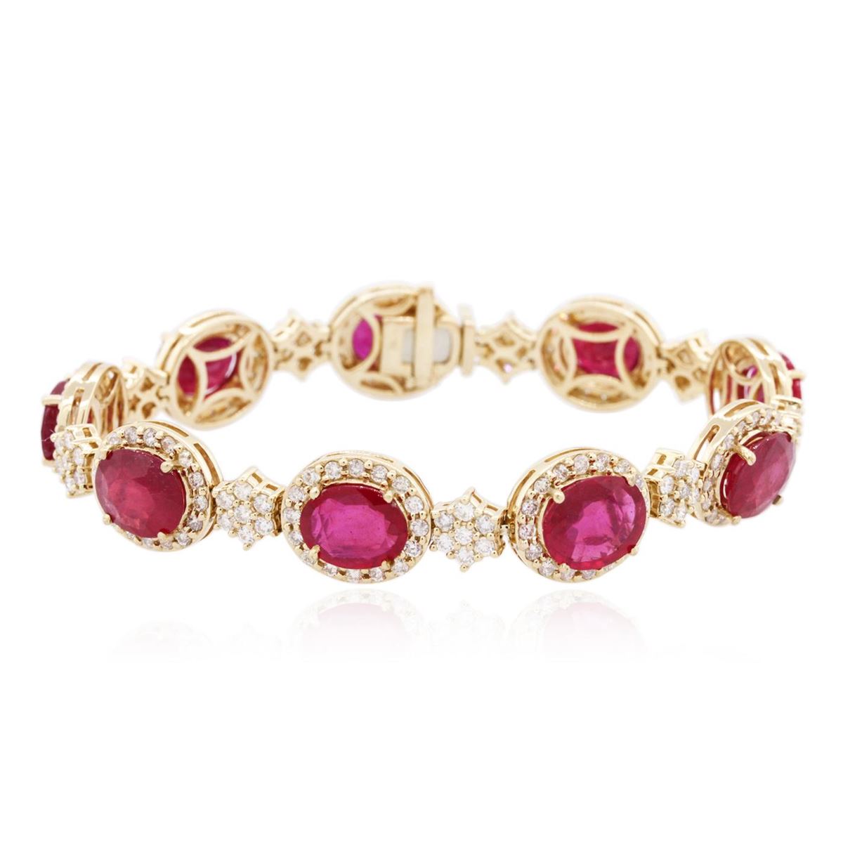 One electronically tested 14KT yellow gold ladies combination cast & assembled ruby and diamond bracelet with a hidden box clasp with safety closer with a bright polish finish. Measurements: 7.25" in length. Identified with markings of "14K". Condition is new. Containing: Nine prong set oval modified brilliant cut natural rubies, measuring 9.91 x 8.07 x 3.94mm, approximate total weight of 22.95ct., clarity is heavily included, type II, medium, moderately strong, strongly purplish red color, (GIA stpR 5/4), cut is very good. Two Hundred Seven prong set round brilliant cut diamonds, measuring 1.60 - 1.30 x 0.87mm (depth est.) approximate total weight of 207 Stones = 2.30ct. Clarity: SI-2 to I-2. Color: H - I, Cut is Good. Colored gemstones are presumed to have been subjected to commonly used enhancement processes. All diamonds and colored gemstones are graded in the mounting, unless otherwise stated. Total Weight of Colored Stones 22.95ct. Total Weight of Diamonds 2.30ct. Total Weight of Bracelet 29.90 grams. GGL Appraised at $22,300.00.